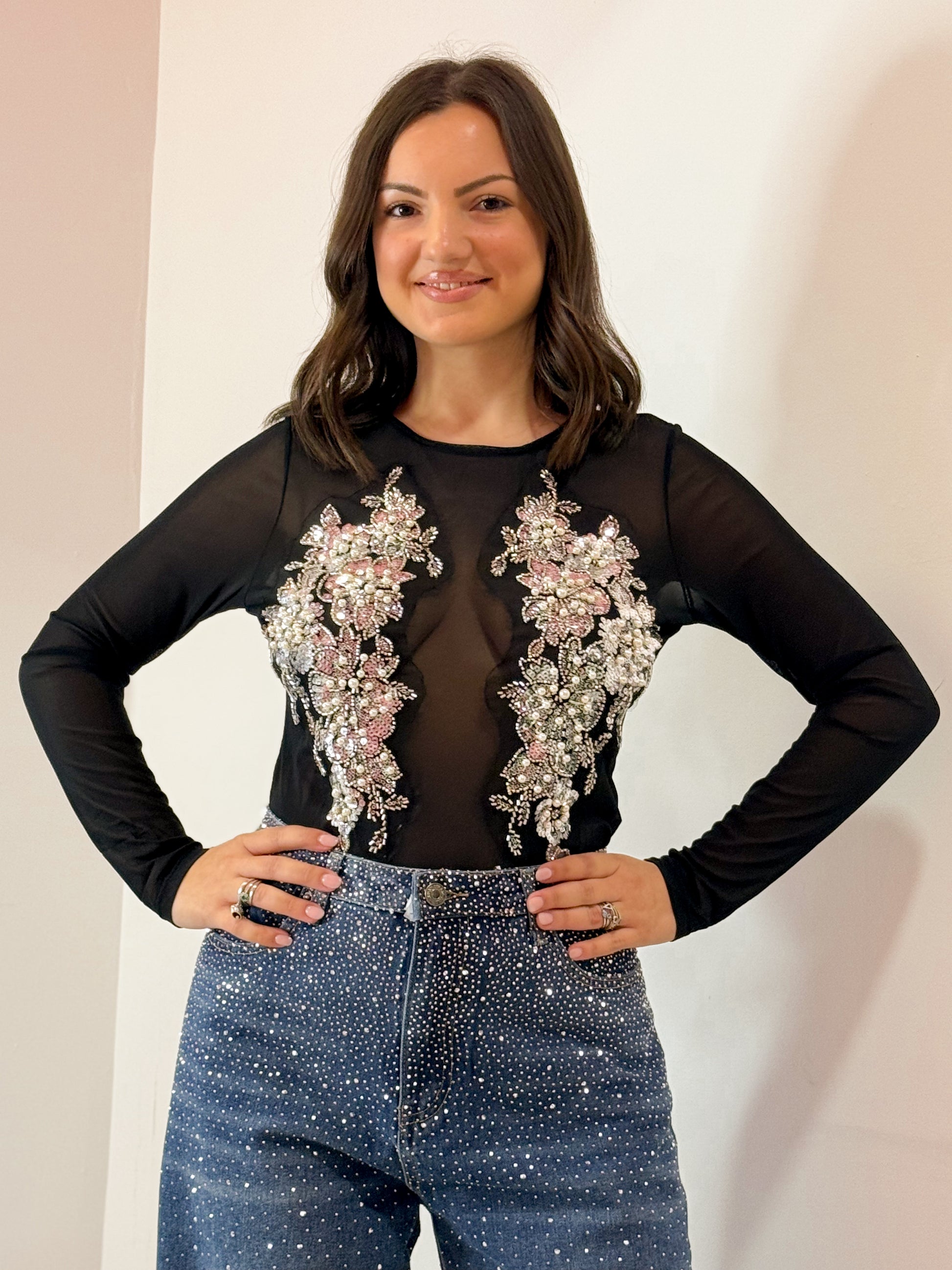 BODY VELATO CON APPLICAZIONI DI PERLE E STRASS CHE RICOPRONO IL SENO , TAGLIA UNICA , VESTE MAX 42