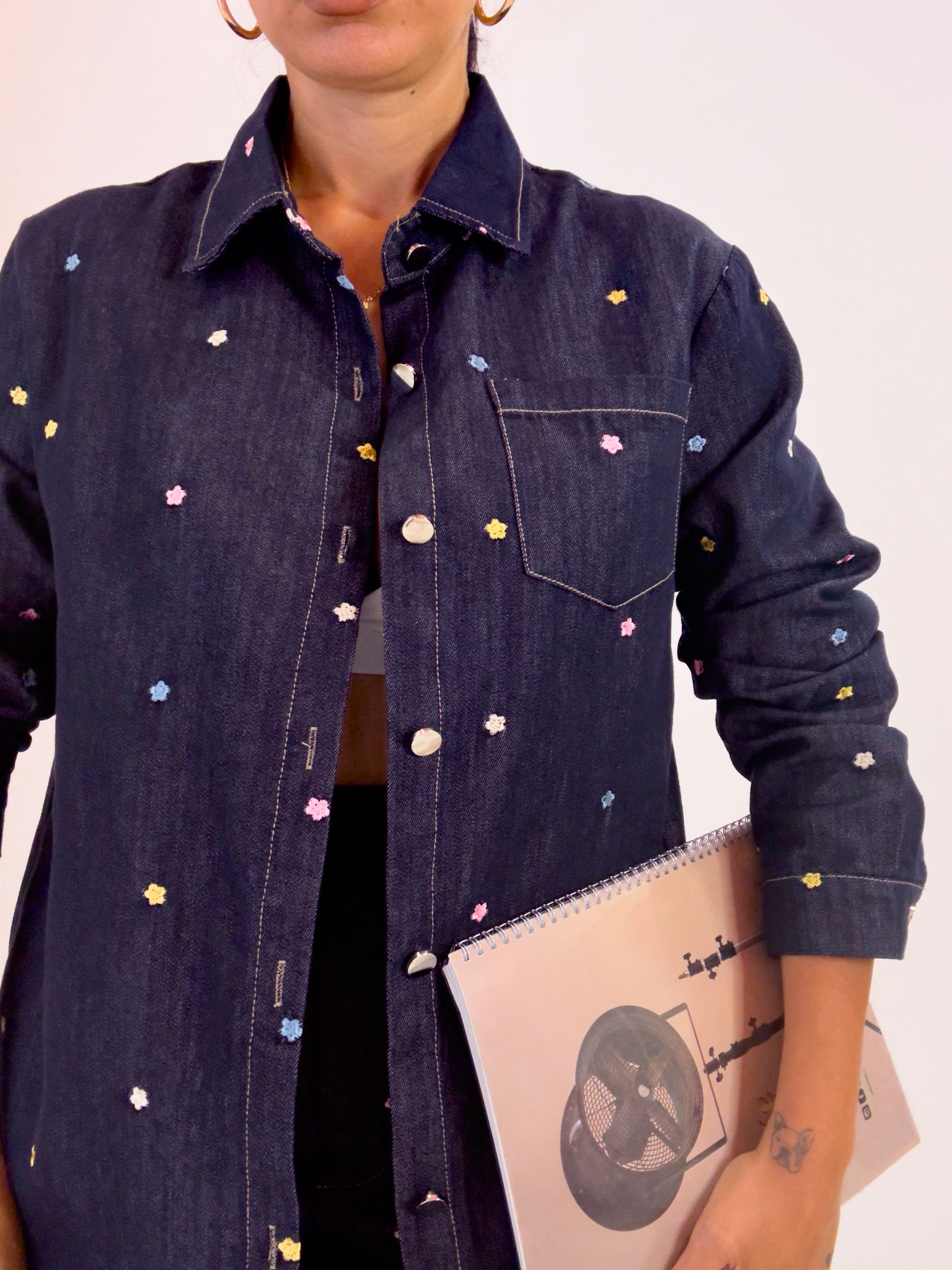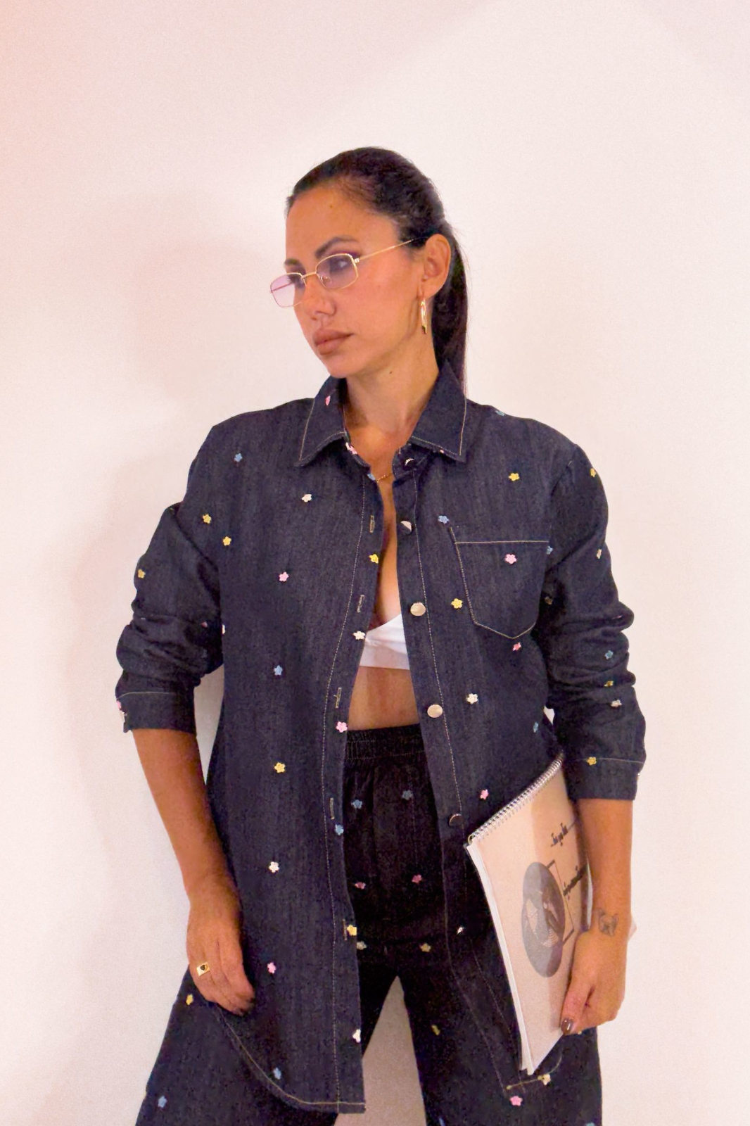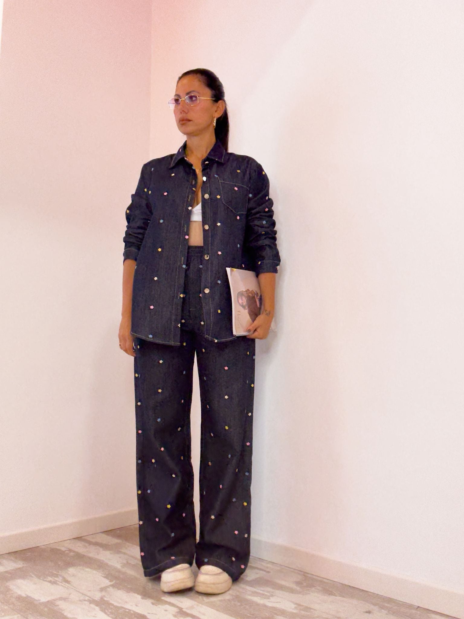 sia camicia che pantalone riportano fiorellini colorati ricamati