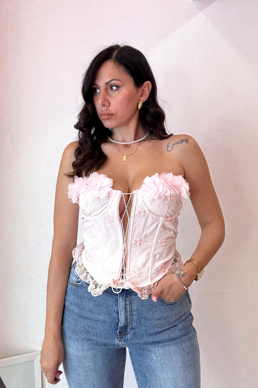 Corsetto con fiori sulla scollatura e merletto sul fondo. Chiusura con lacci sul fronte. In foto una M.
