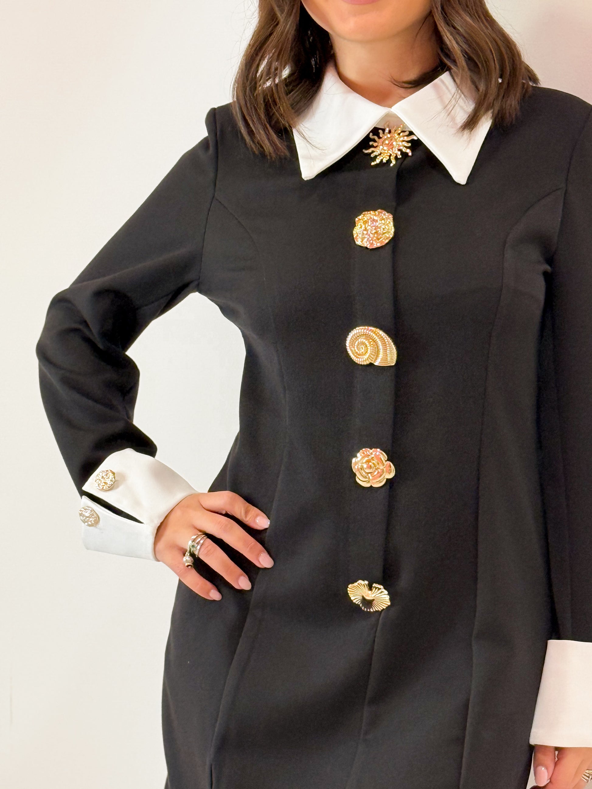 VESTITO MODELLO SCAMICIATA CON FINTO EFFETTO CAMICIA , I BOTTONI IN COLOR ORO TUTTI DIVERSI TRA LORO SONO SOLO DECORATIVI , CHIUSURA CON ZIP SUL RETRO ,