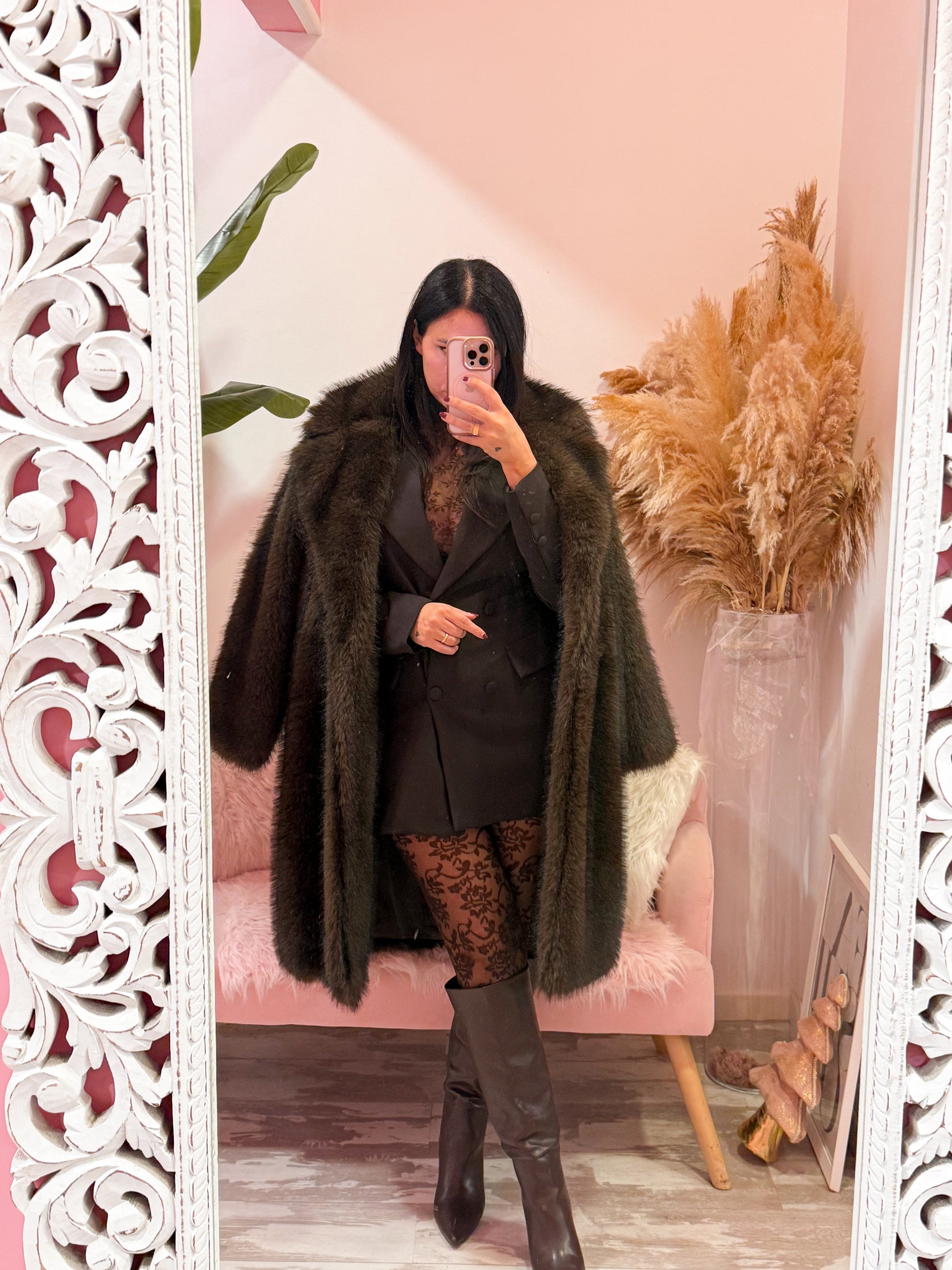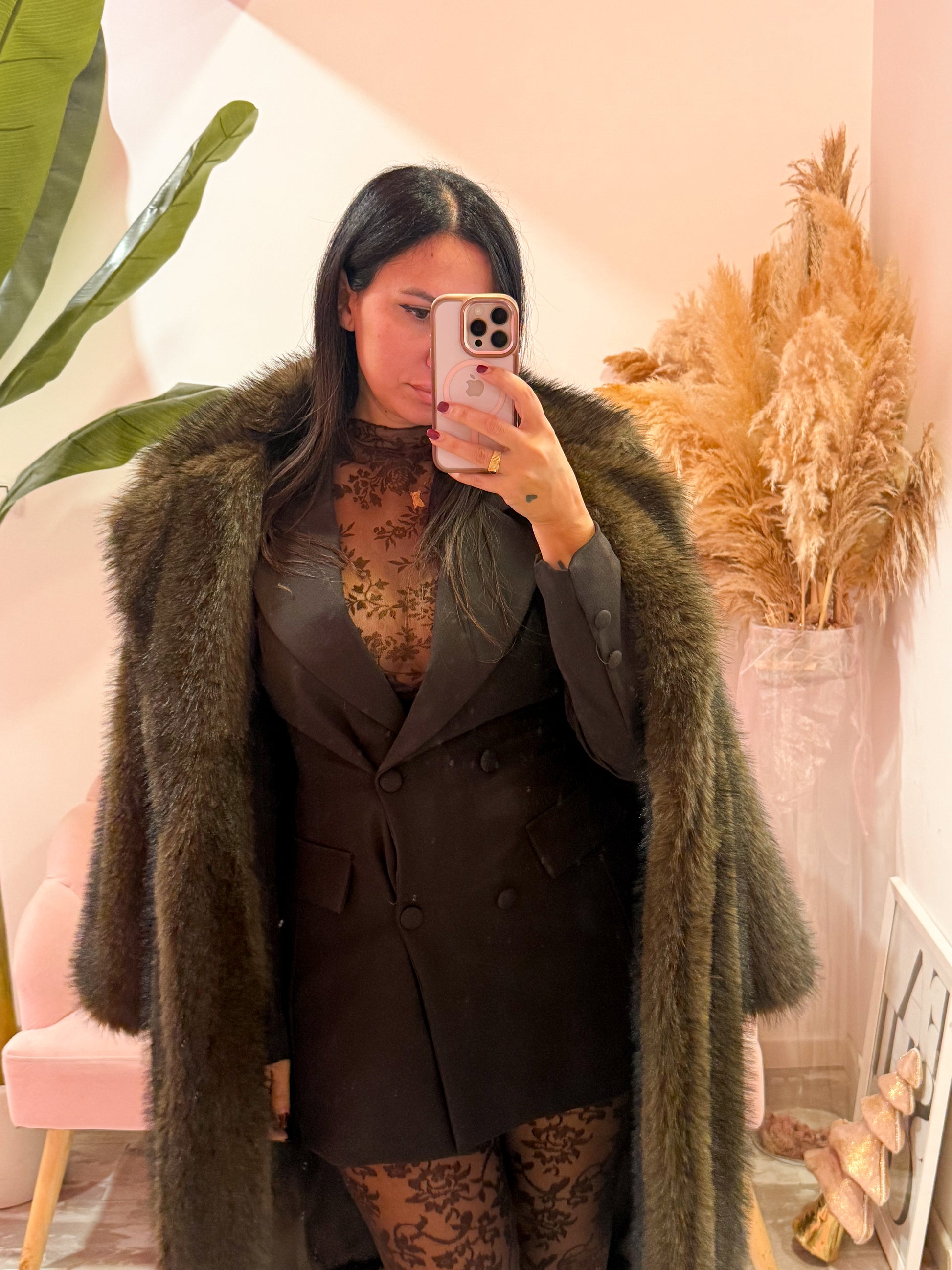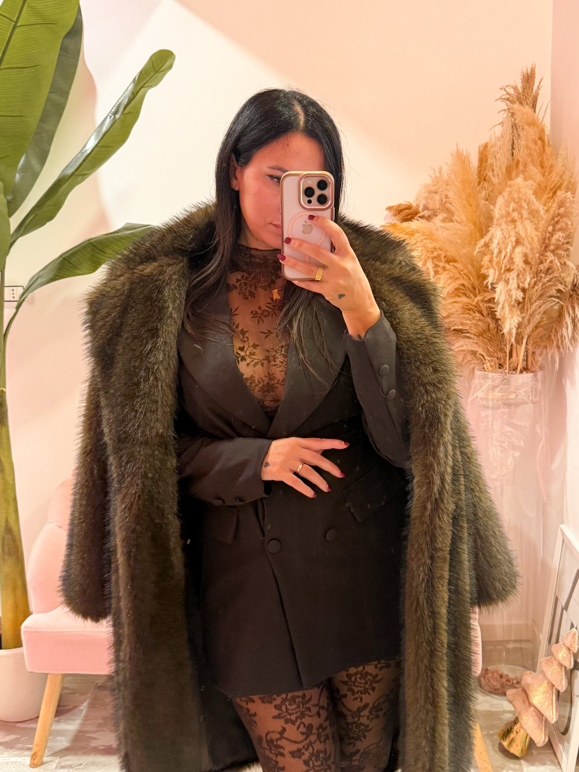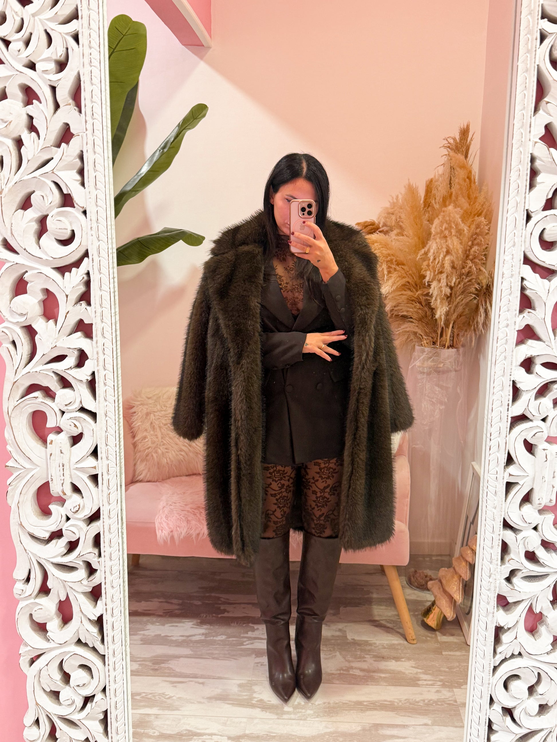 ECOPELLICCIA MODELLO LUNGO ,CON FUSCIACCA PER SEGNARE IL PUNTO VITA , FODERATA ALL'INTERNO CHIUSURA CON GANCI VESTE FINO L