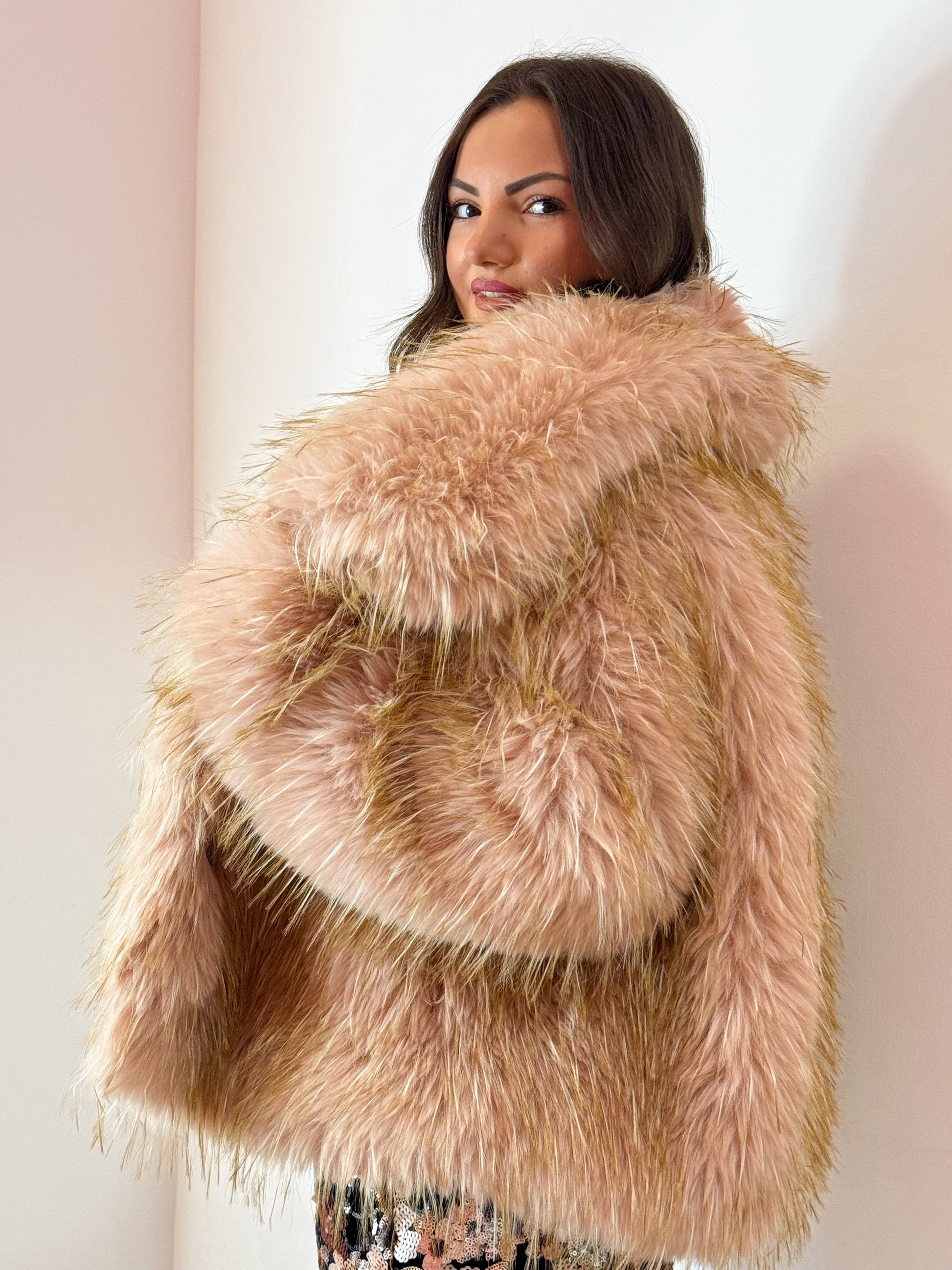 ECOPELLICCIA ROSA CON SFUMATURE BEIGE ALL'INTERNO , COLLO GRANDE , LUNGHEZZA BASIC , FODERATA ALL'INTERNO TAGLIA UNICA VESTE FINO UNA L