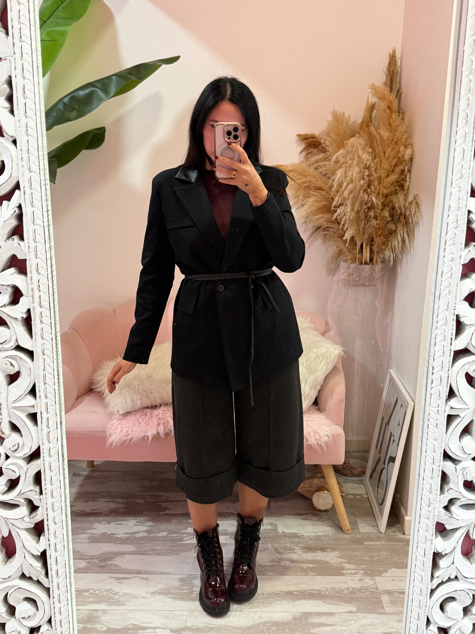GIACCA DOPPIOPETTO CON LACCETTO IN VITA E BAVERO NELLA PARTE SUPERIORE IN EFFETTO SIMILPELLE TAGLIA UNICA , FODERATA ALL'INTERNO E SPALLINE IMBOTTITE