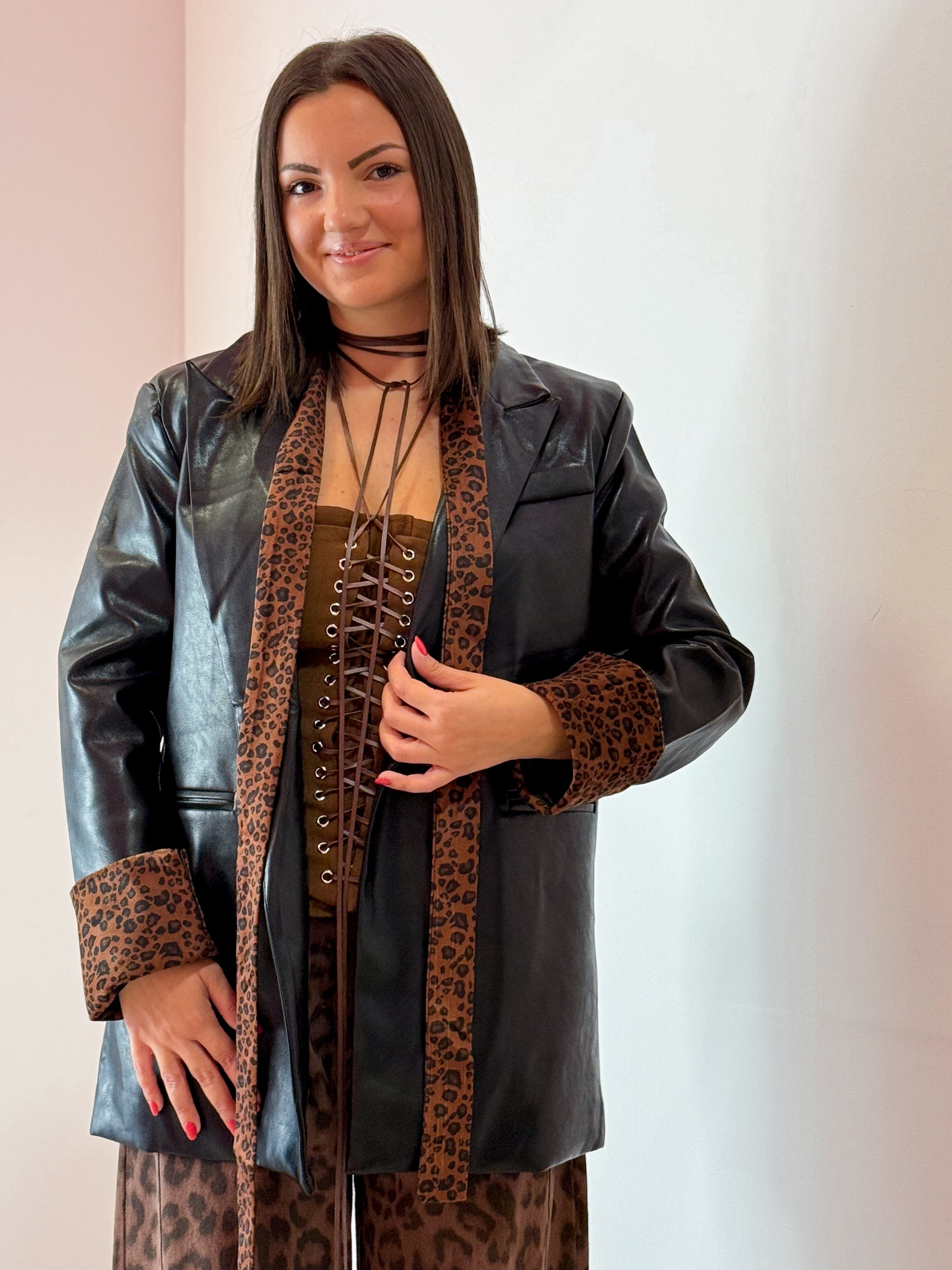 GIACCA IN SIMILPELLE CON RISVOLTI DELLE MANICHE IN STAMPA MACULATA, PRESENTA UNA FUSCIACCA DA METTERE IN VITA ANCH ESSA MACULATA