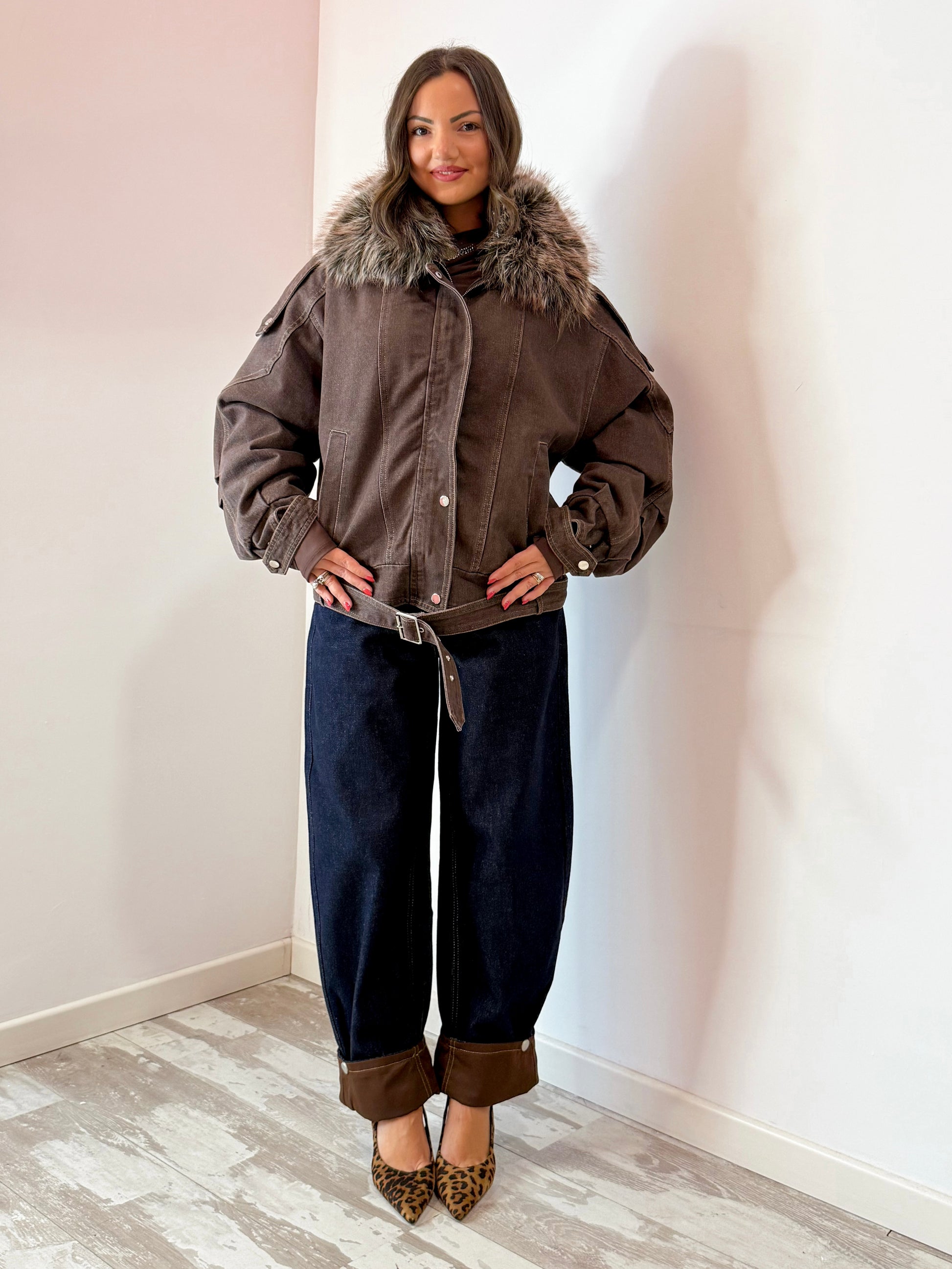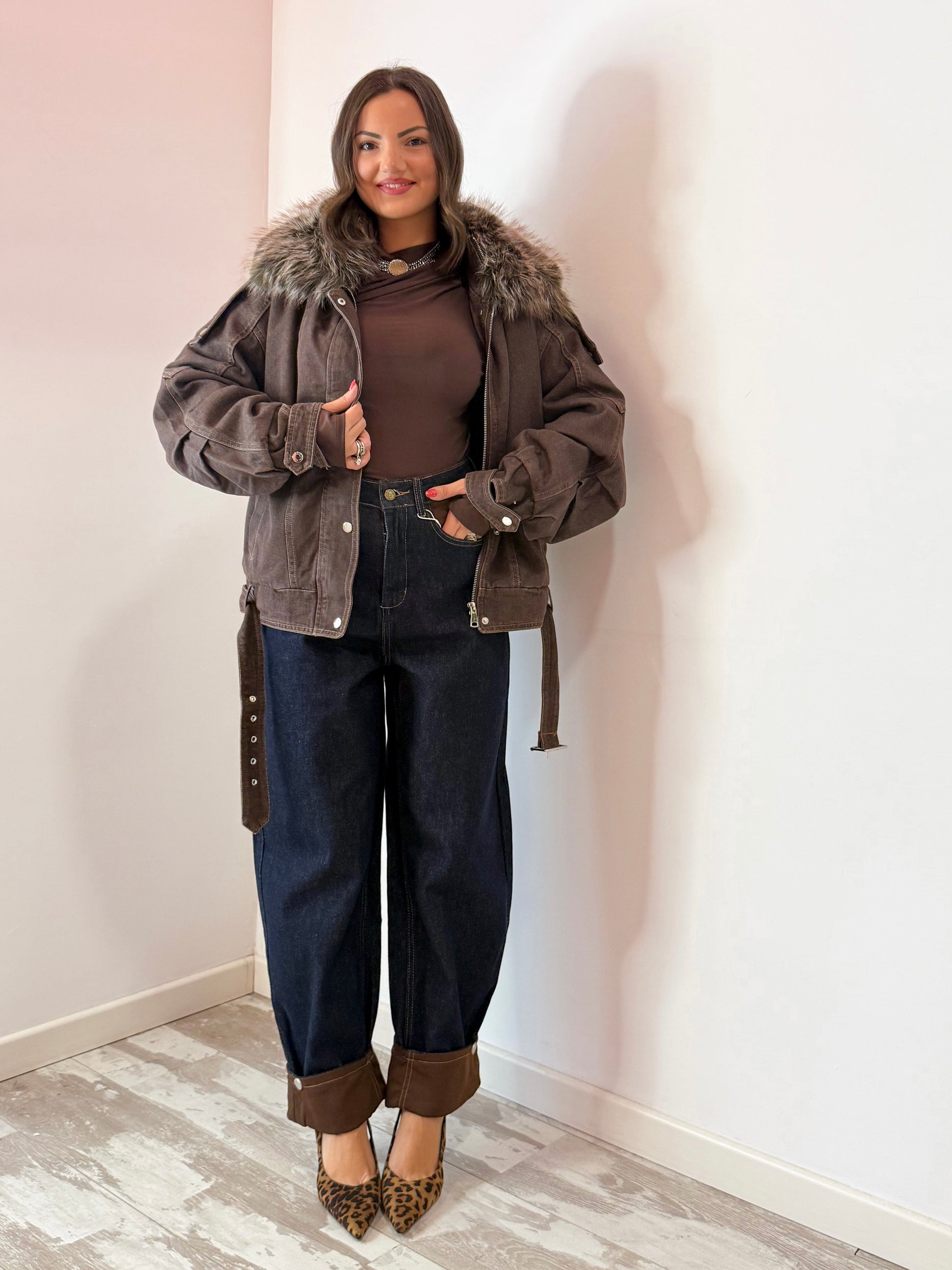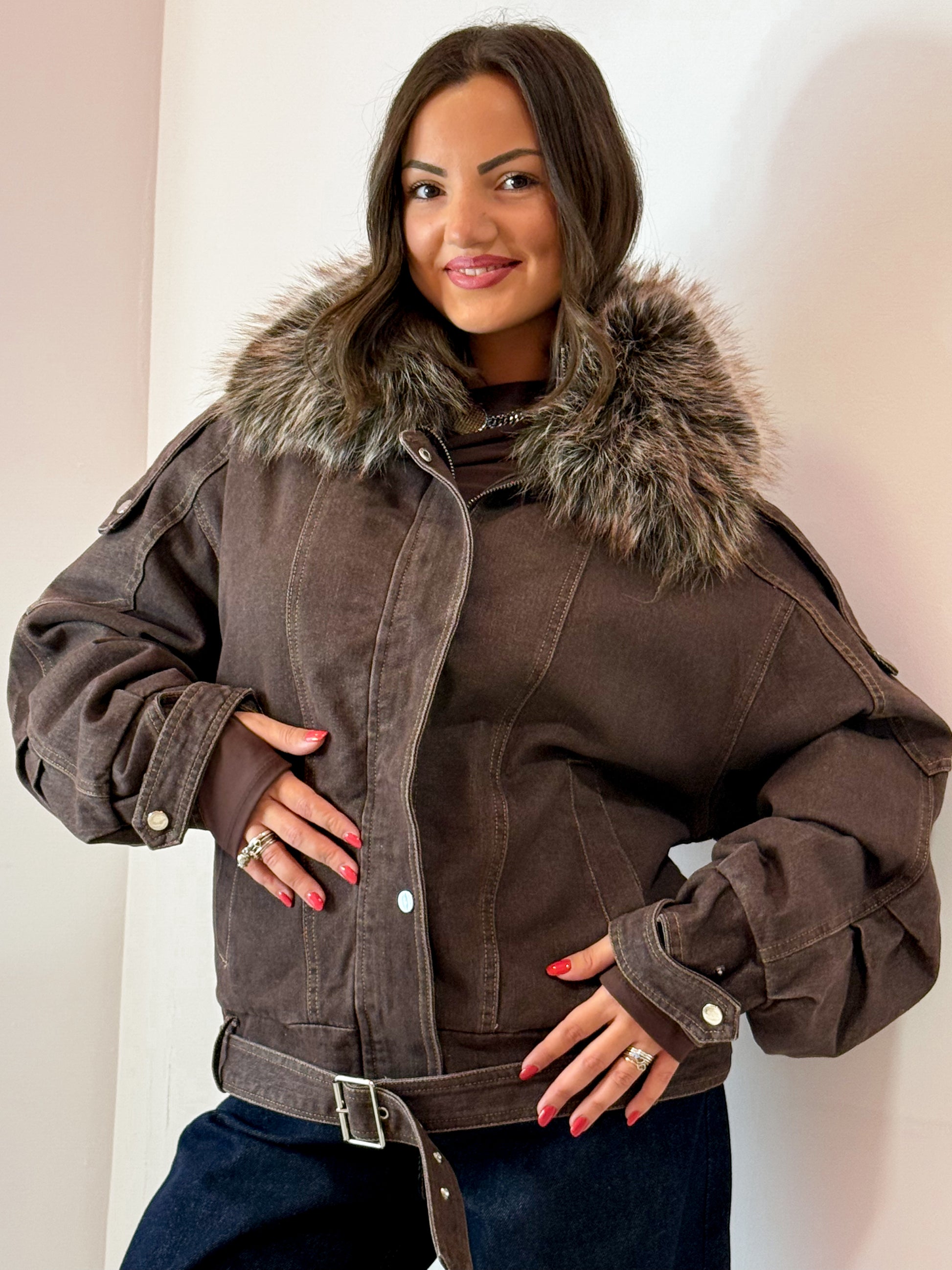 GIACCONE IN JEANS MODELLO LEGGERMENTE OVER , PELLICCIA INTERNA , CHIUSURA CON ZIP E CIAPPETTE , PORTA IL COLLO DI ECOPELLICCIA REMOVIBILE