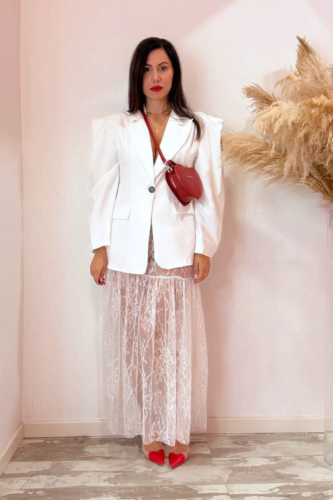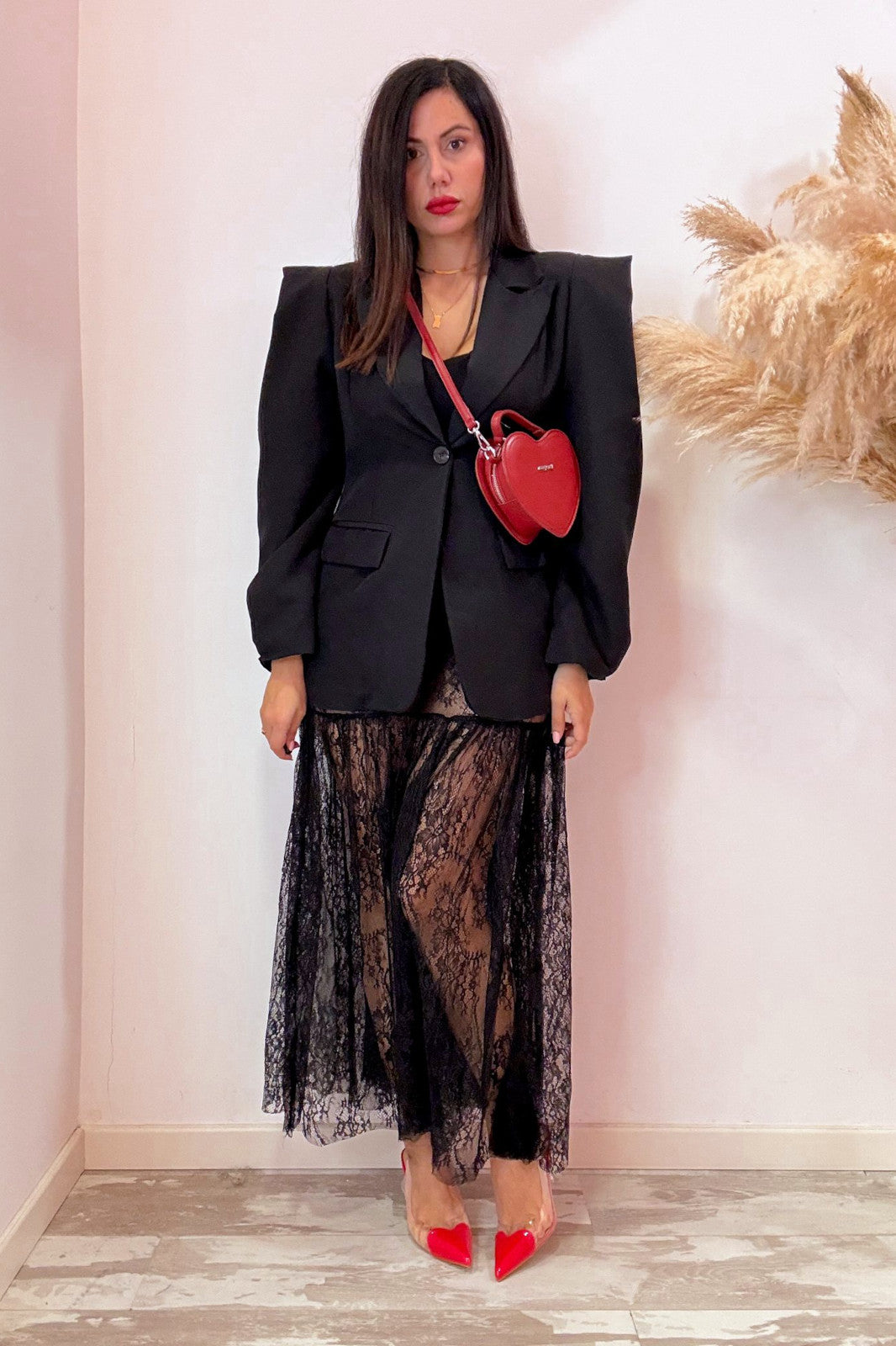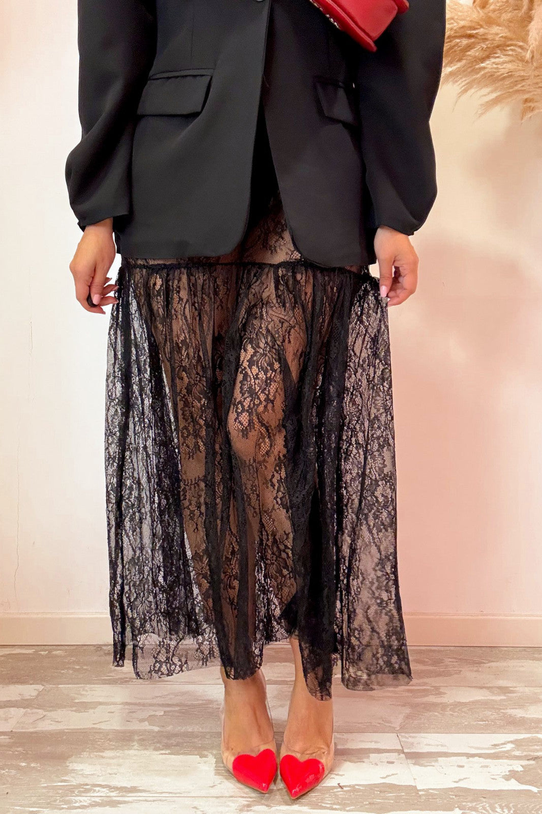 Gonna trasparente in pizzo con elastico in vita e balza sul fondo. Taglia unica, vestibilità massima una 44.