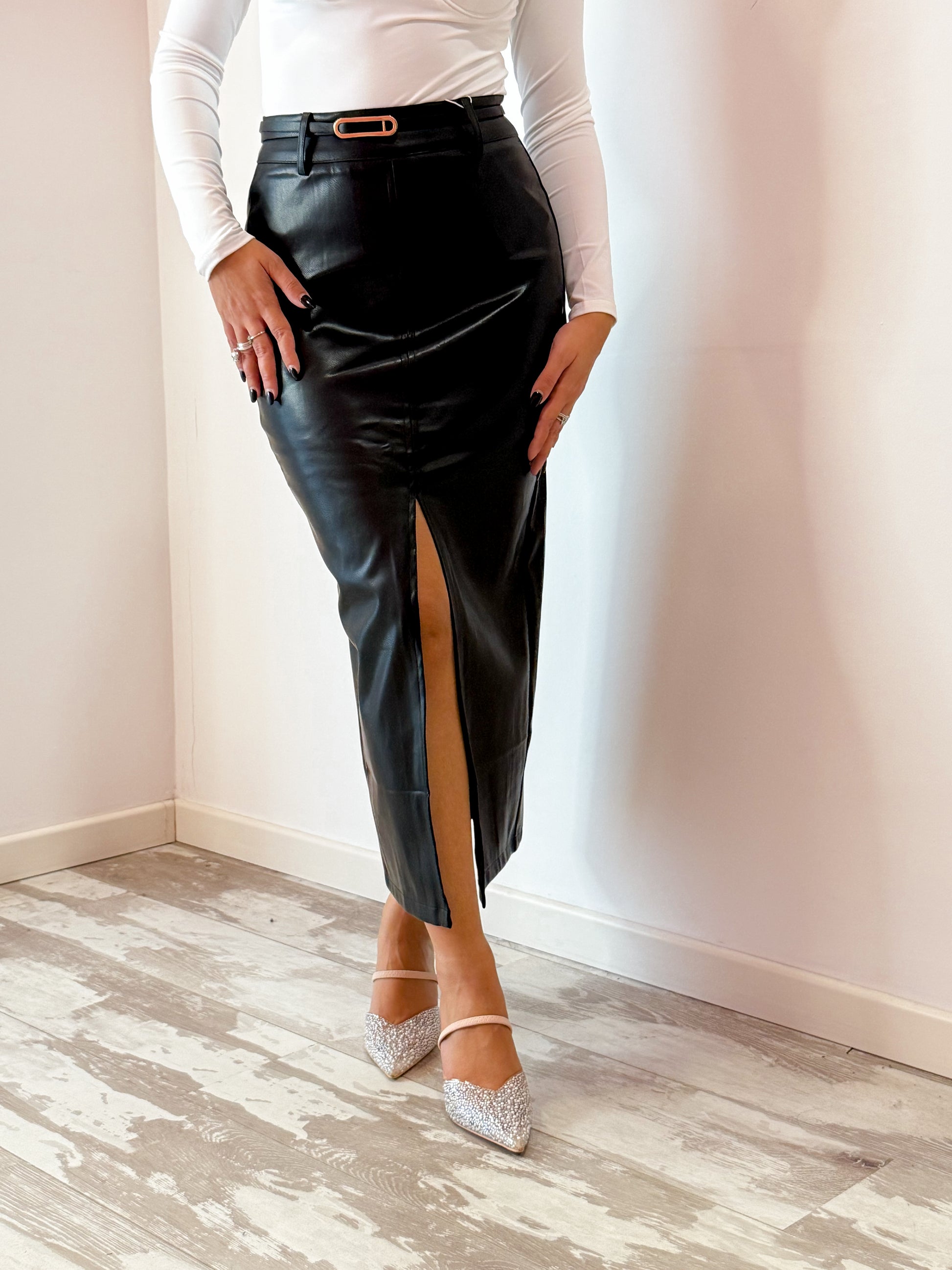 GONNA MIDI IN SIMILPELLE CON CINTURINO INCLUSO , SPACCHETTO SULLA PARTE DAVANTI , VESTE REGOLARE