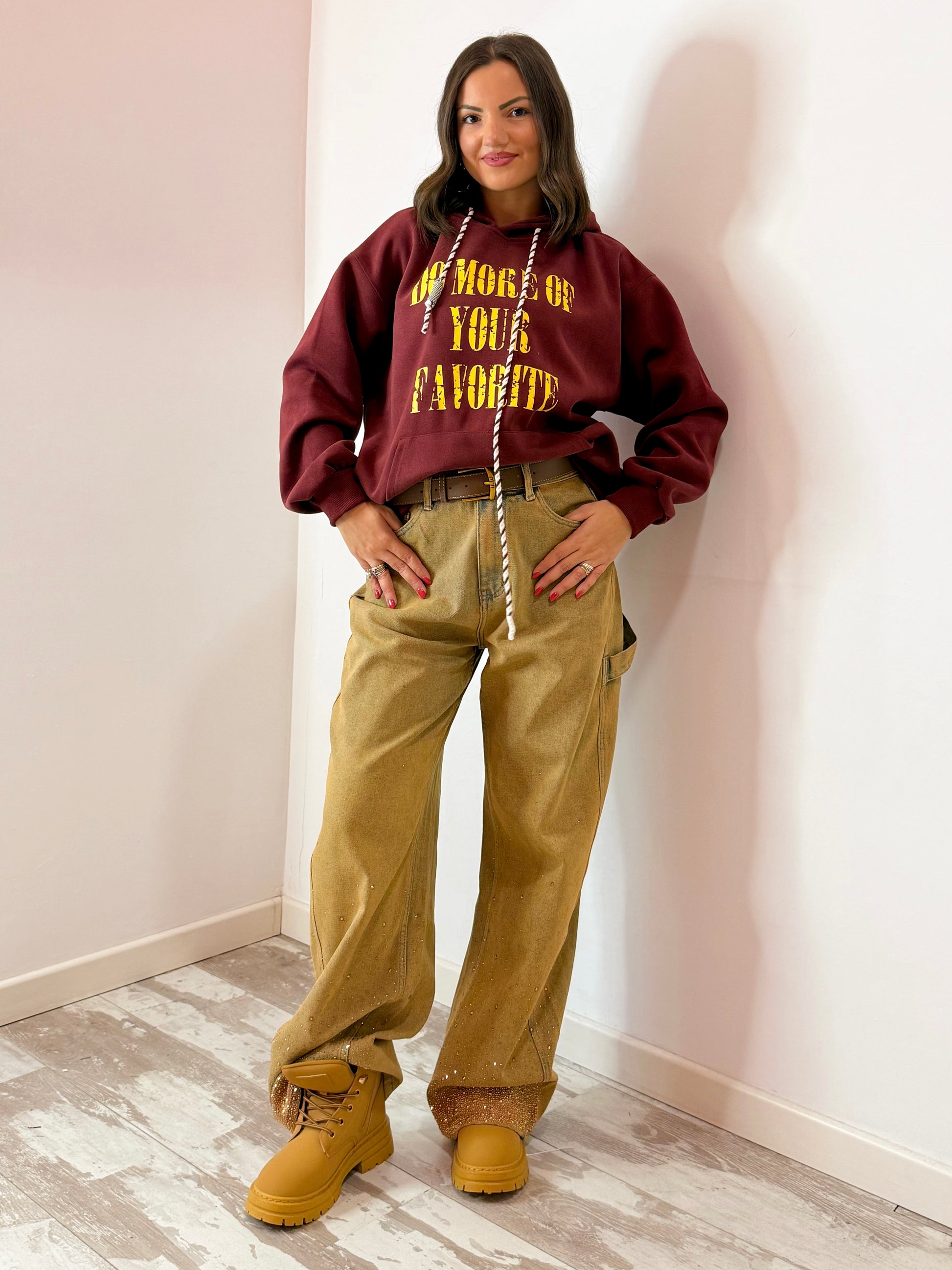 JEANS DAL COLOR PARTICOLARE , VITA ALTA MODELLO PALAZZO CON BRILLANTINI SUL FONDO TONO SU TONO , COMPRENSIVO DI CINTURA