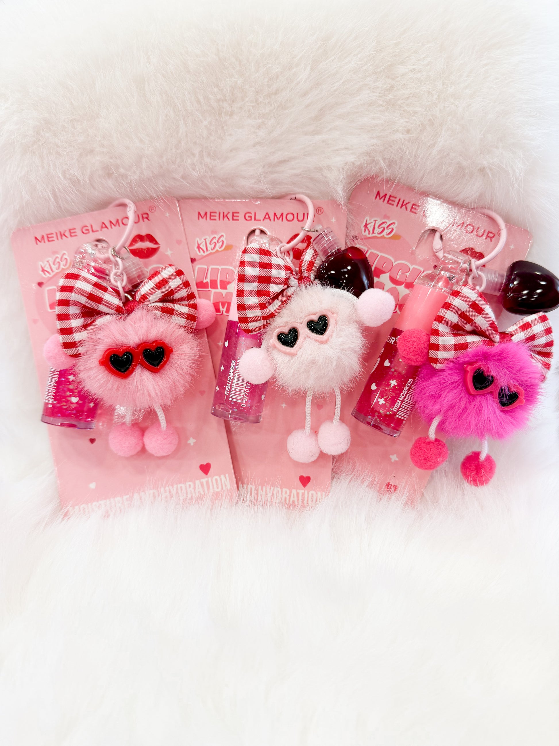 SIMPATICI LUCIDALABBRA DA BORSETTA CON CIONDOLINO PONPON E CUORICINO CON TINTA LABBRA ROSSA