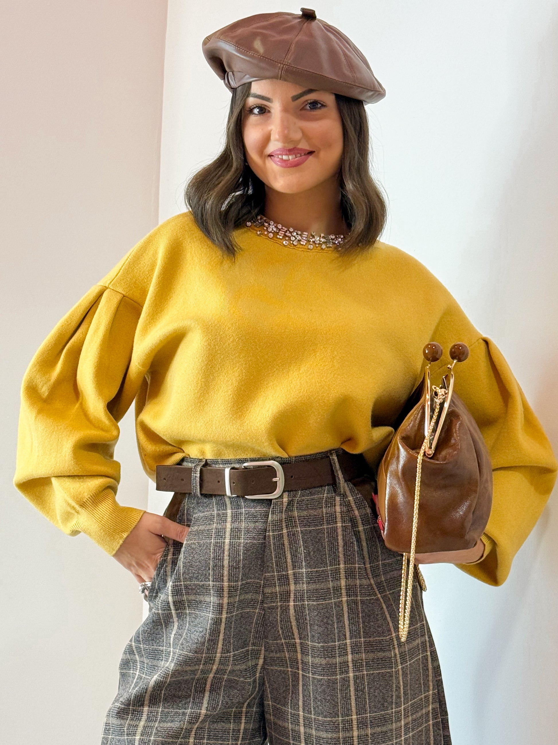 MAGLIONCINO CON APPLICAZIONI DI STRASS CUCITI SUL GIROCOLLO, LUNGHEZZA BASIC E MANICHE A SBUFFO