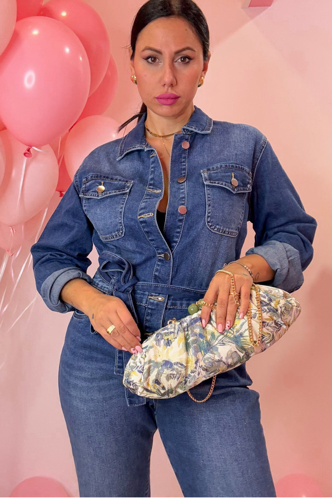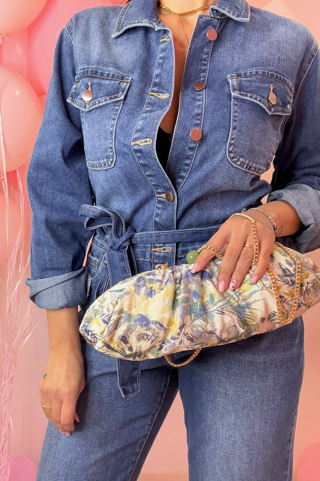 Borsa modello clutch a fantasia con tracolla in catenina color oro inclusa.