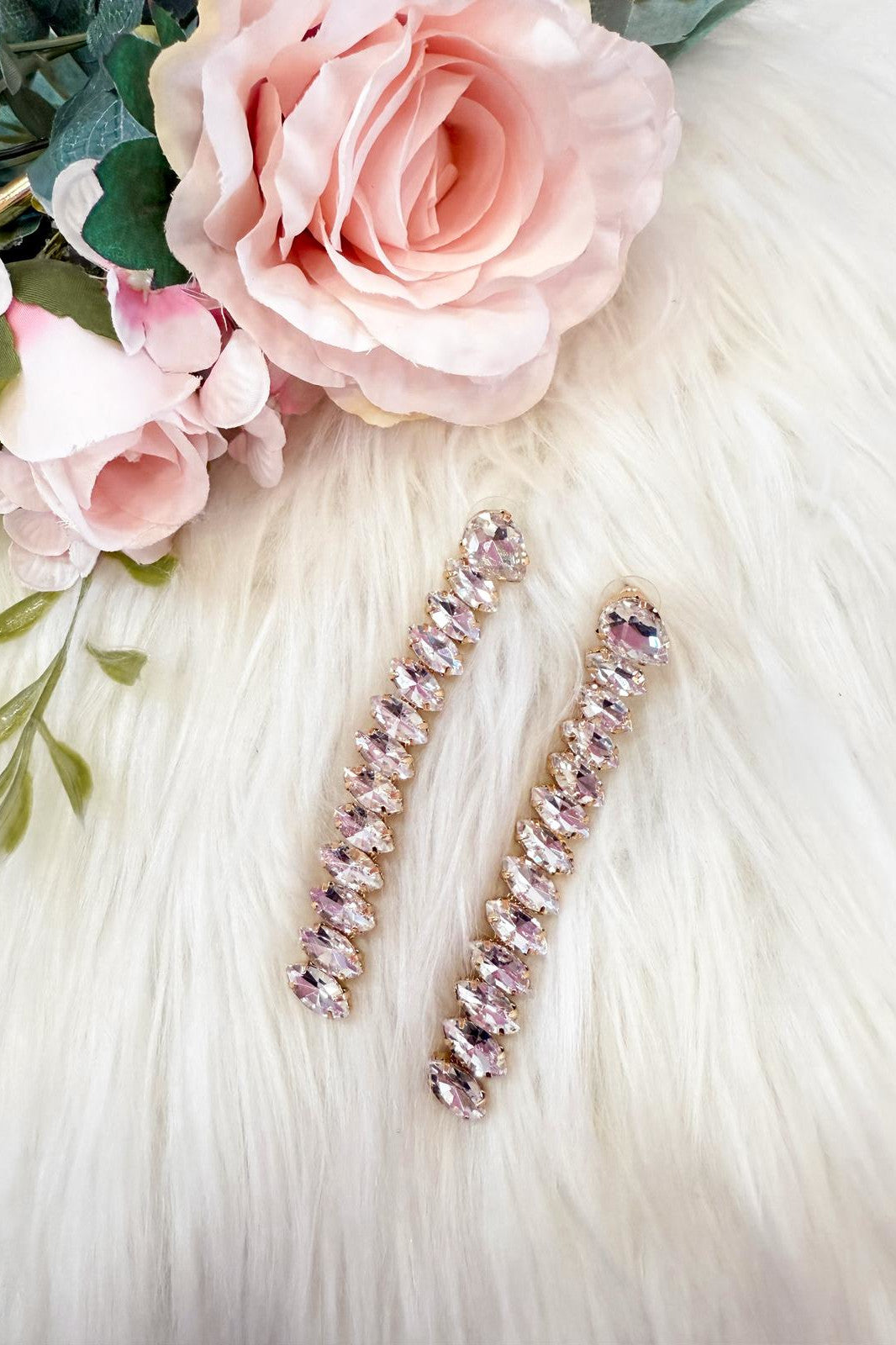 Orecchini lunghi base oro con pietre luccicose. Eleganti per i tuoi look.