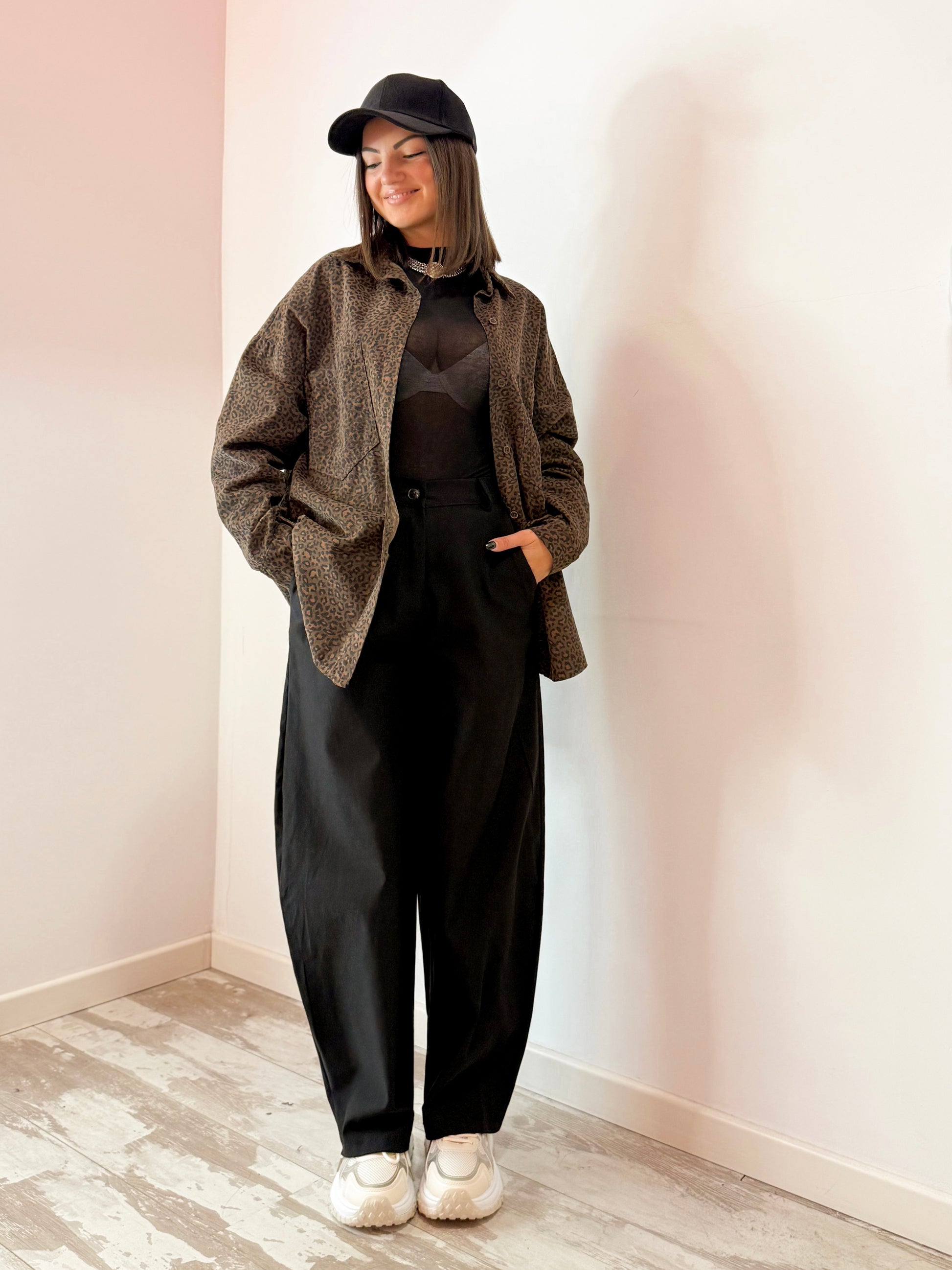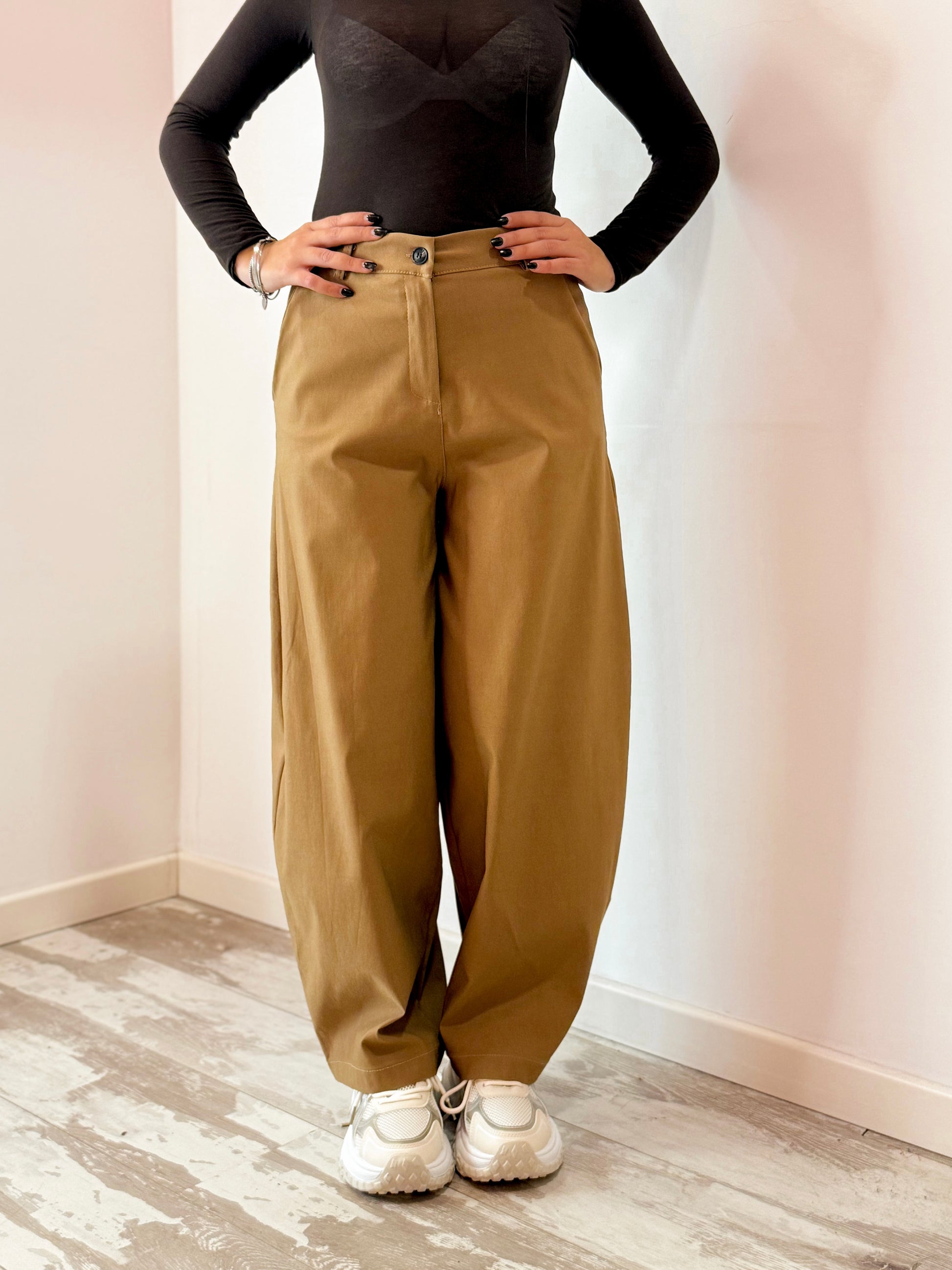 PANTALONI IN POLIESTERE MODELLO LEGGERMENTE BALLON , BOTTONCINO , ZIP AVANTI E MOLLA SUL RETRO