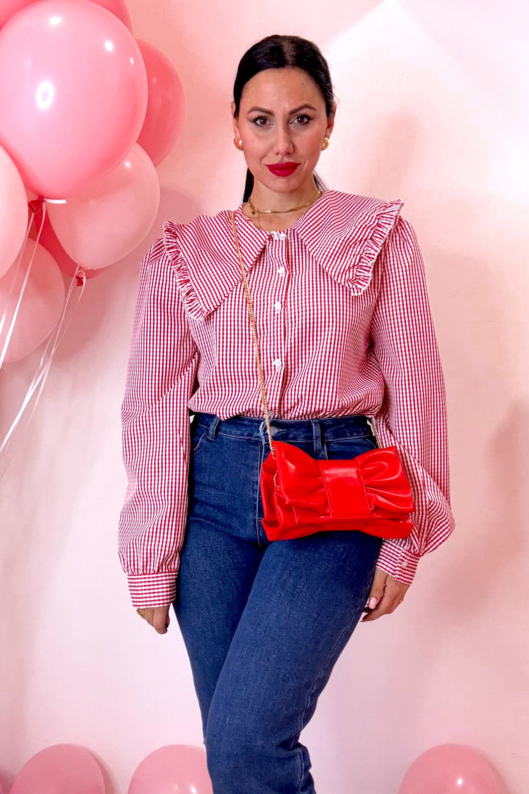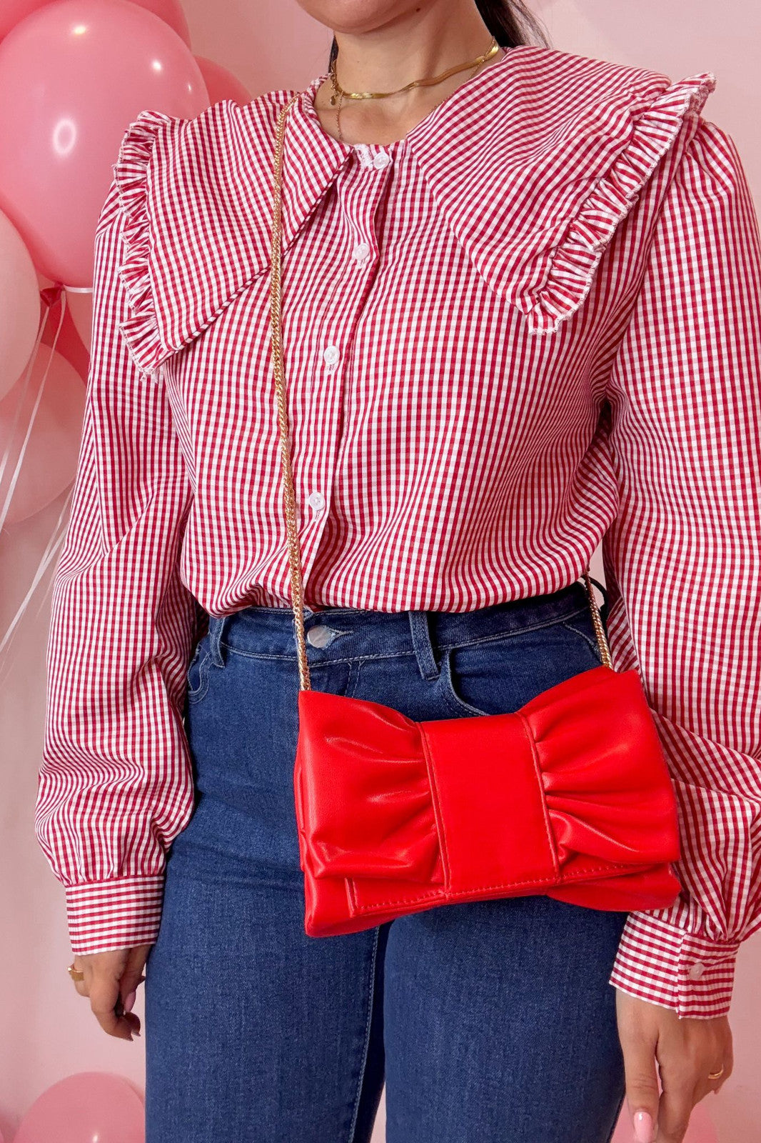 Pochette a forma di fiocco, chiusura a clip. Tracolla a catenina color oro.