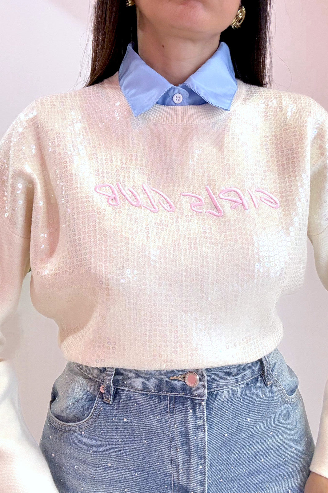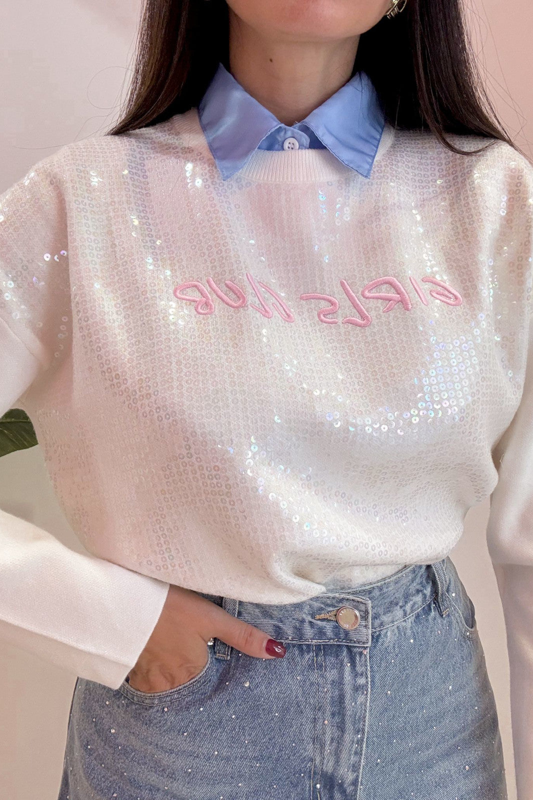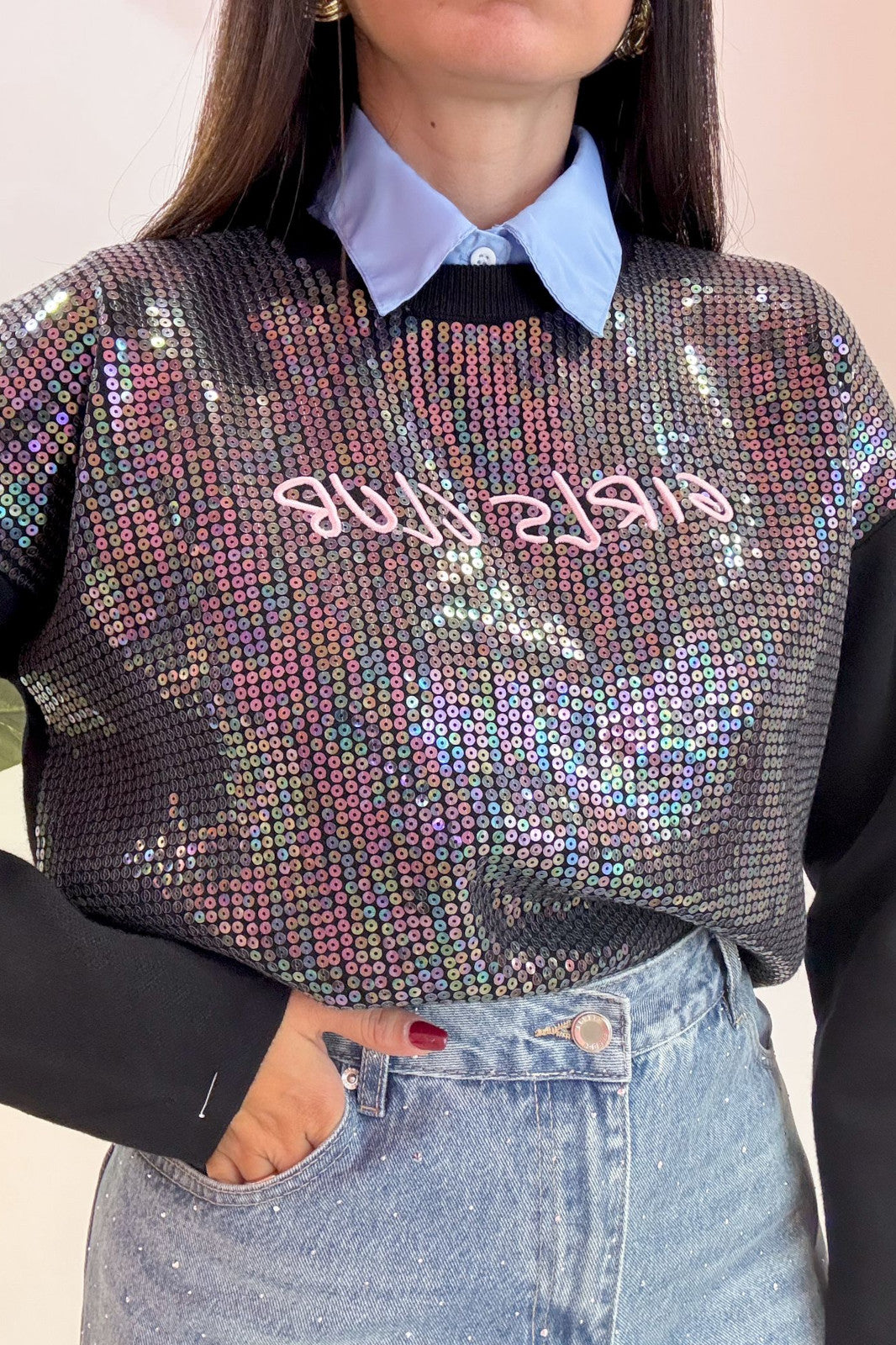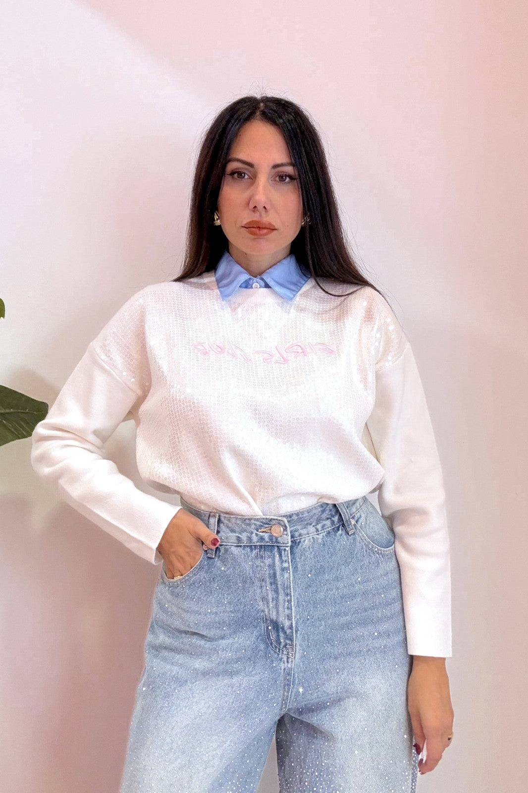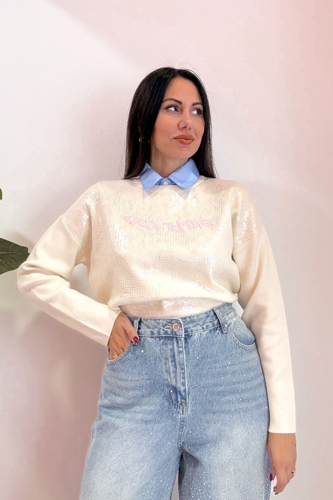 Pull lunghezza basic con paillettes boreali sul fronte e scritta ricamata. Taglia unica. Il colletto camicia non fa parte del maglione