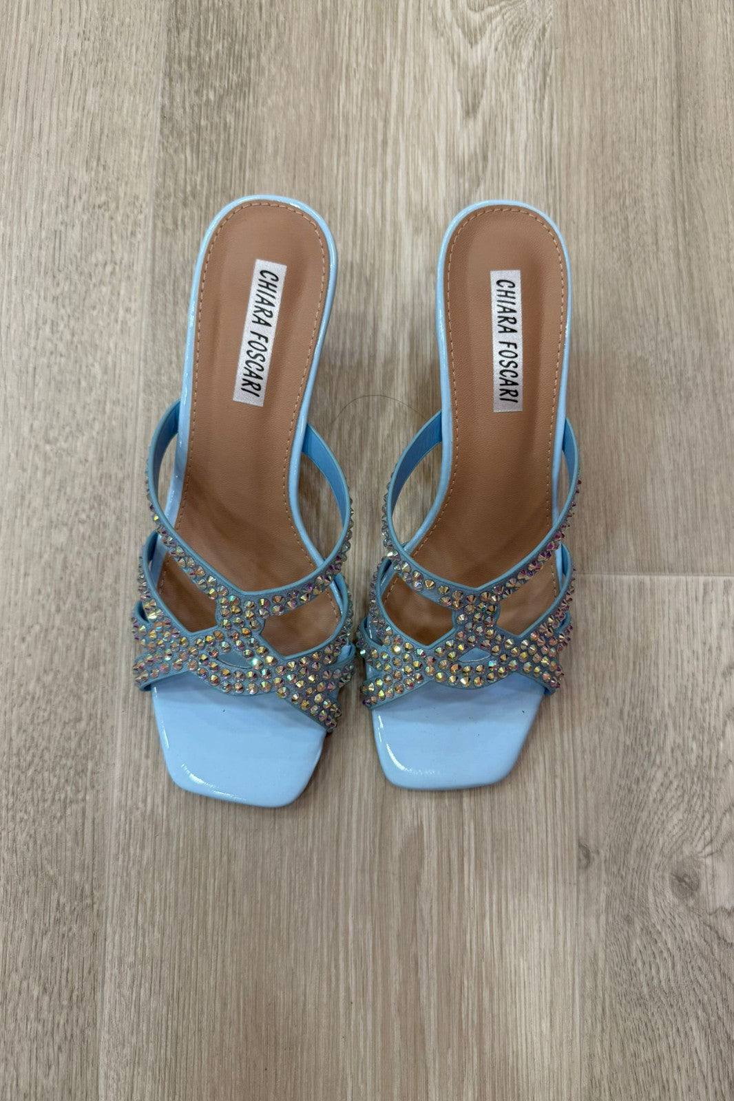 Scarpe modello sabot con piccolo tacco e incrocio brillantinato. Calzatura regolare.