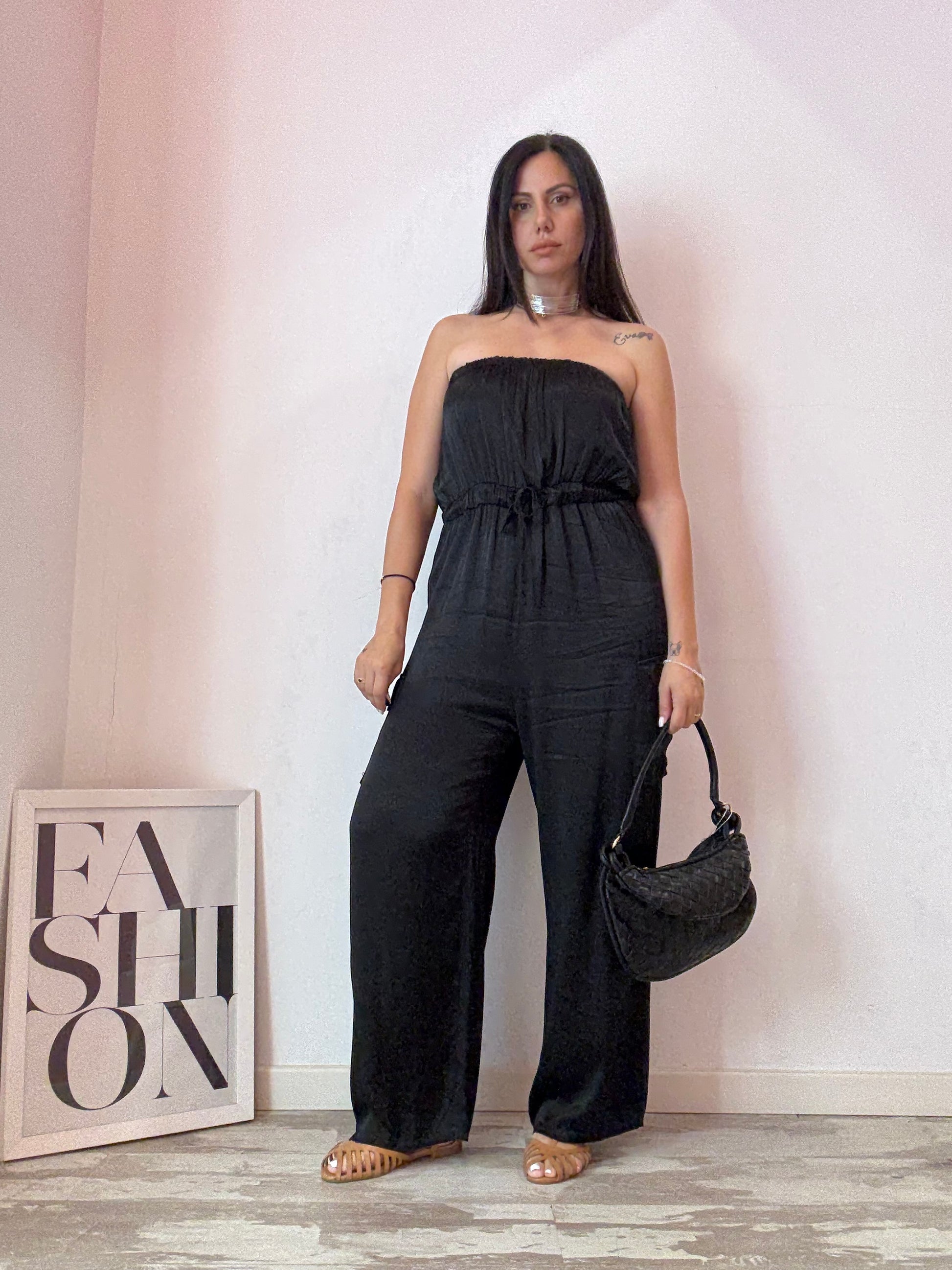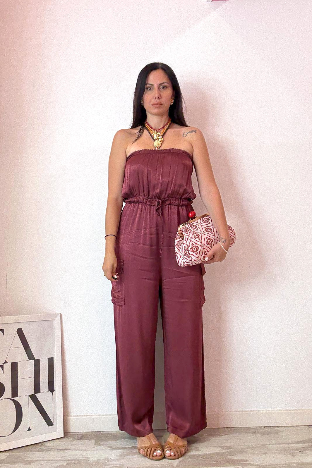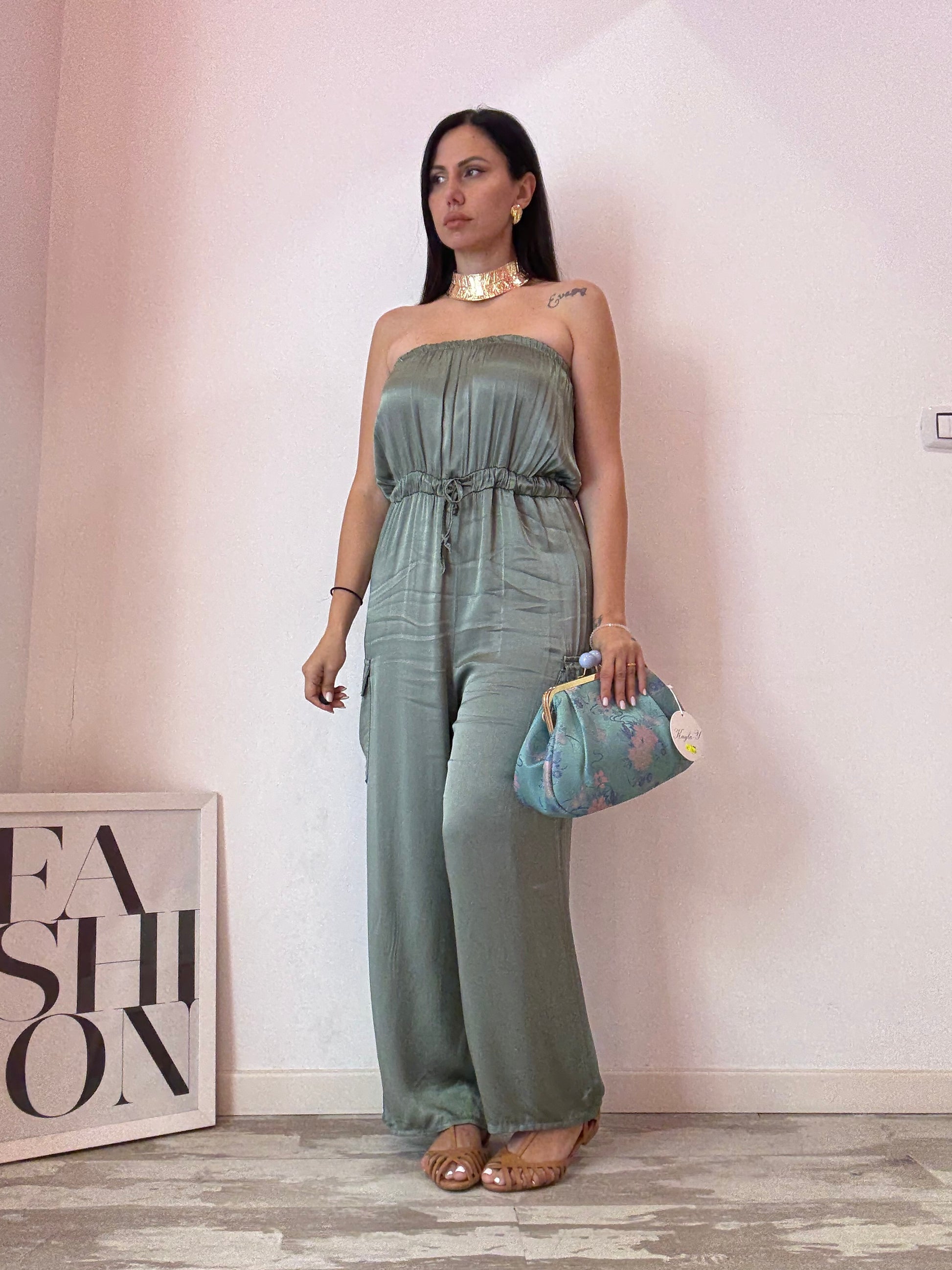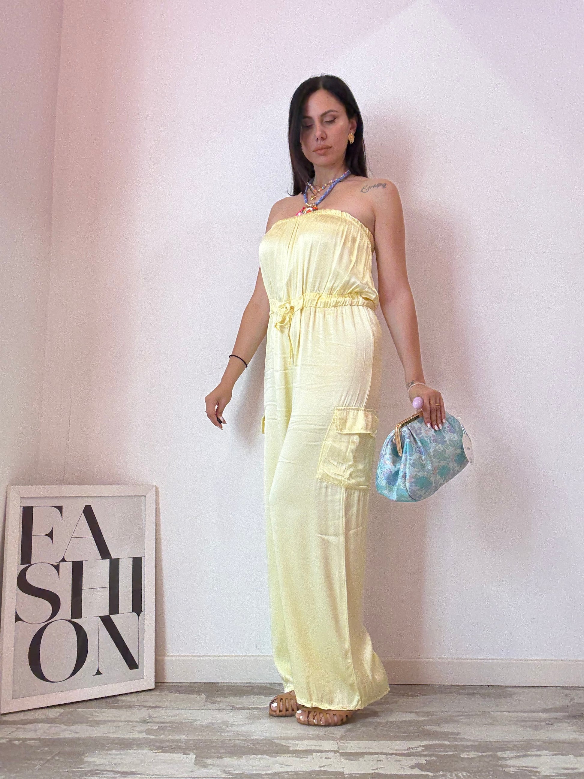 Tutone in tessuto tipo satin con pantalone cargo palazzo ed elastico sulla schiena. Taglia unica, vestibilità massima una 44.