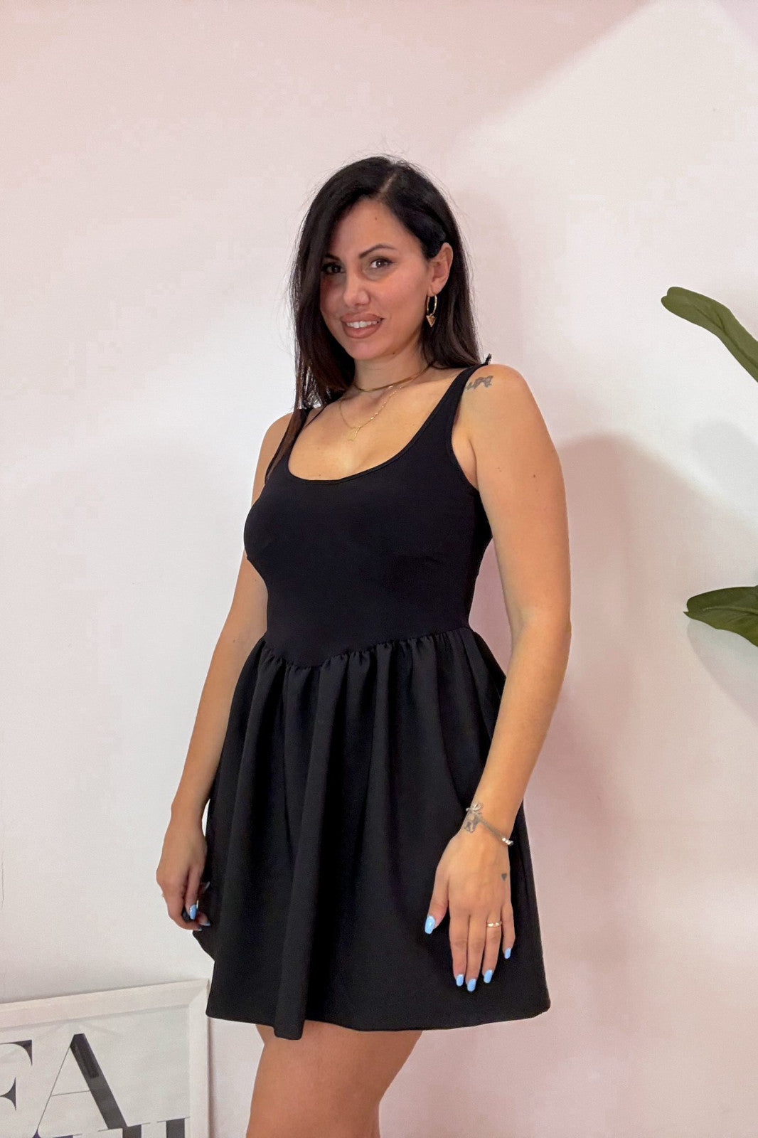 Abito modello bambolina in tessuto elastico. Taglia unica, vestibilità massima una 44.