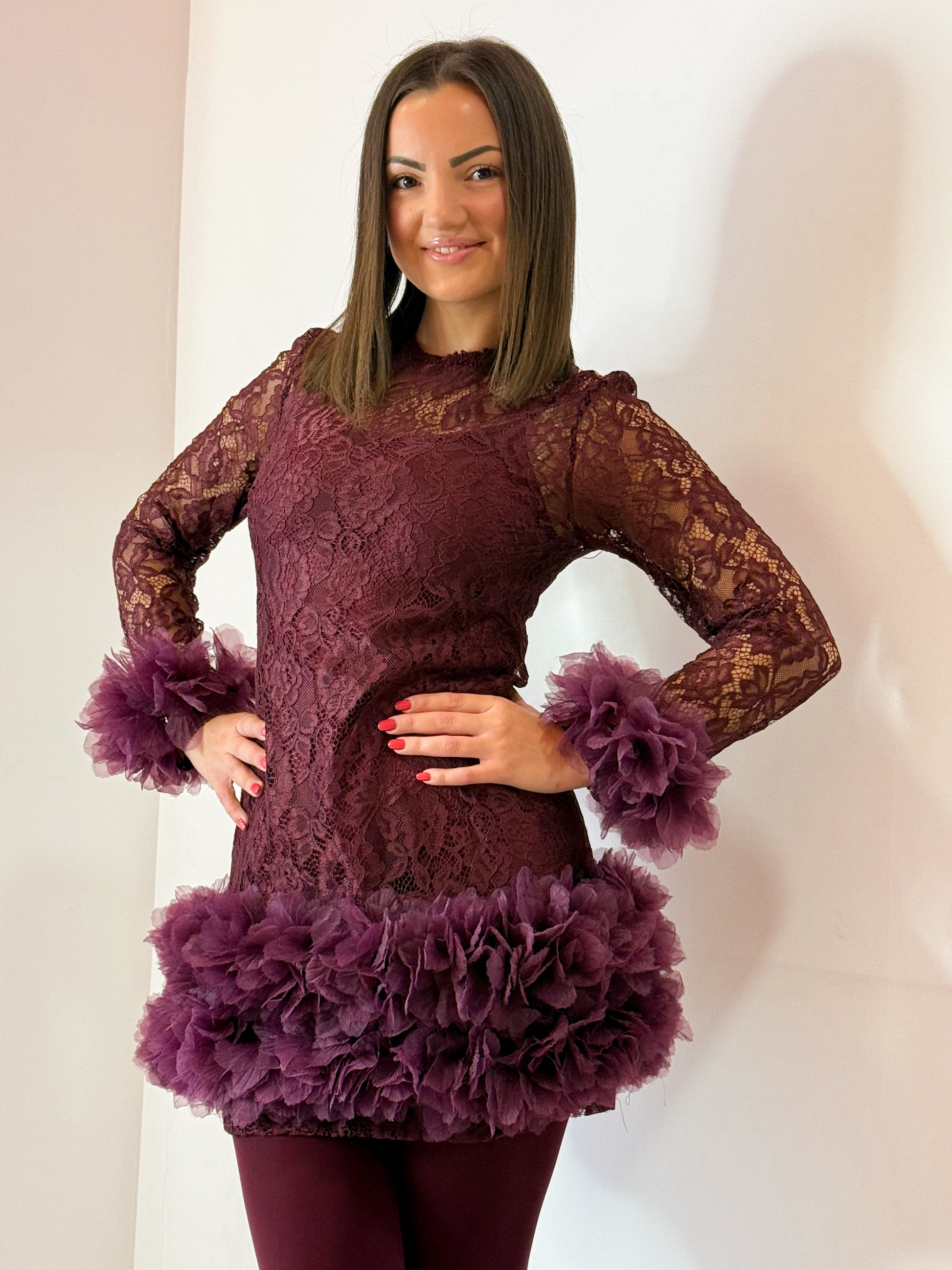 ABITINO IN PIZZO CON GIROCOLLO E ZIP SUL RETRO , LA GONNA E I POLSINI TERMINANO CON APPLICAZIONI DI PETALI IN ORGANZA , L ABITO è COMPRENSIVO ANCHE DI SOTTOVESTE
