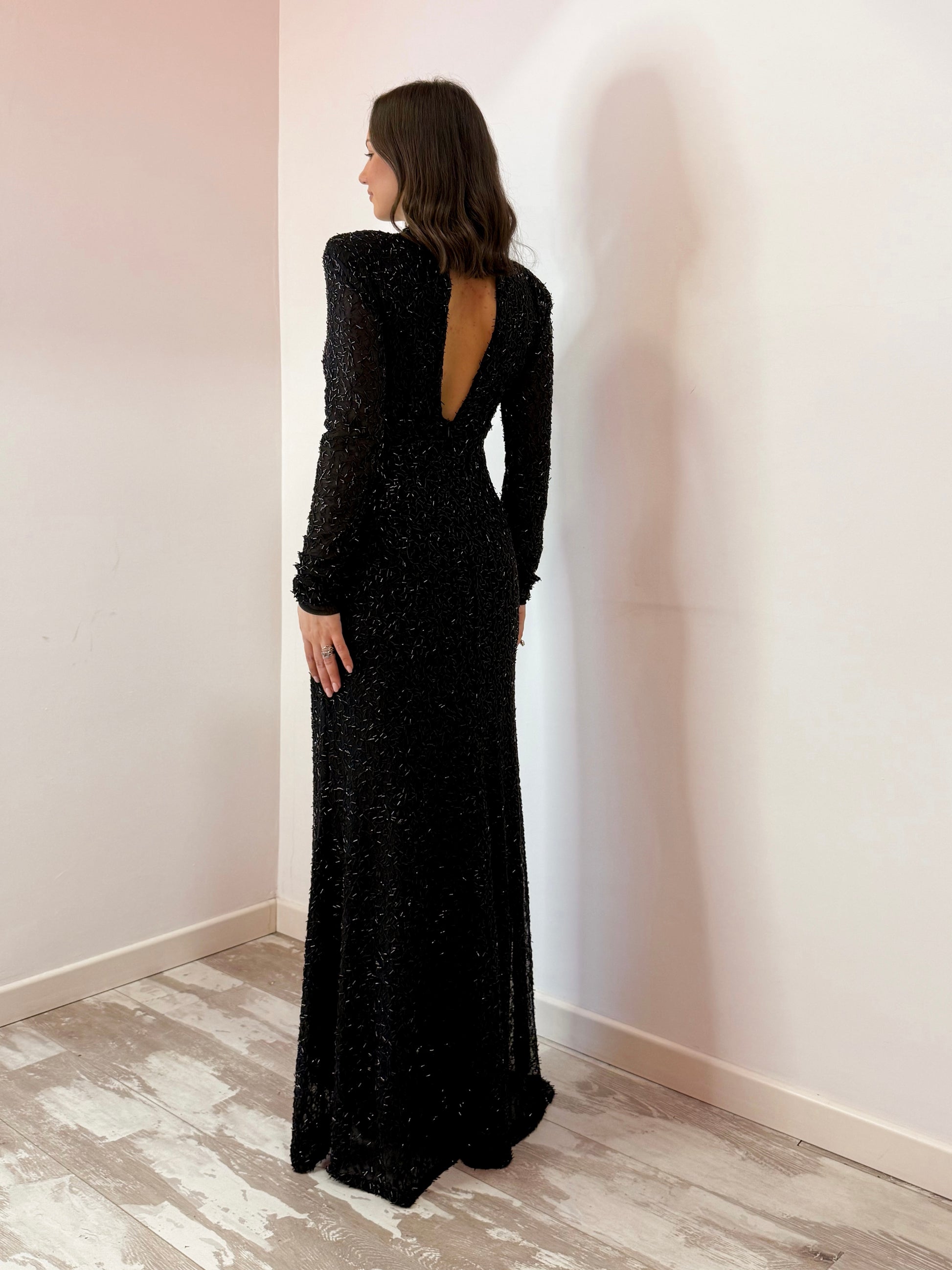 ABITO LUNGO CON SPALLINE IMBOTTITE , APERTURA SUL SENO E ABOTTONATURA SUL RETRO DEL COLLO E ZIP SUL RETRO DELLA GONNA , COMPLETAMENTE TEMPESTATO DI APPLICAZIONI LUCCICOSE TONO SU TONO , TAGLIA UNICA VESTE MAX L