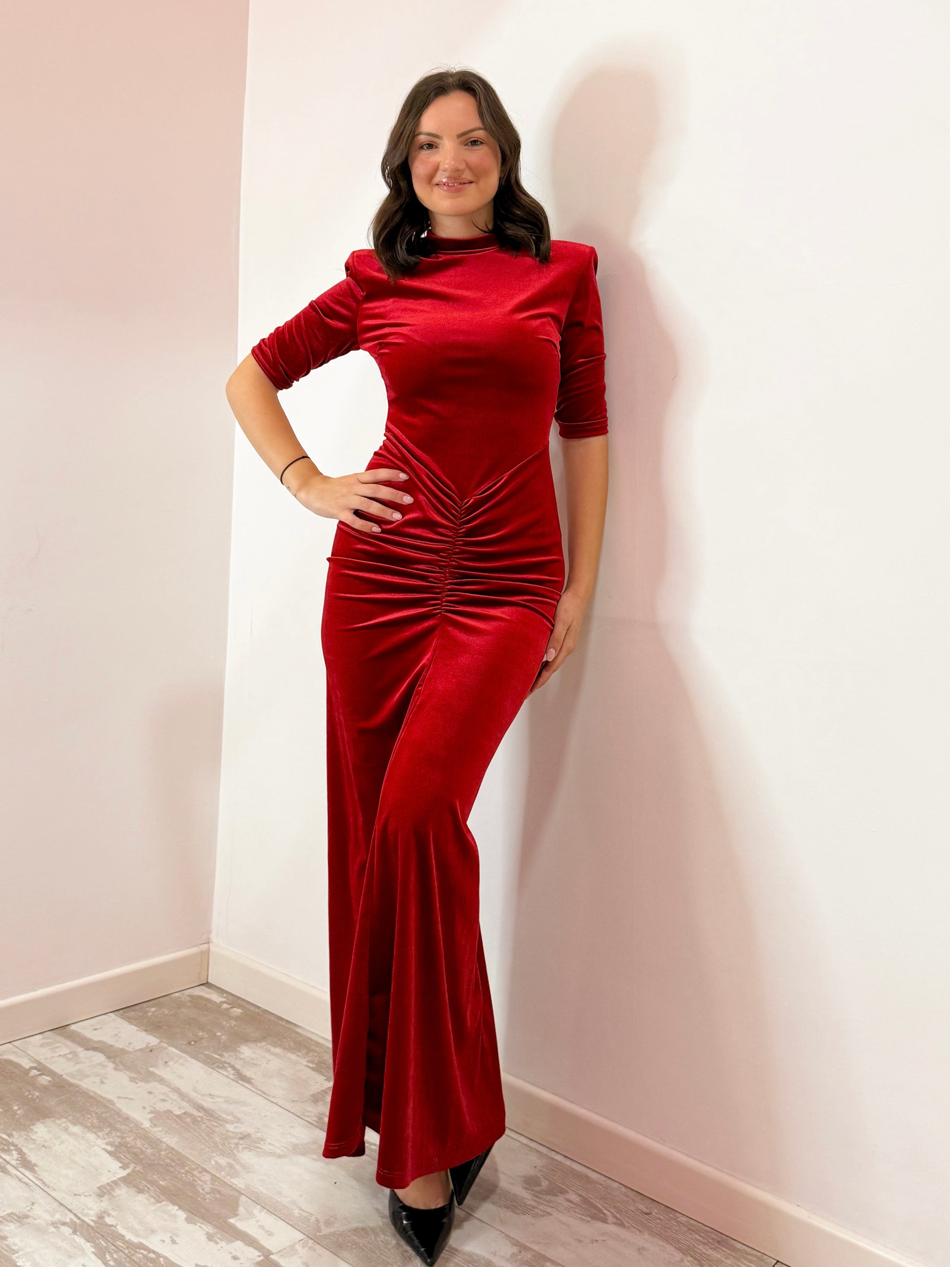 ABITO MIDI , MEZZO COLLO IN VELLUTINO CON DRAPPO AVANTI E SUL RETRO DEL SEDERE PER EVIDENZIARE LE FORME , SPALLINE IMBOTTTE SI ABBOTTONA SUL RETRO DEL COLLO , TAGLIA UNICA VESTE FINO UNA L