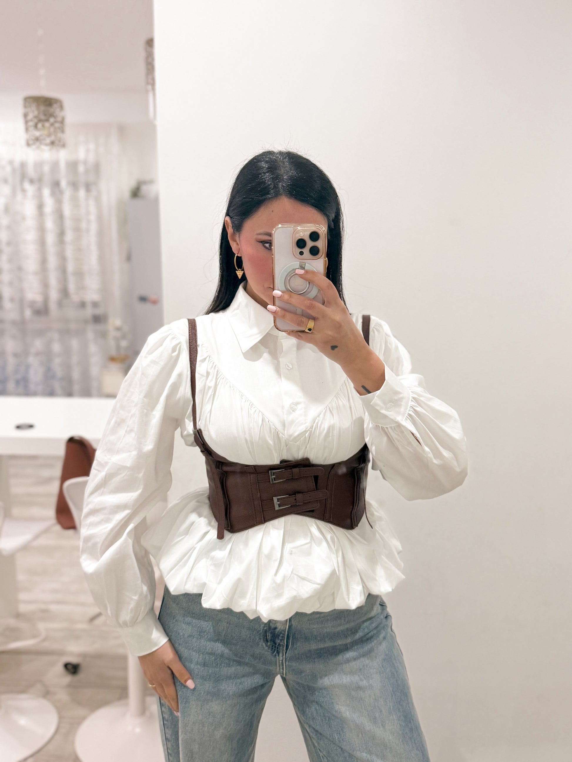 Camicia in cotone modello a palloncino con tre bottoni compresa di bustino in similpelle con chiusura strappo
