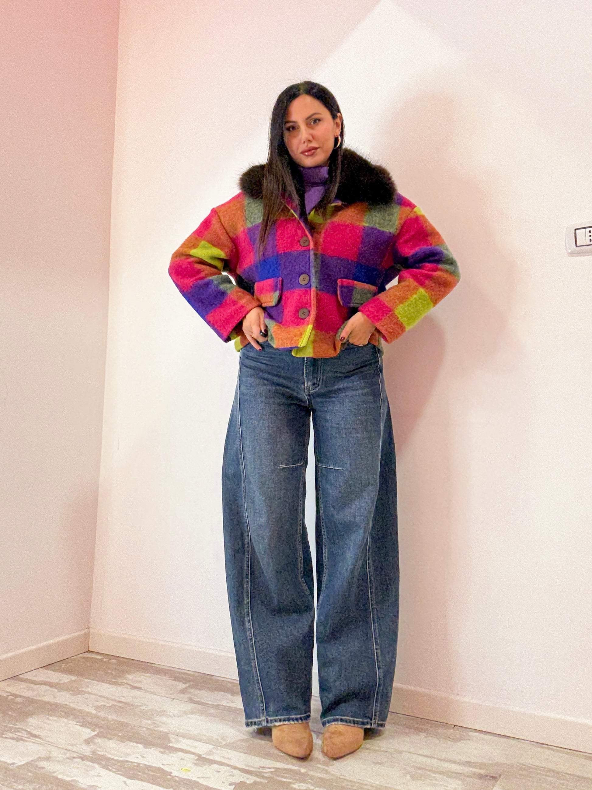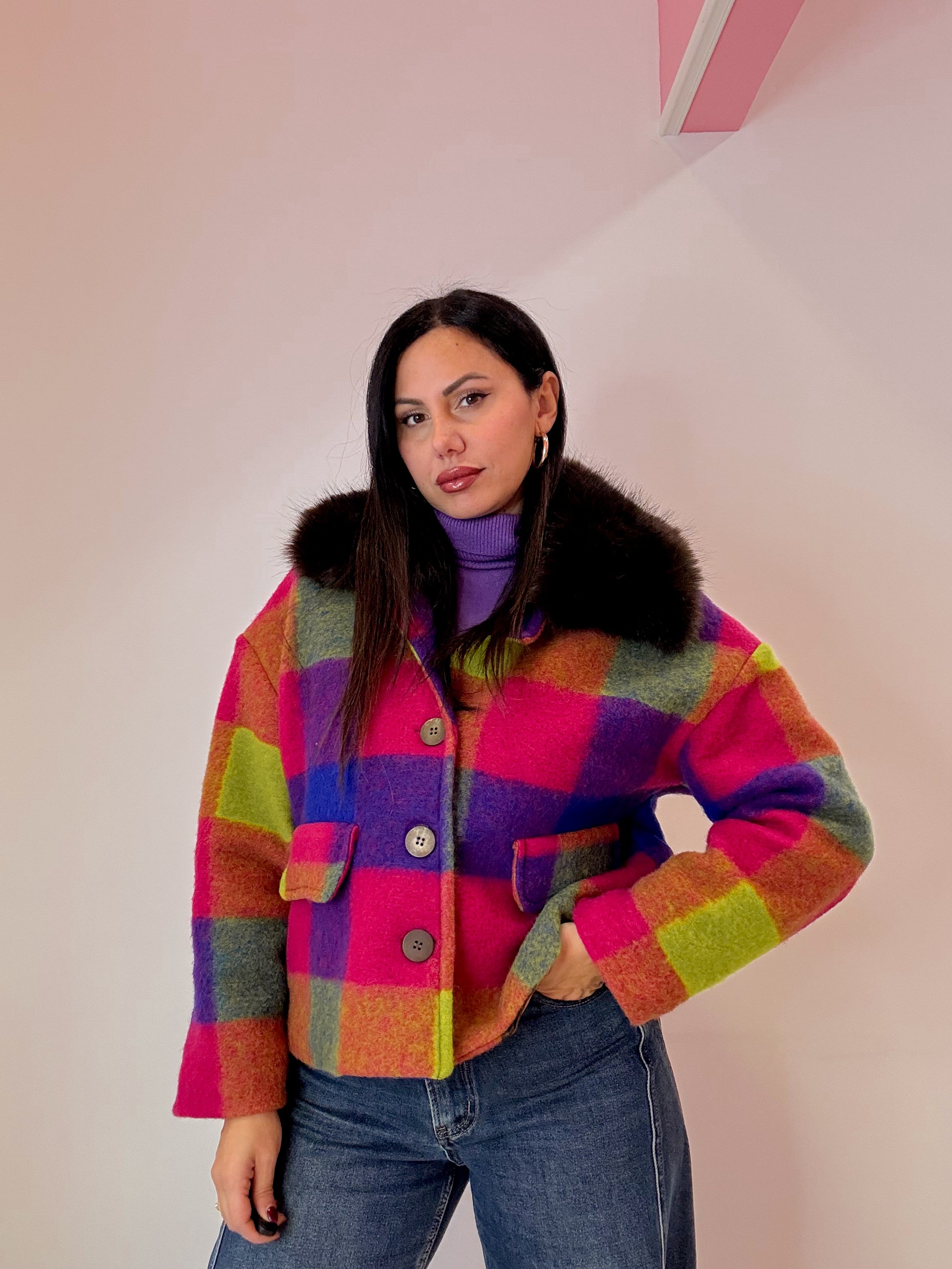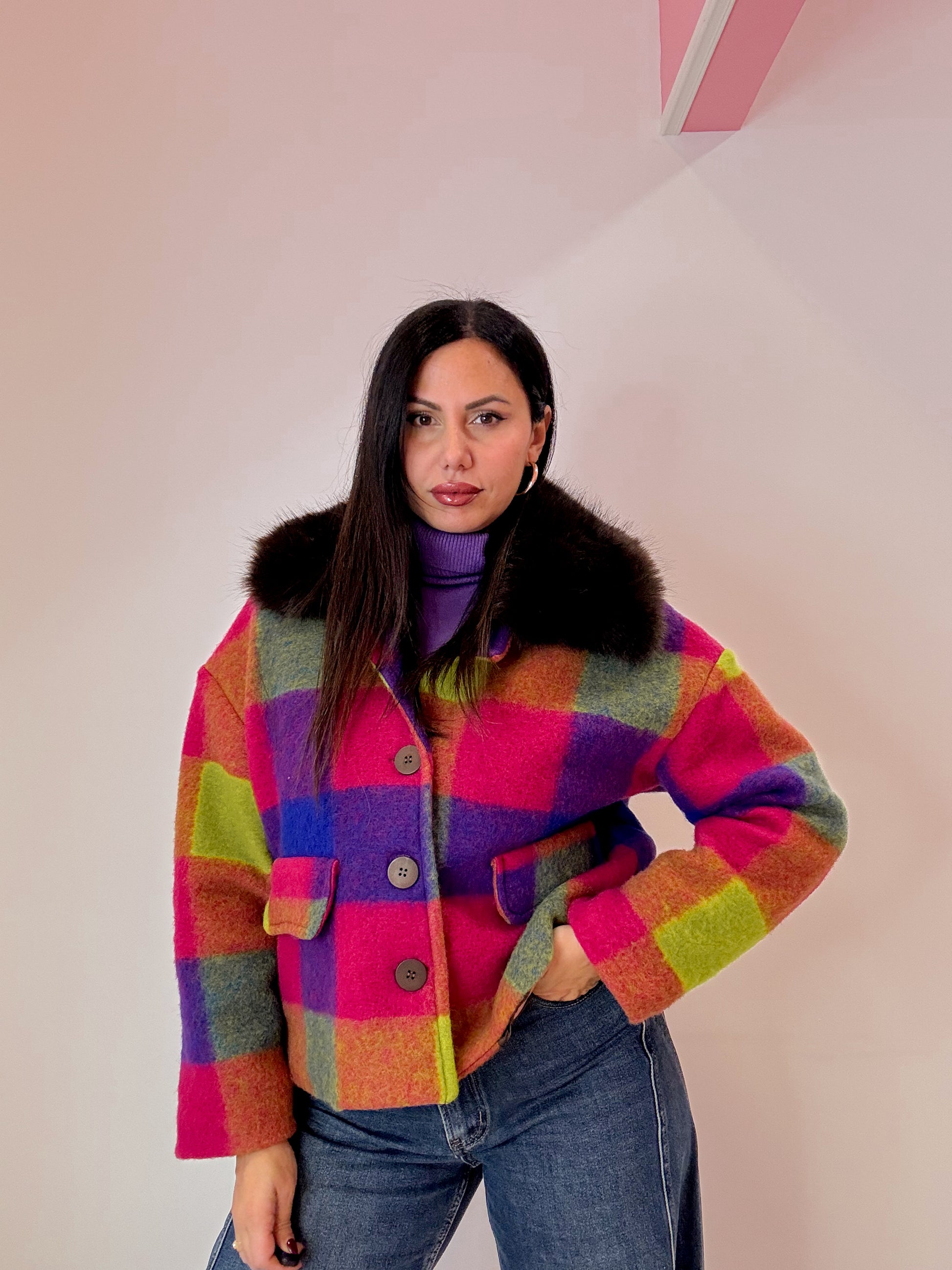 CAPPOTTINO IN LANA COTTA , LUNGHEZZA BASIC , CON COLLO IN PELLICCIA CHIUSURACON BOTTONI