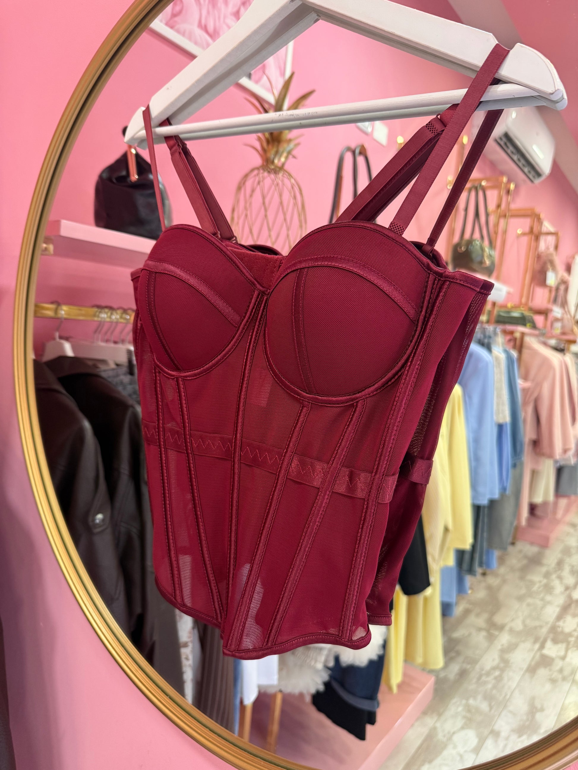 CORPETTO CON BUSTINO TRASPARENTE , STECCATO , COPPETTA PREFORMATA BRETELLINE REGOLABILI E CHIUSURA CON GANCI SUL RETRO , TAGLIA UNICA