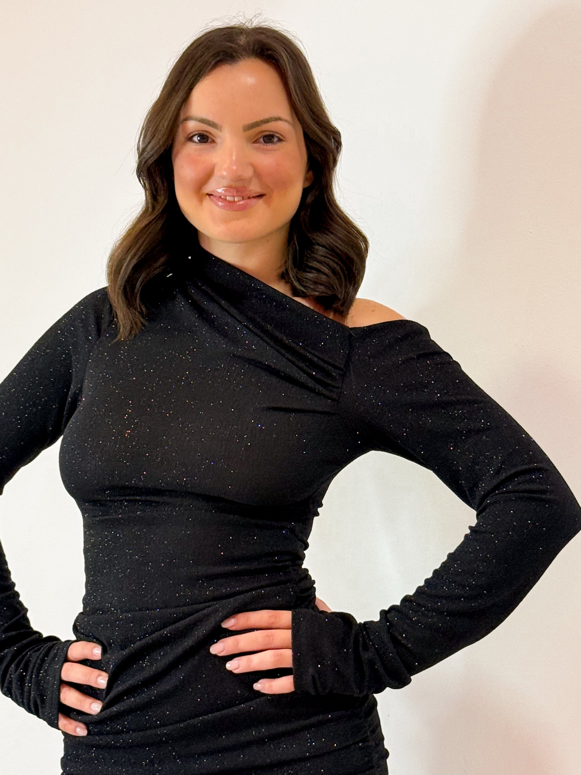 ABITO CORTO MODELLO KIM CON TAGLIO TRASVERSALE SULLA SPALLA , EFFETTO LUREX BRILLANTINATO , TAGLIA UNICA ELASTICO