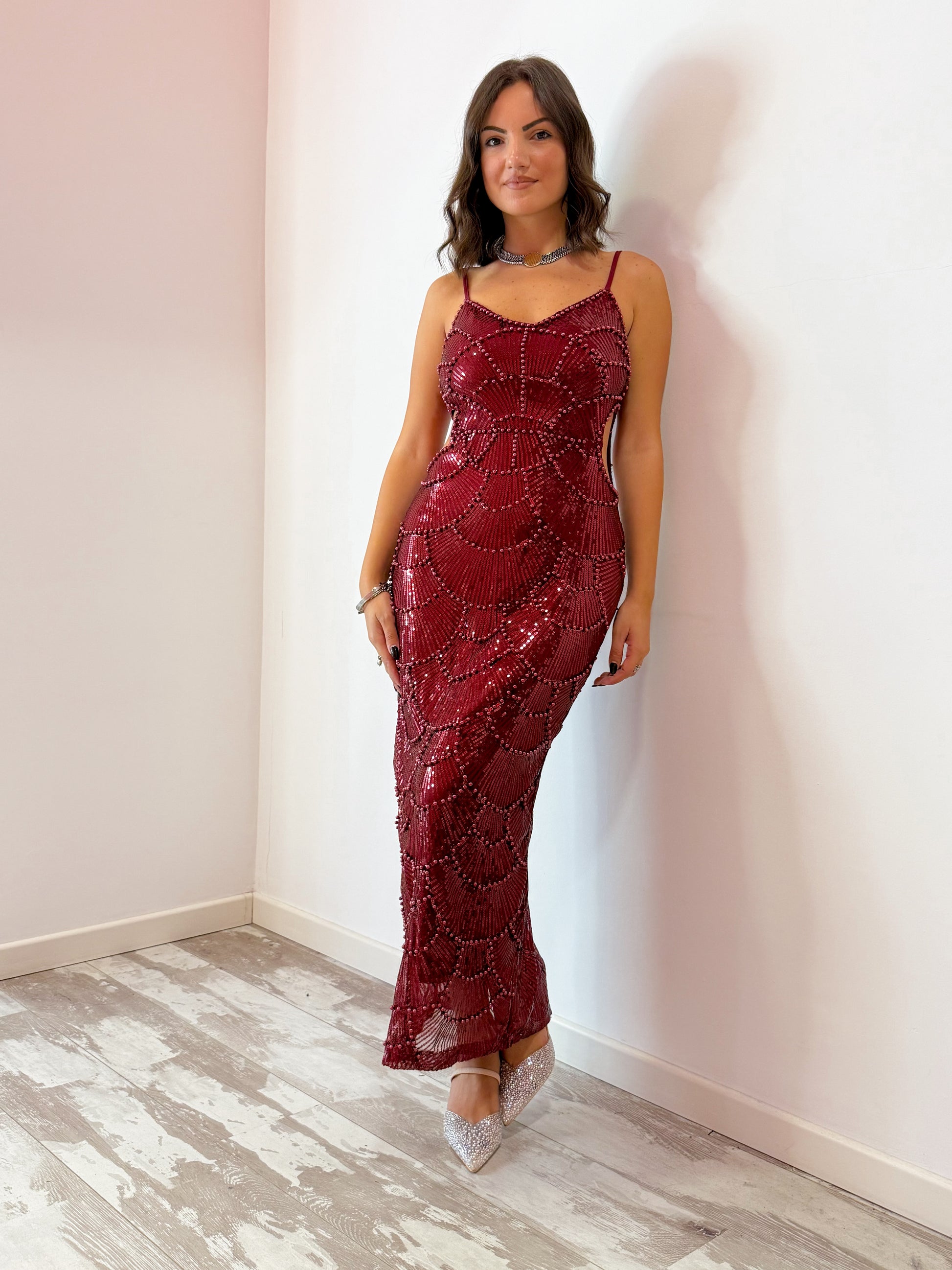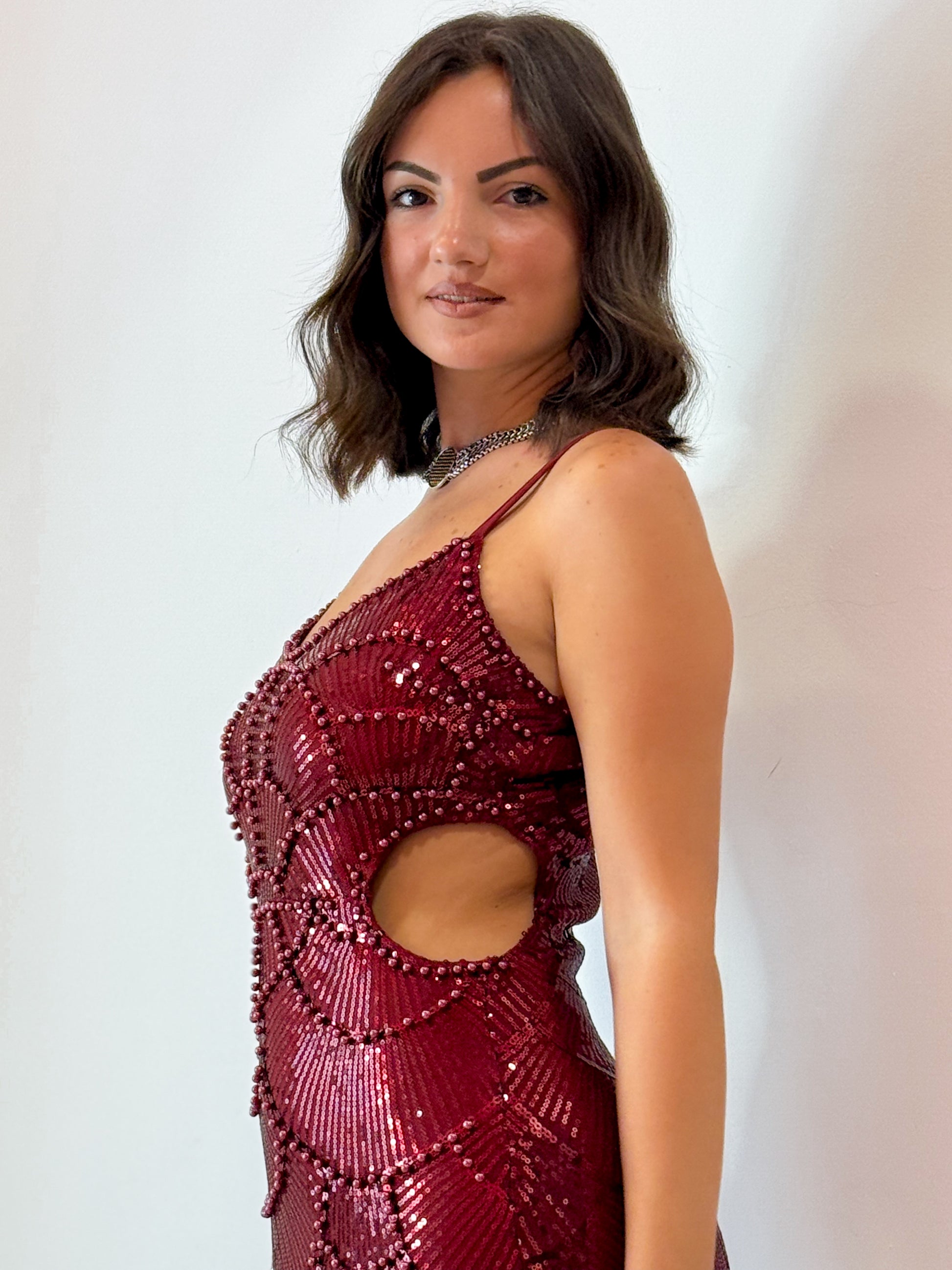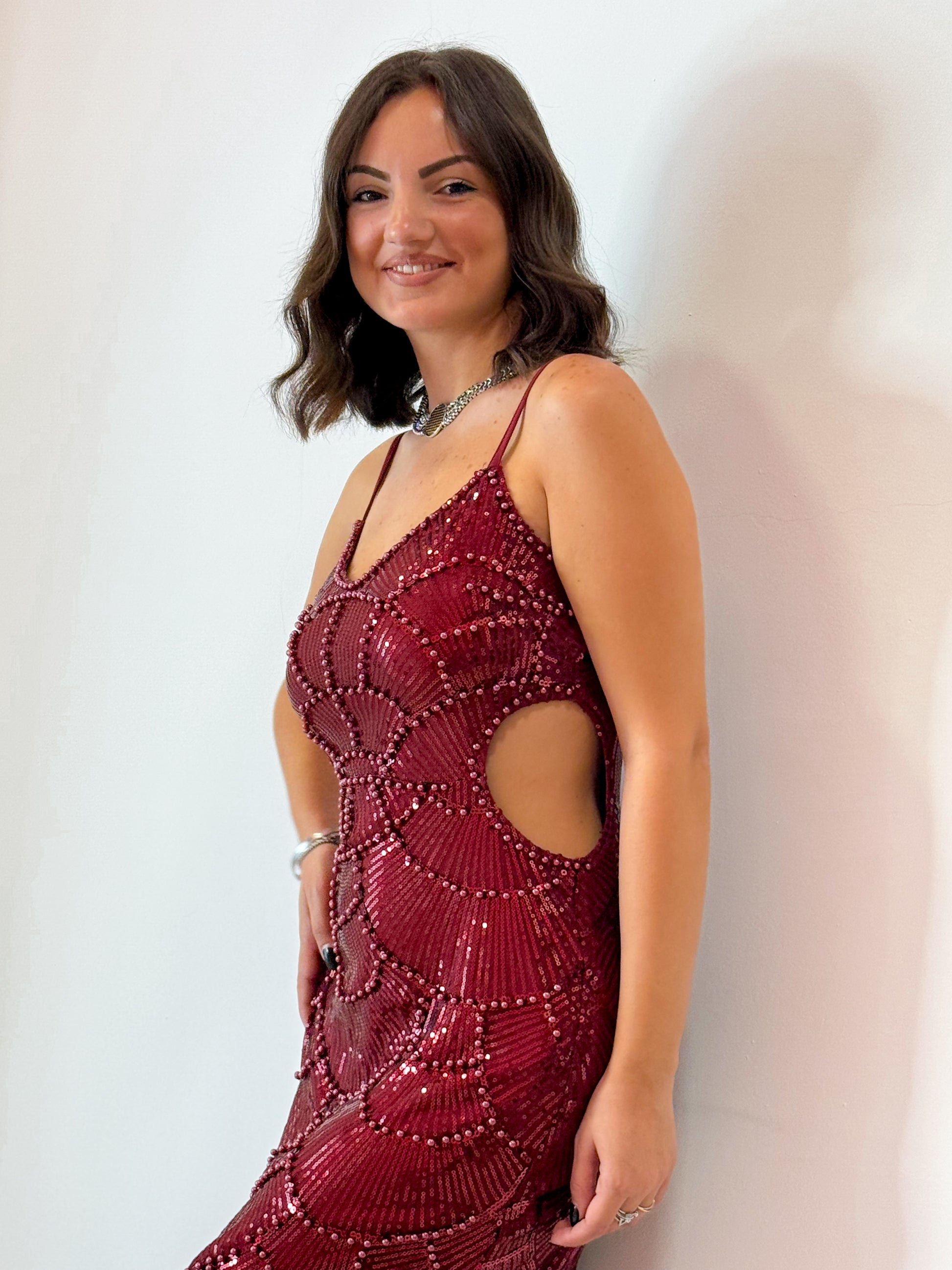 ABITO CON APPLICAZIONI IN PERLINE ,APERTURE SUI FIANCHI , BRETELLINE REGOLABILI,COPPETTE PREFORMATE E SPACCO SUL RETRO DELLA GONNA.