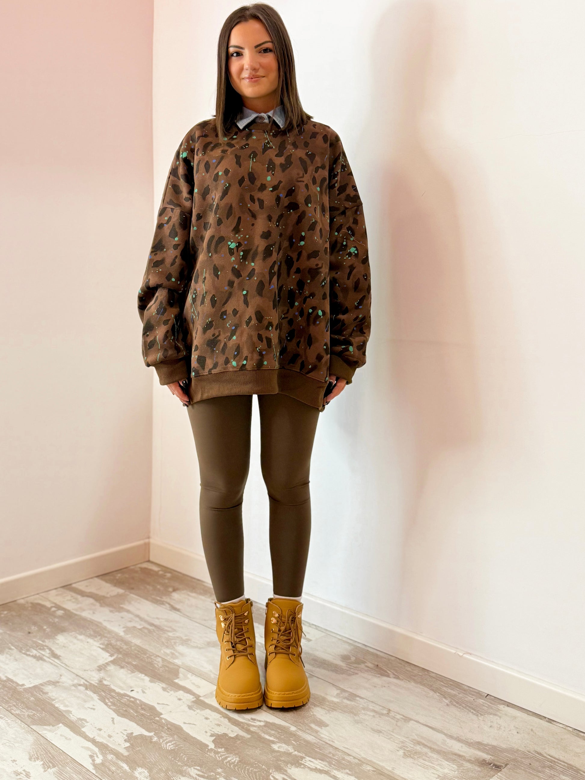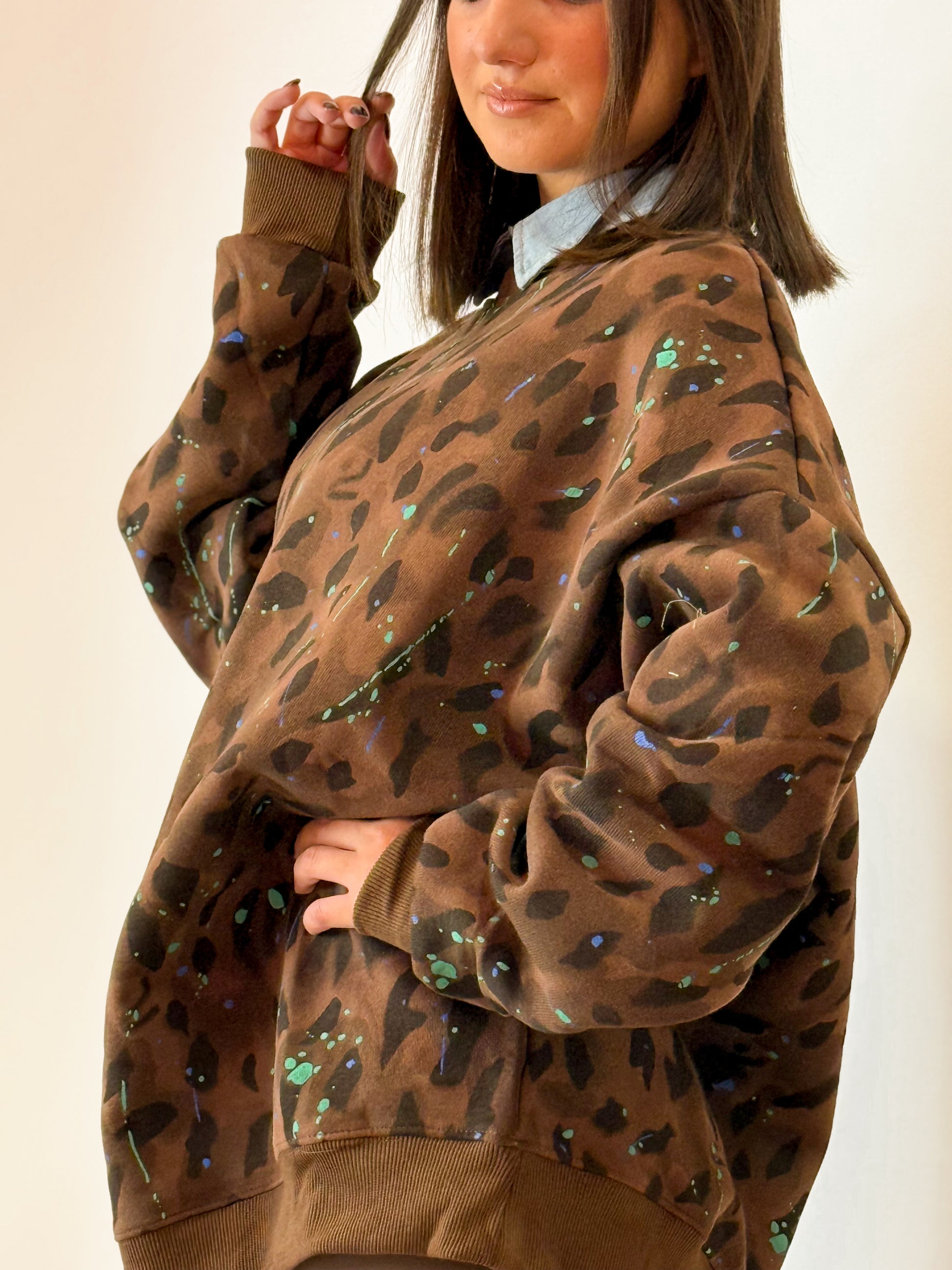 FELPONE CON GIROCOLLO E STAMPA MACULATA CON EFFETTO SCHIZZATO