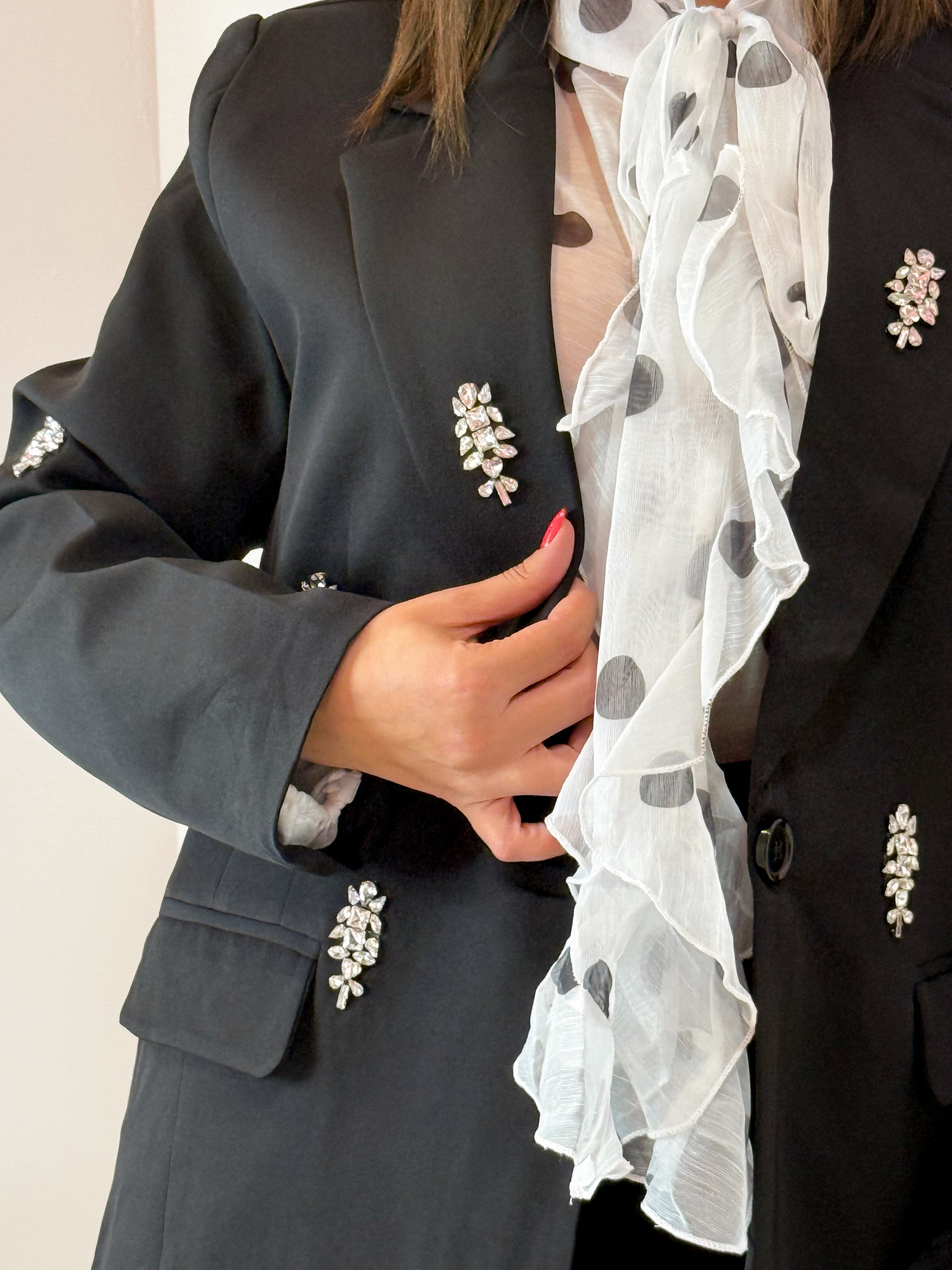 GIACCA OVER FODERATA ALL'INTERNO , SPALLINE IMBOTTITE E APPLICAZIONI DI PIETRE E STRASS IN ARGENTO SOLO SUL FRONTE , IL RESTRO è LISCIO.