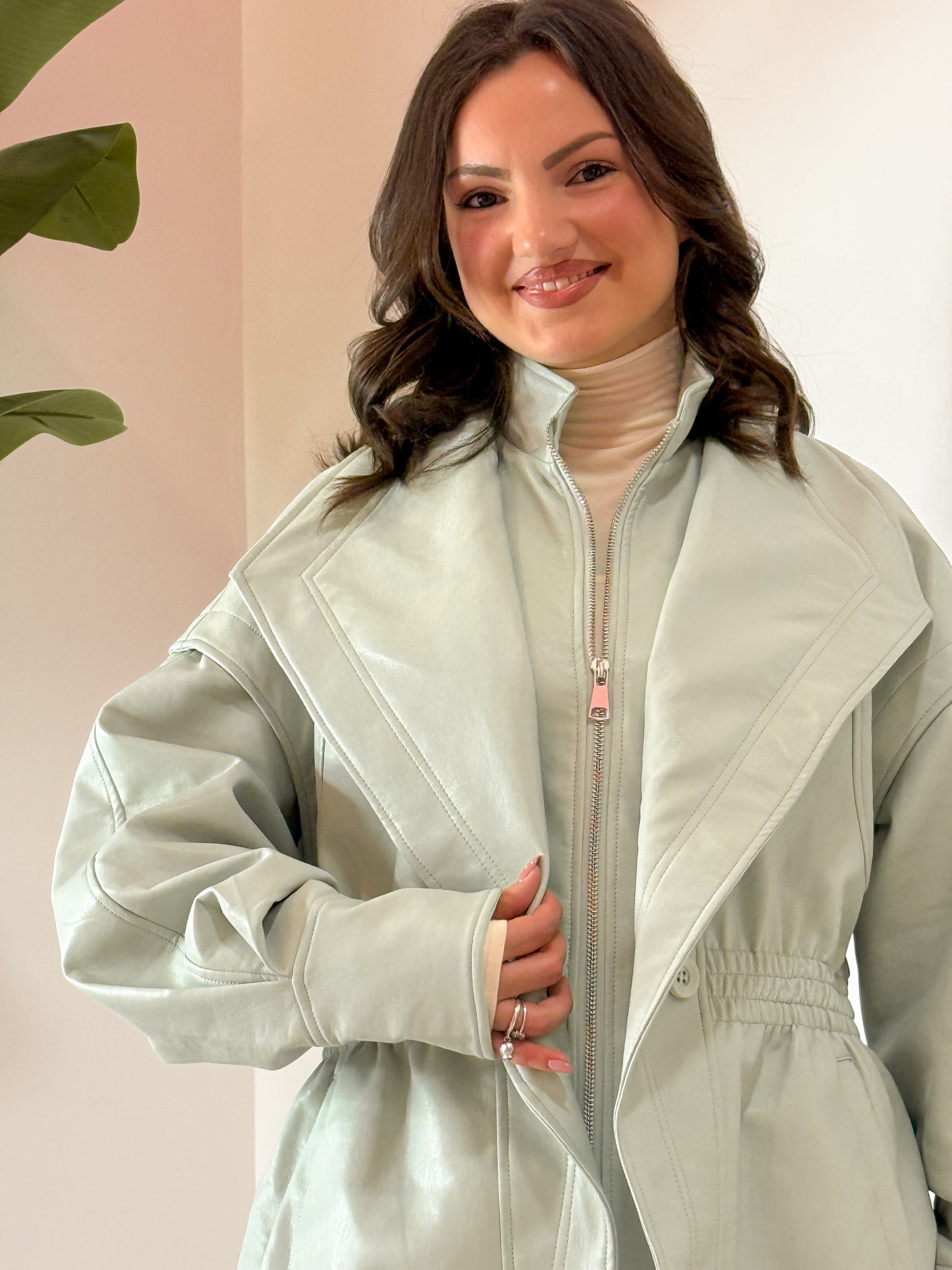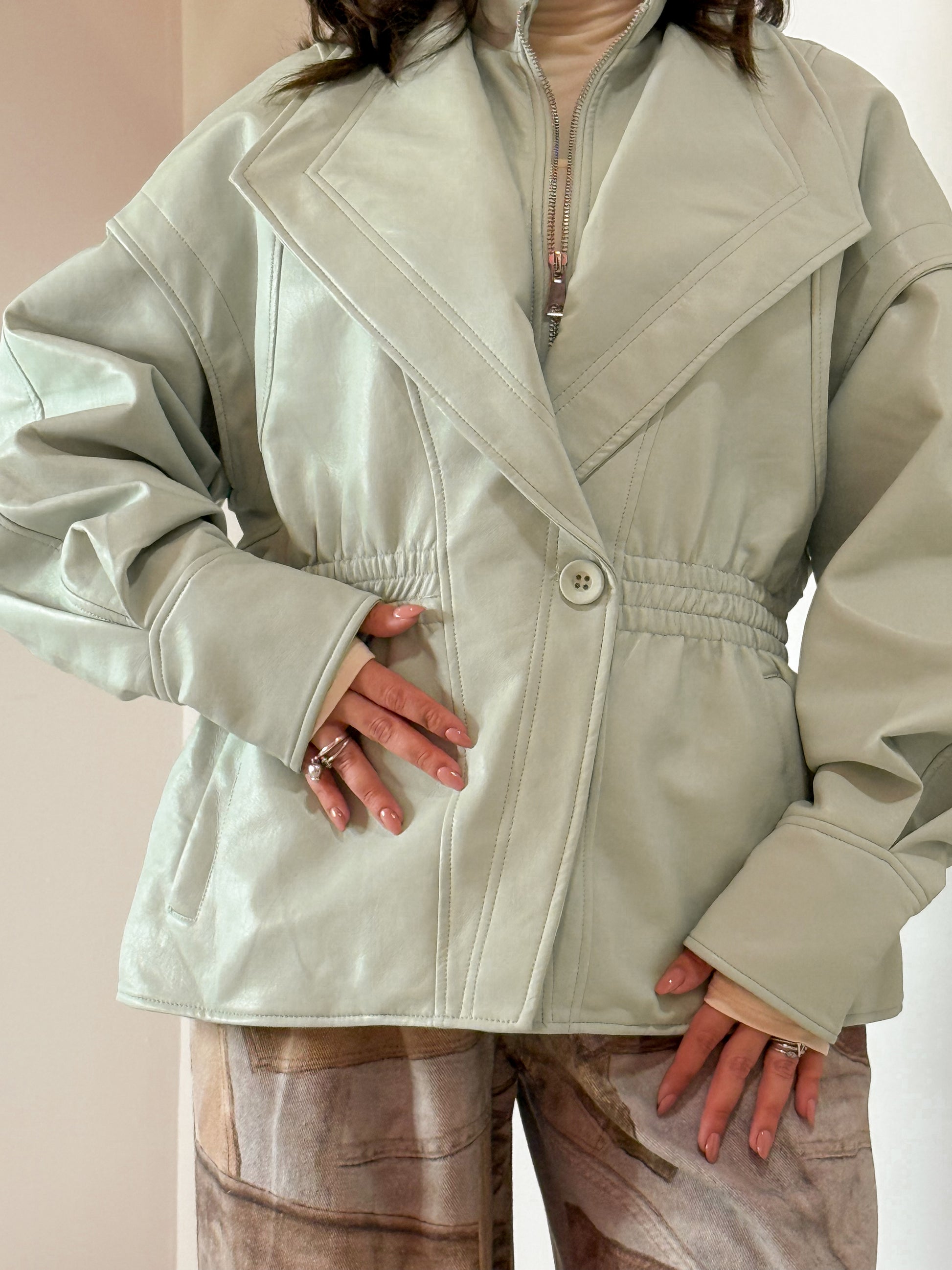 GIACCA IN SIMILPELLE CHIUSURA CON ZIP E BOTTONE , MOLLA CHE SEGNA IL PUNTO VITA , MANICHE A SBUFFO CON POLSINI ALTI