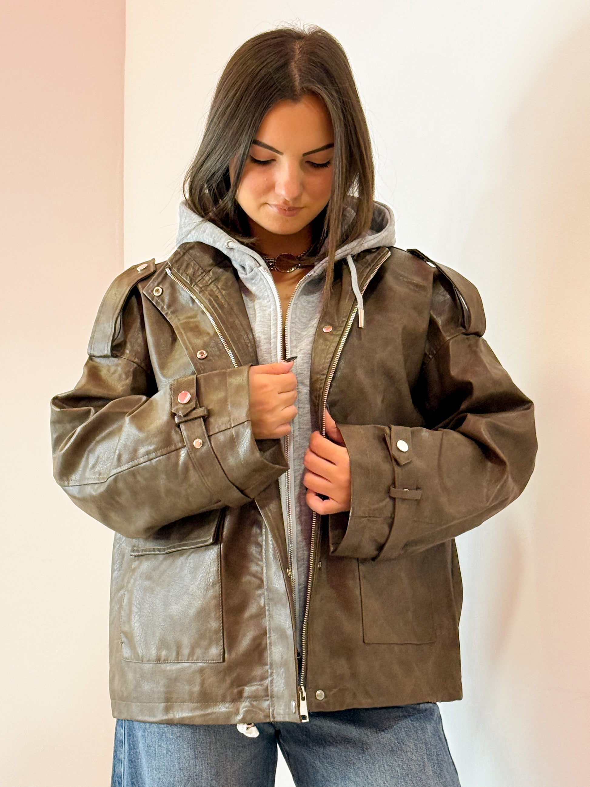 GIACCA IN SIMILPELLE CON CHIUSURA A CIAPPETTE E ZIP INTERNA , CN EFFETTO FINTA FELPA CUCITA E CAPPUCCIO SUL RETRO