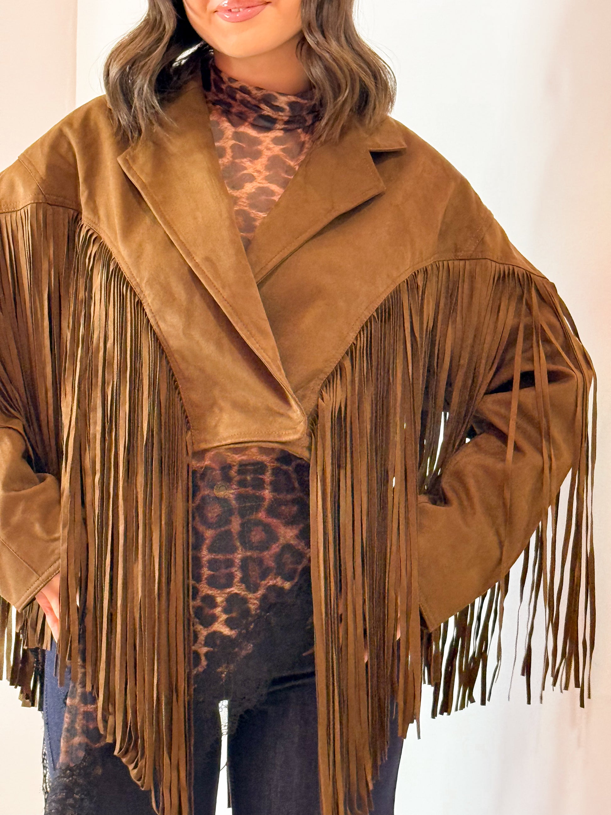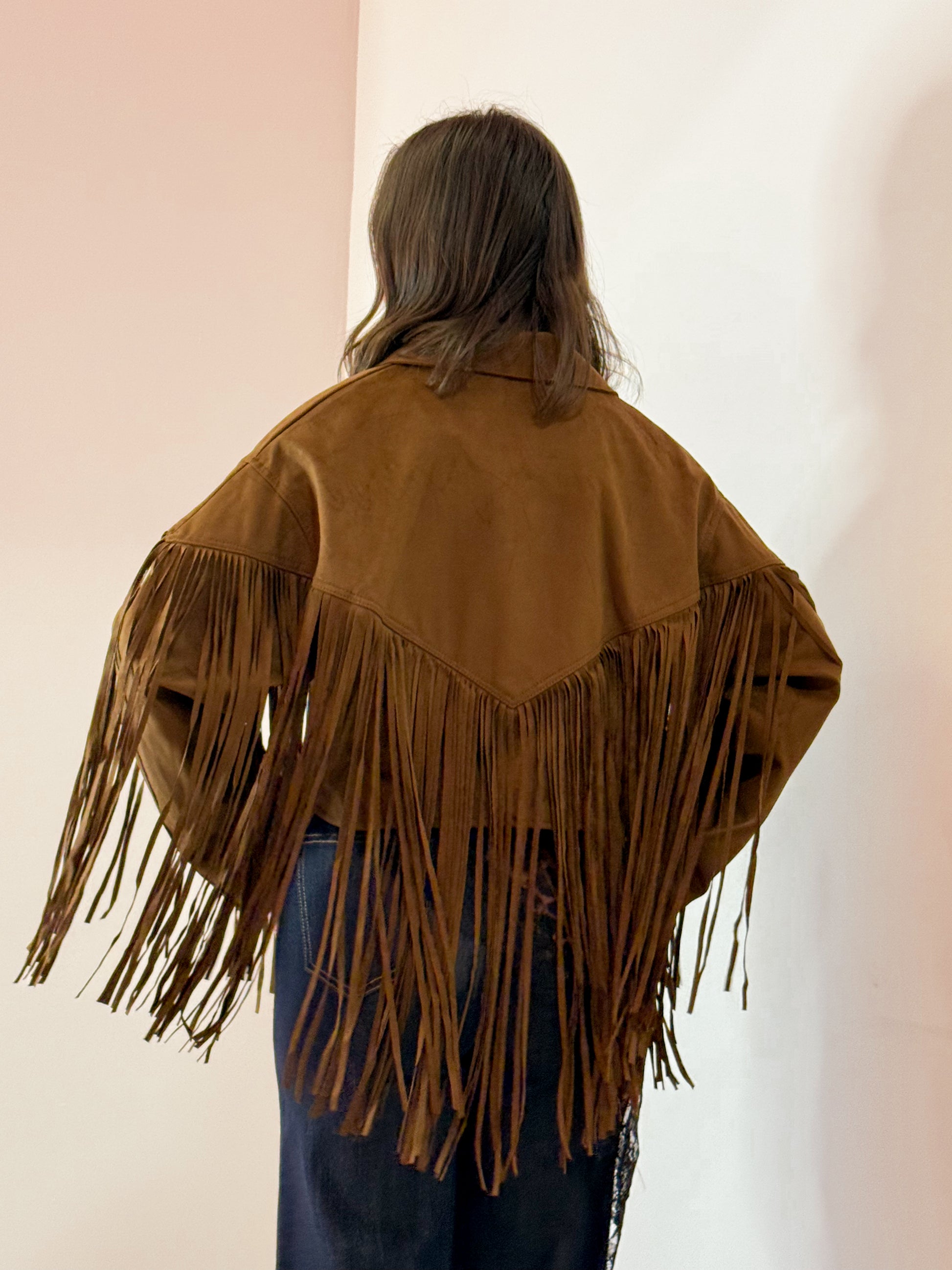 GIACCA IN CAMOSCIO MODELLO CROP CON FRANGIONI LUNGHI SIA AVANTI CHE SUL RETRO , CHIUSURA CON BOTTONE , FODERATO ALL'INTERNO , TAGLIA UNICA VESTE FINO UNA L