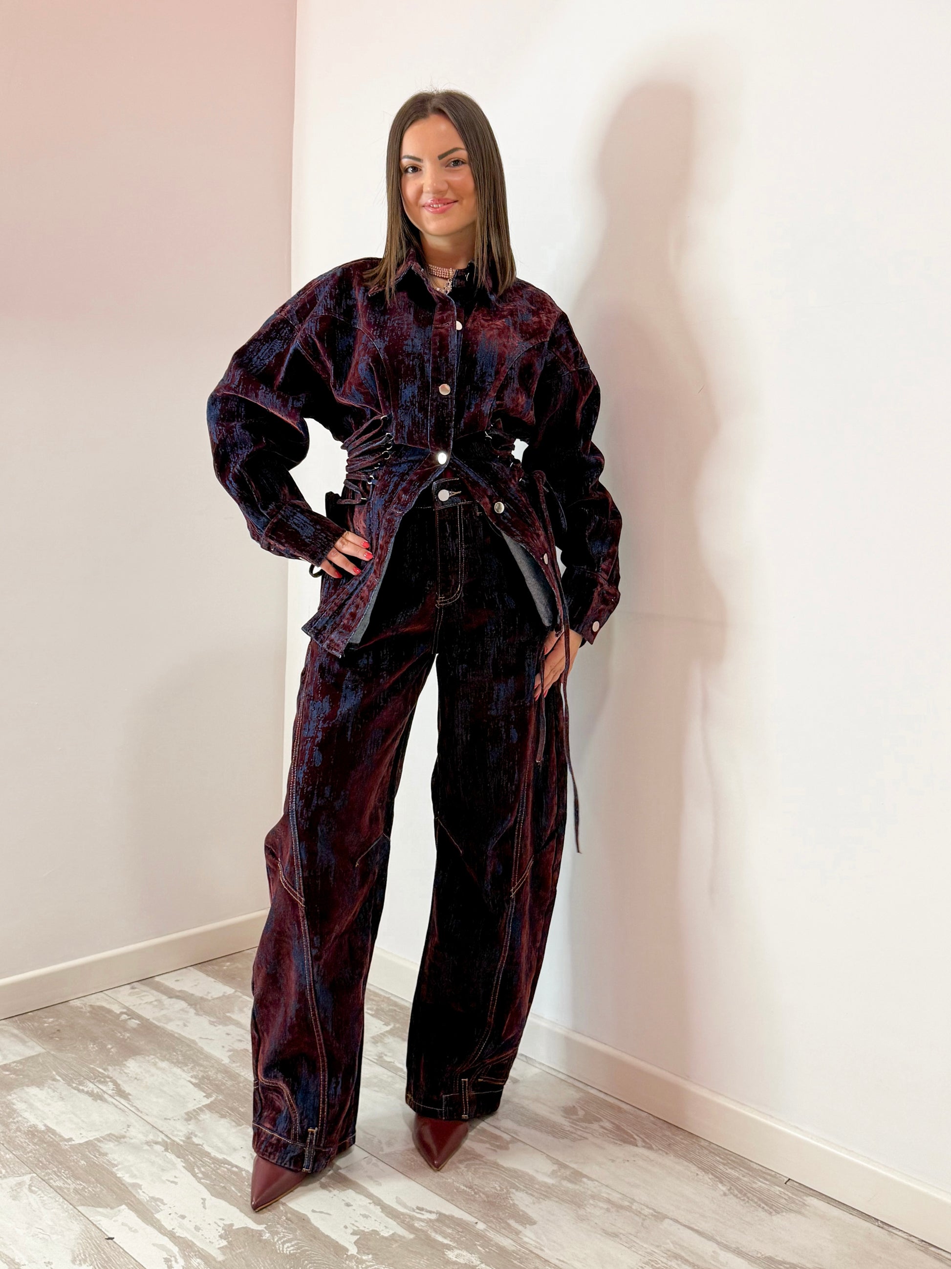 JEANS MODELLO LEGGERMENTE BALLOON , CON INSERTI IN VELLUTO BORDEAUX, TELA RIGIDA , SUL FONDO DEL JEANS RICHIAMA UN EFFETTO TASCA