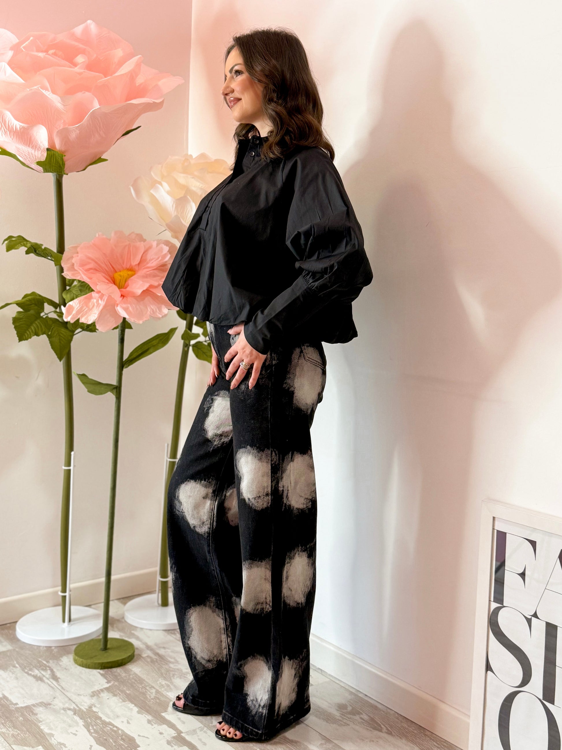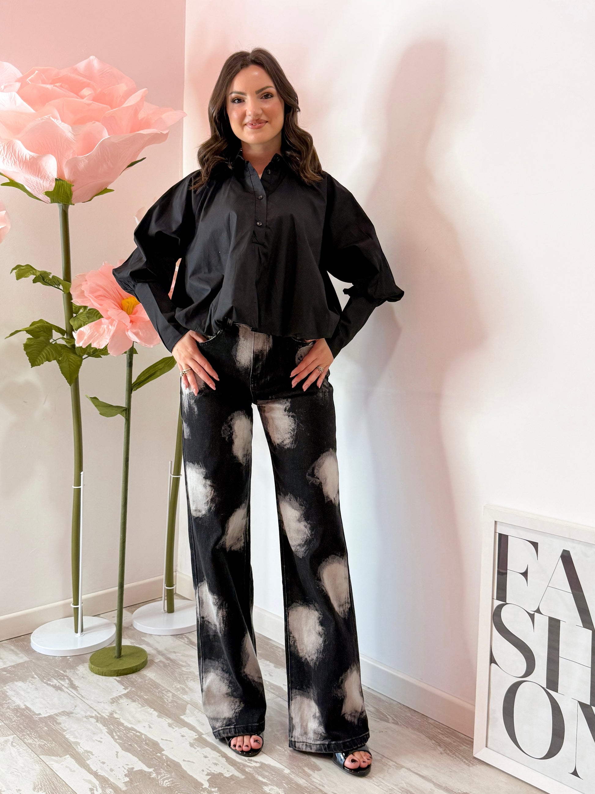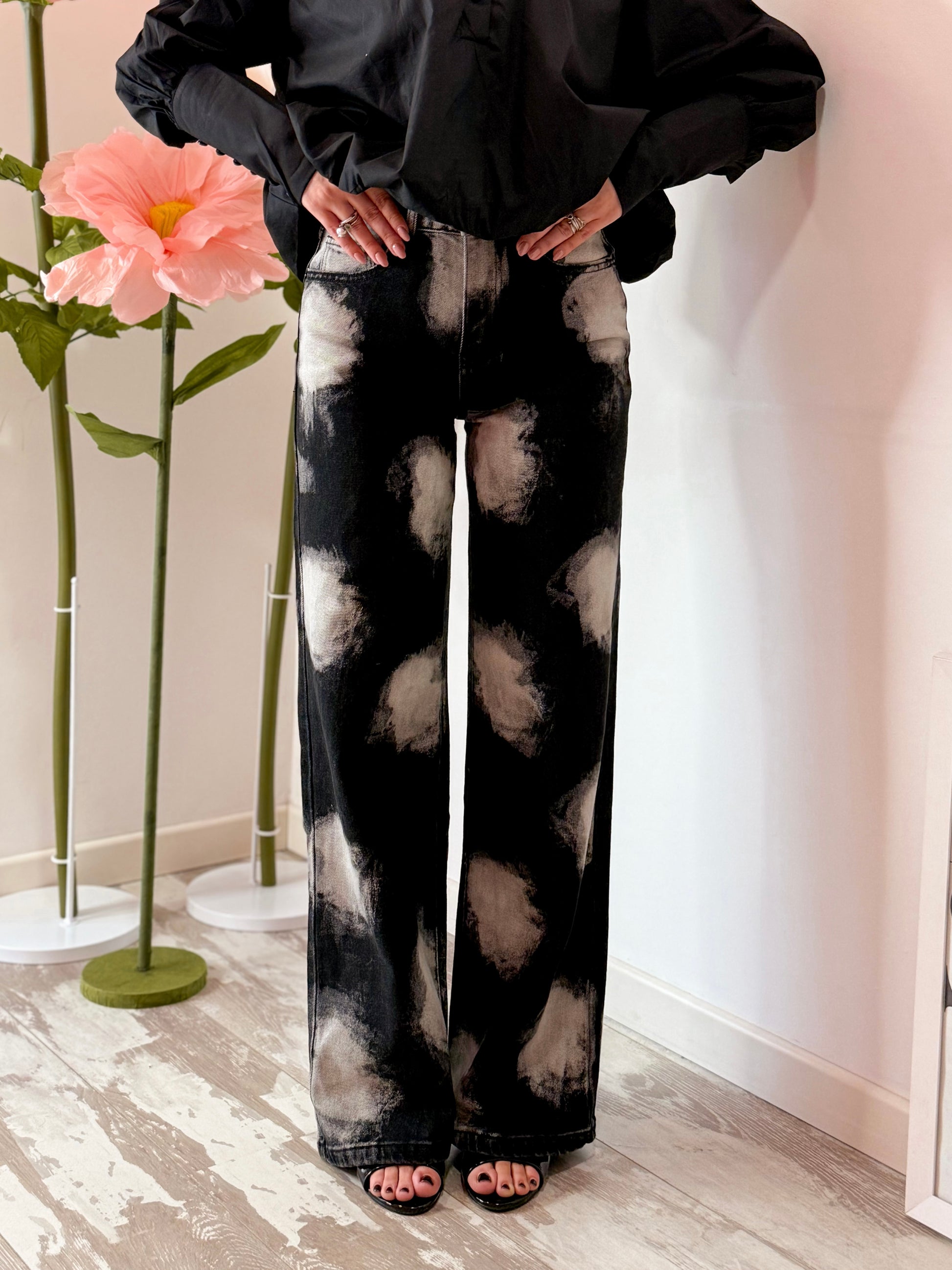JEANS PALAZZO VITA ALTA , LAVAGGIO SCURO , NERO CON EFFETTO MACCHIATO CHIARO