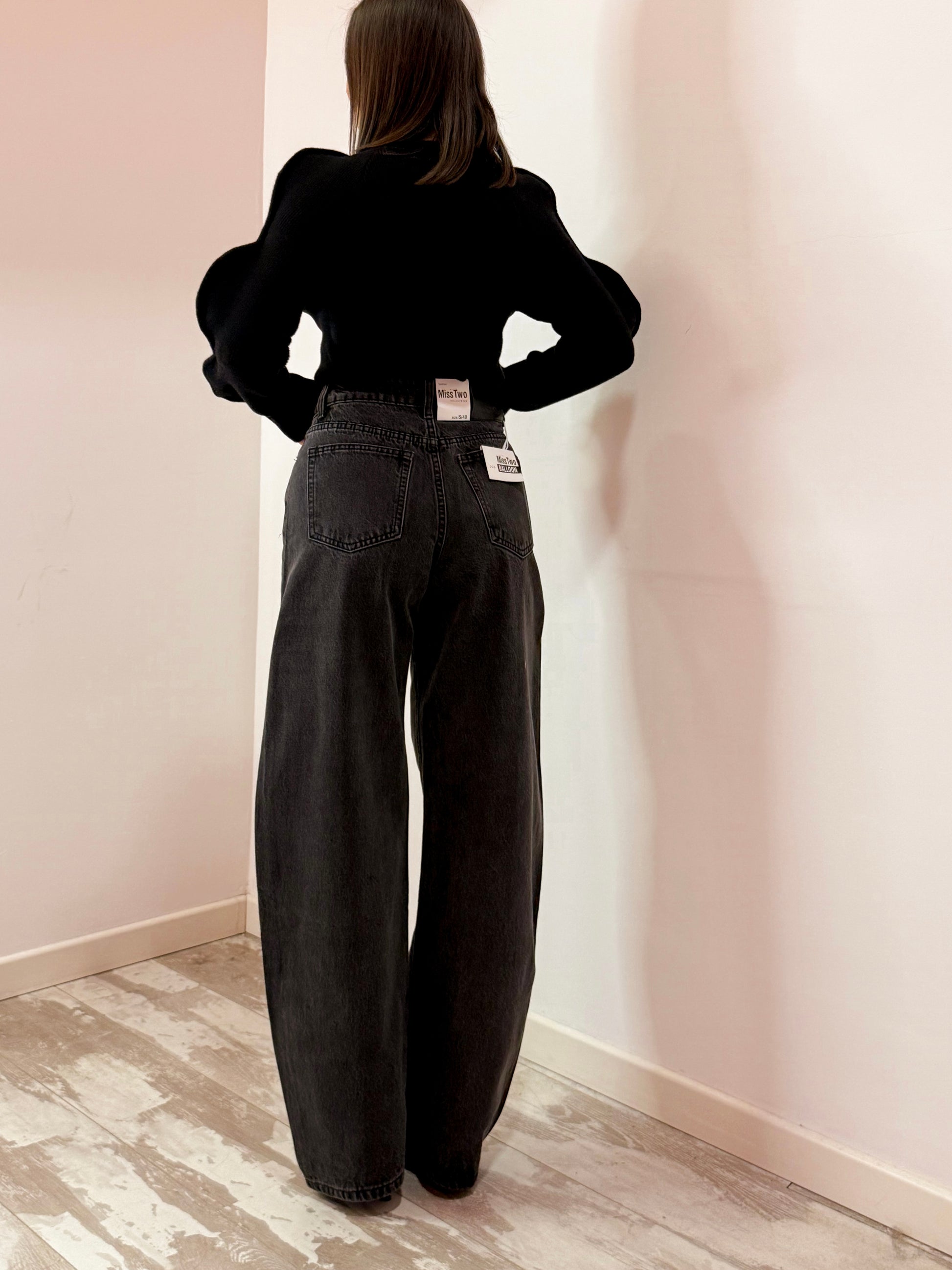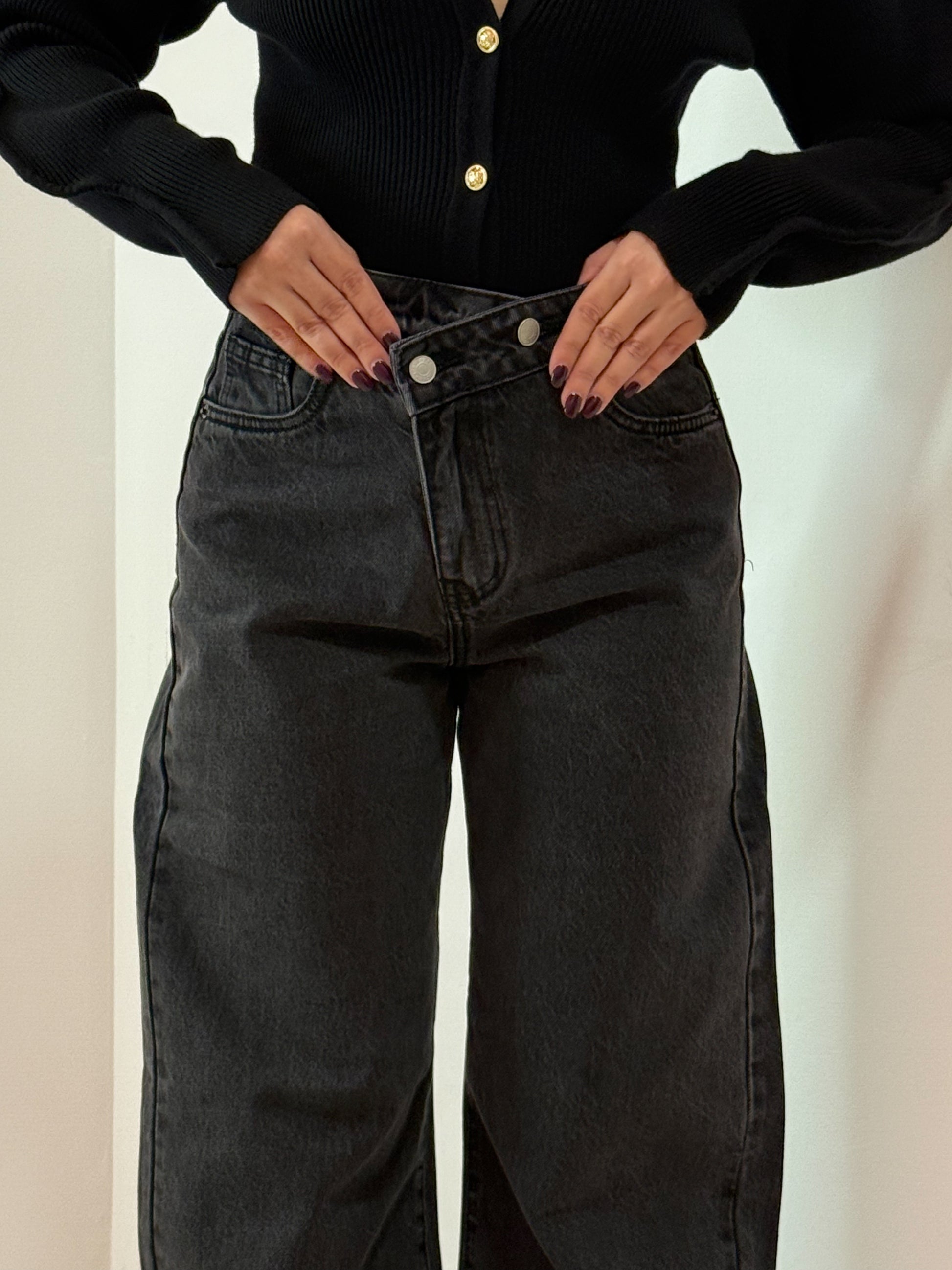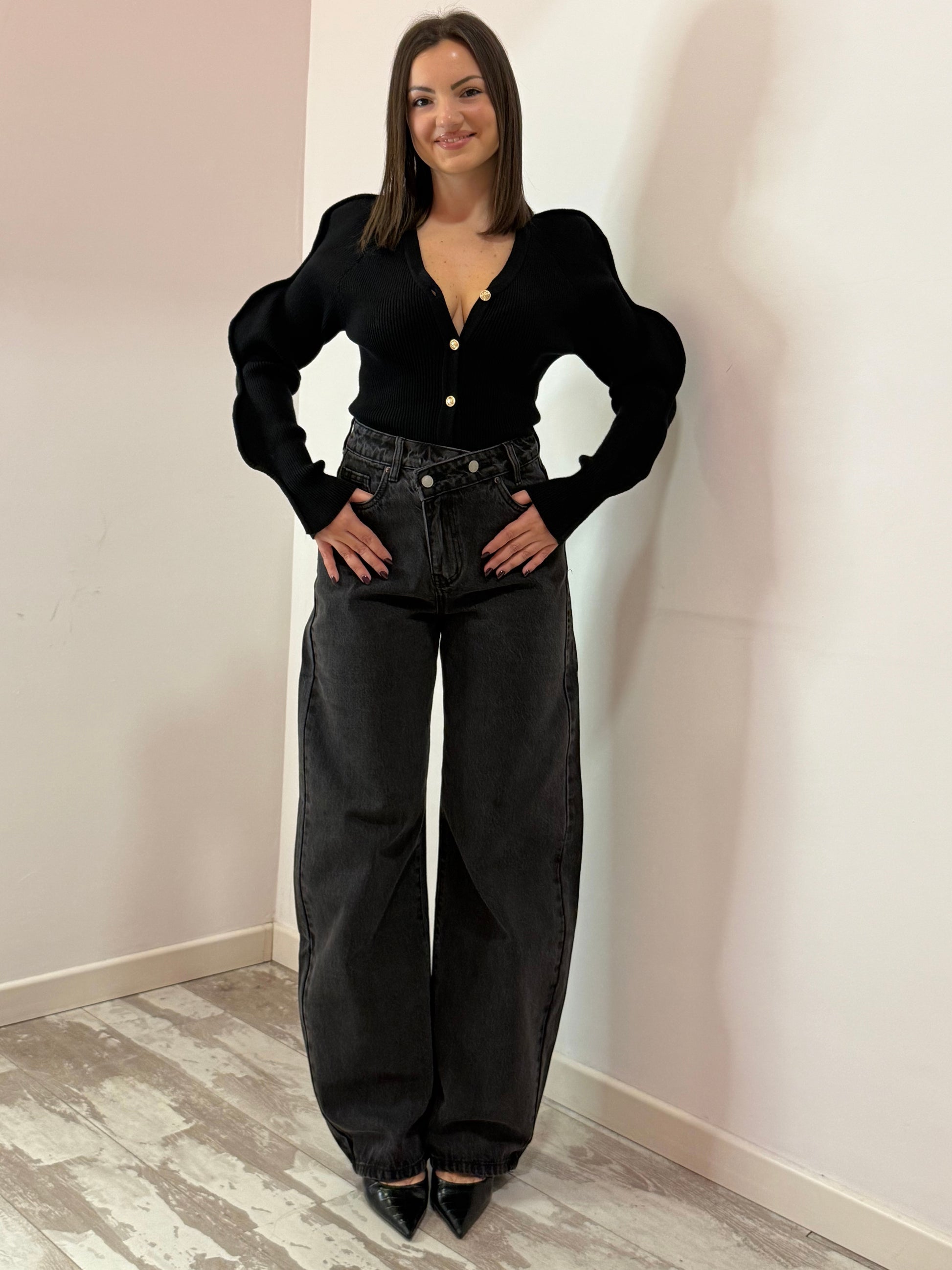 JEANS MODELLO BALLOON CON ABBOTTONATURATRASVERSALE , MODELLO POCO ELASTICO , VESTE REGOLARE , LA MODELLA INDOSSA S