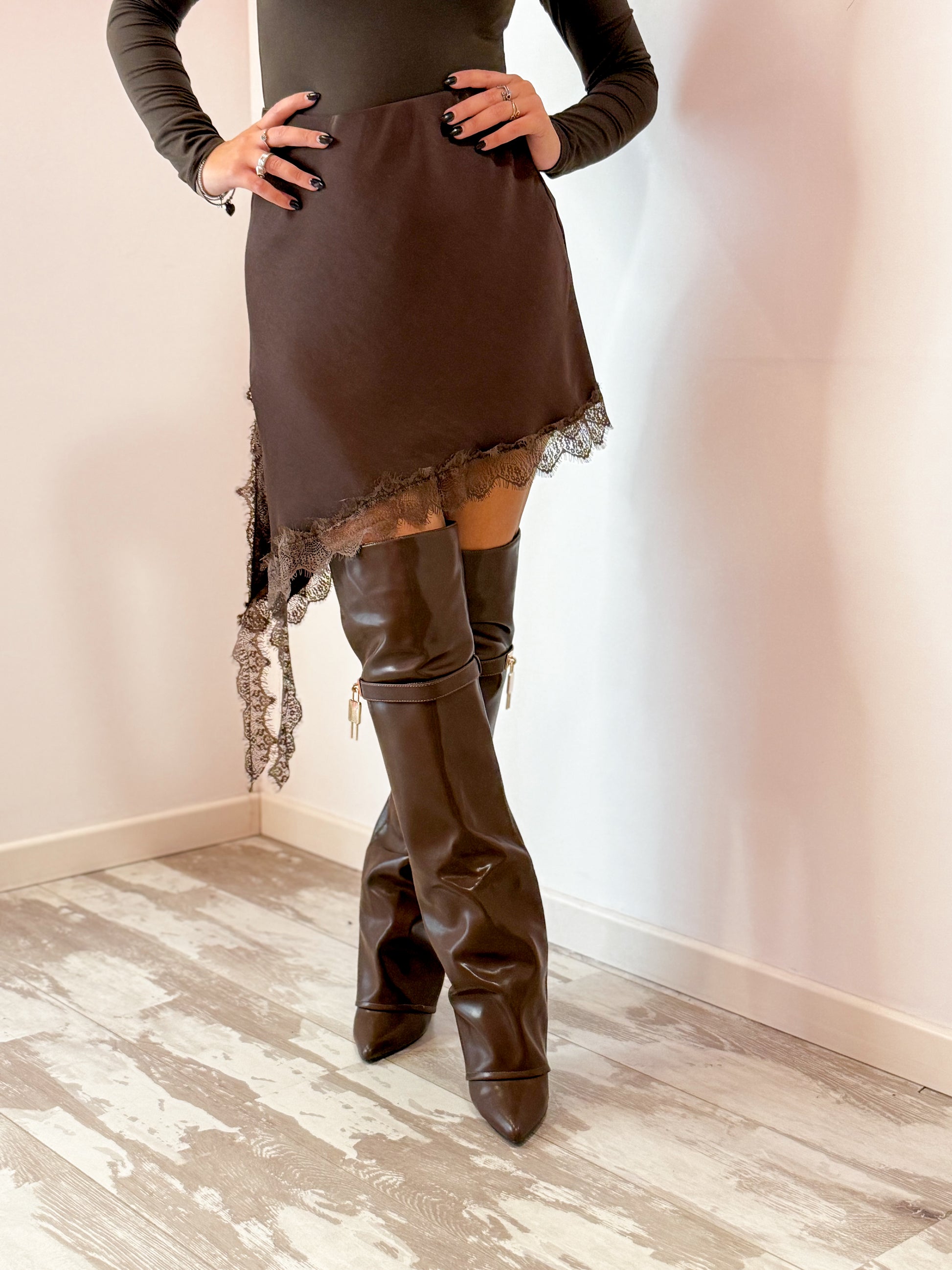 MINIGONNA SATIN , CON TAGLIO TRASVERSALE E PIZZO SULL'ORLO , TAGLIA UNICA MOLLA IN VITA , ELASTICA