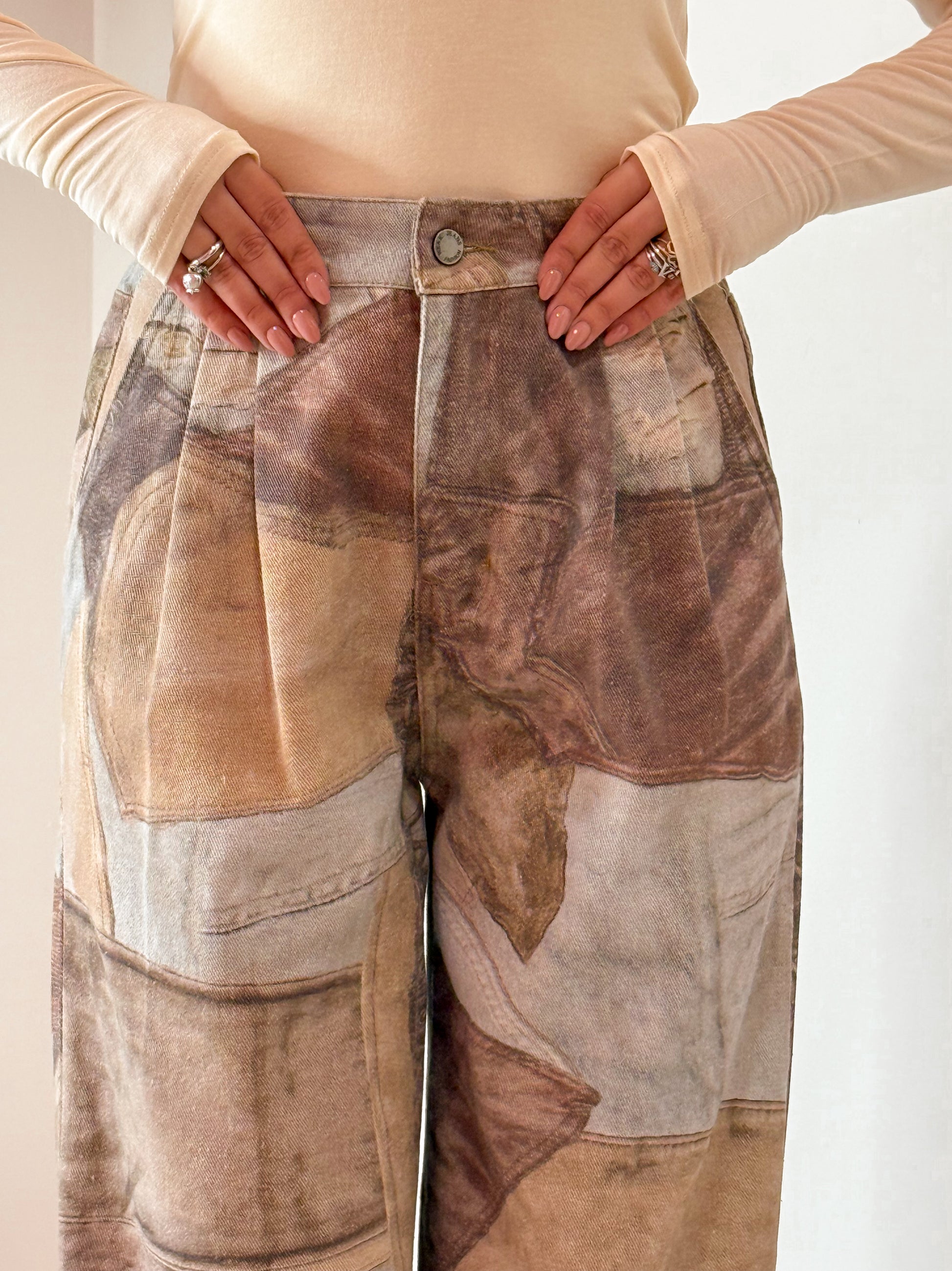 PANTALONE MODELLO PALAZZO DAI COLORI VINTAGE , CHIUSURA CON BOTTONE E ZIP AVANTI E MO9LLA SUL RETRO , TAGLIA UNICA VESTE FINO L