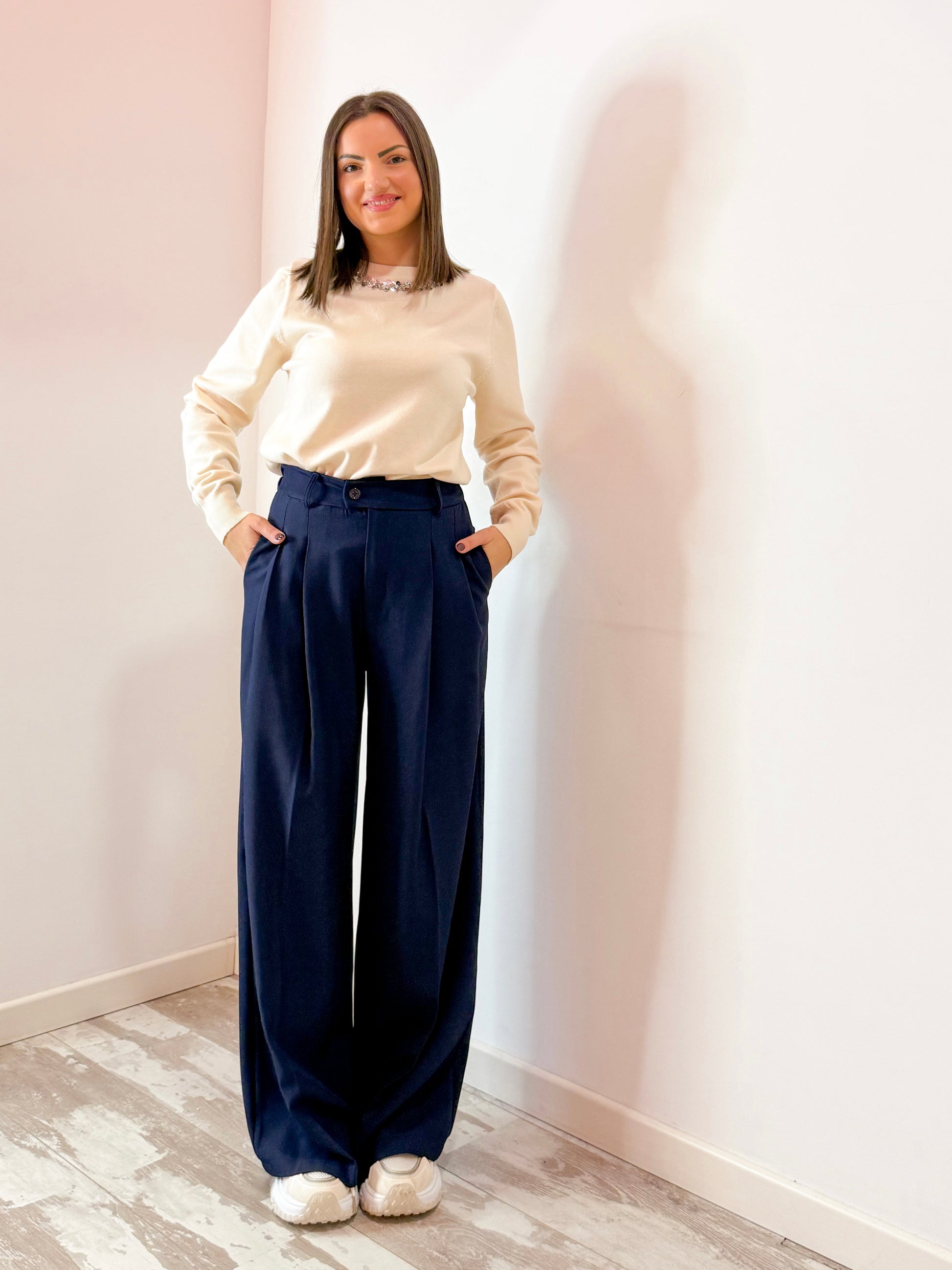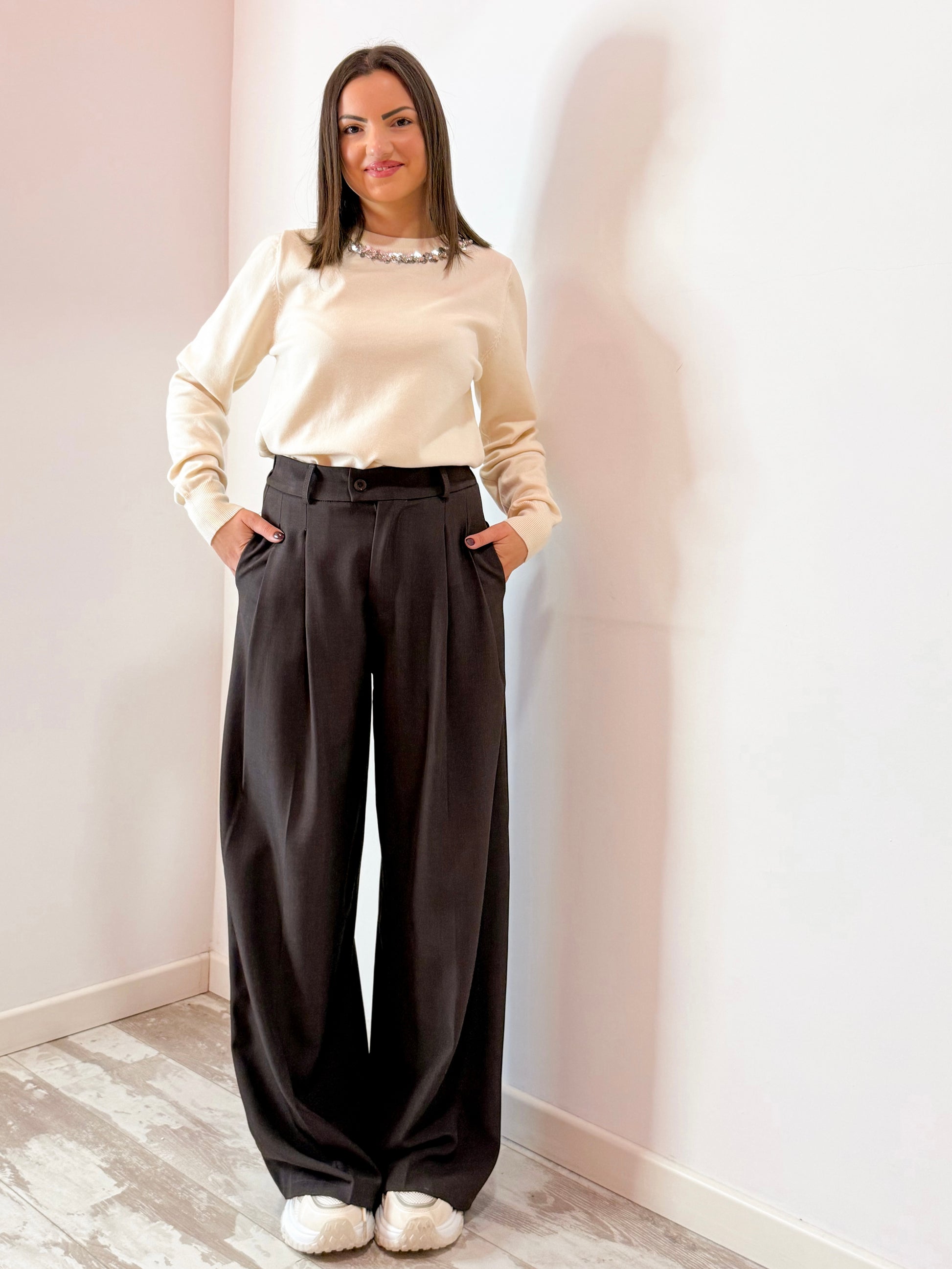 PANTALONE PALAZZO, CHIUSURA CN BOTTONE E ZIP AVANTI , MOLLA SUL RETRO E FINTE TASCHE, TAGLIA UNICA , VESTE FINO L