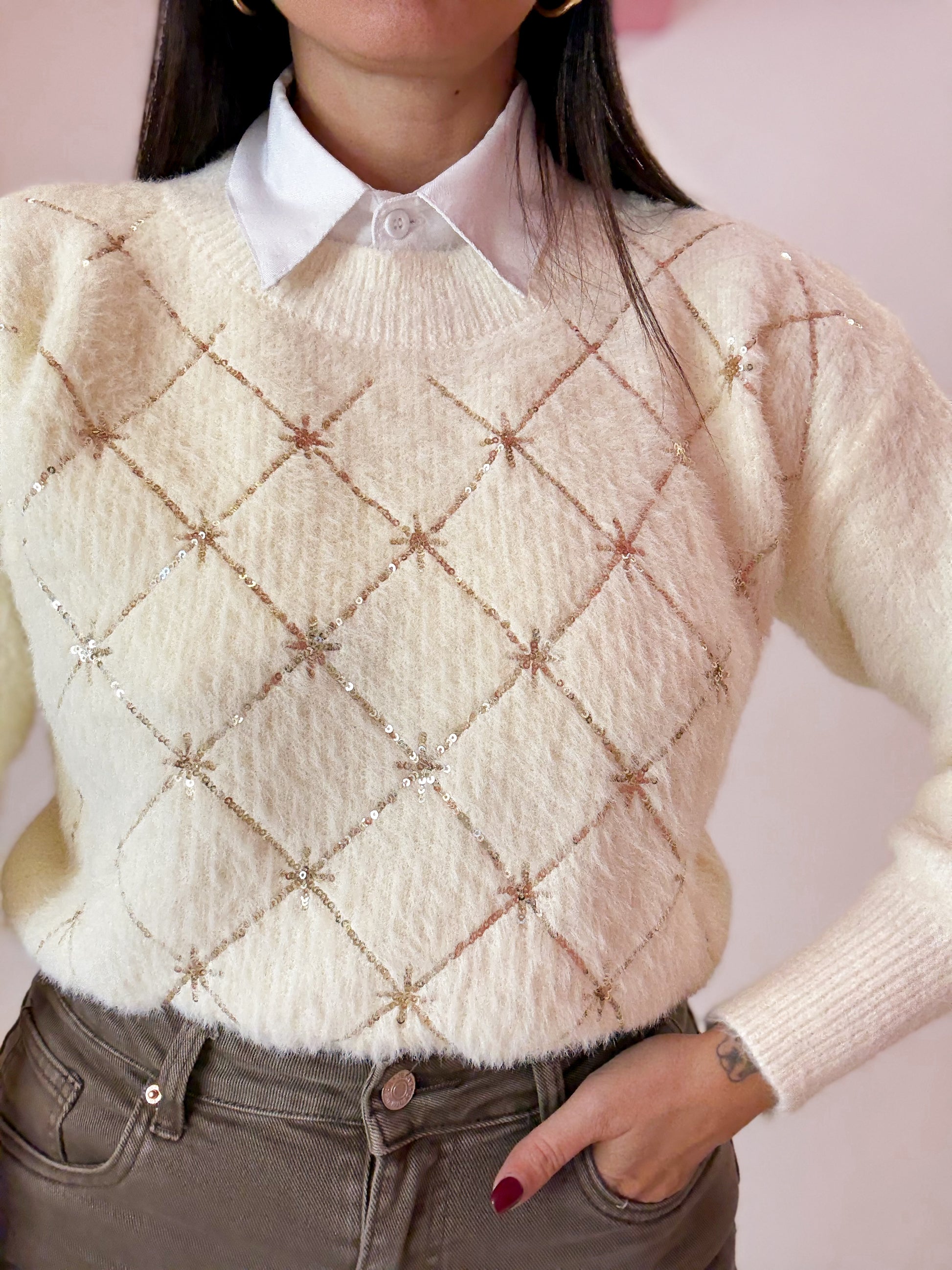 PULL PELOSETTO CON GIROCOLLO , IMPREZIOSITO DA PAILLETTES ORO , LUNGHEZZA BASIC , TAGLIA UNICA