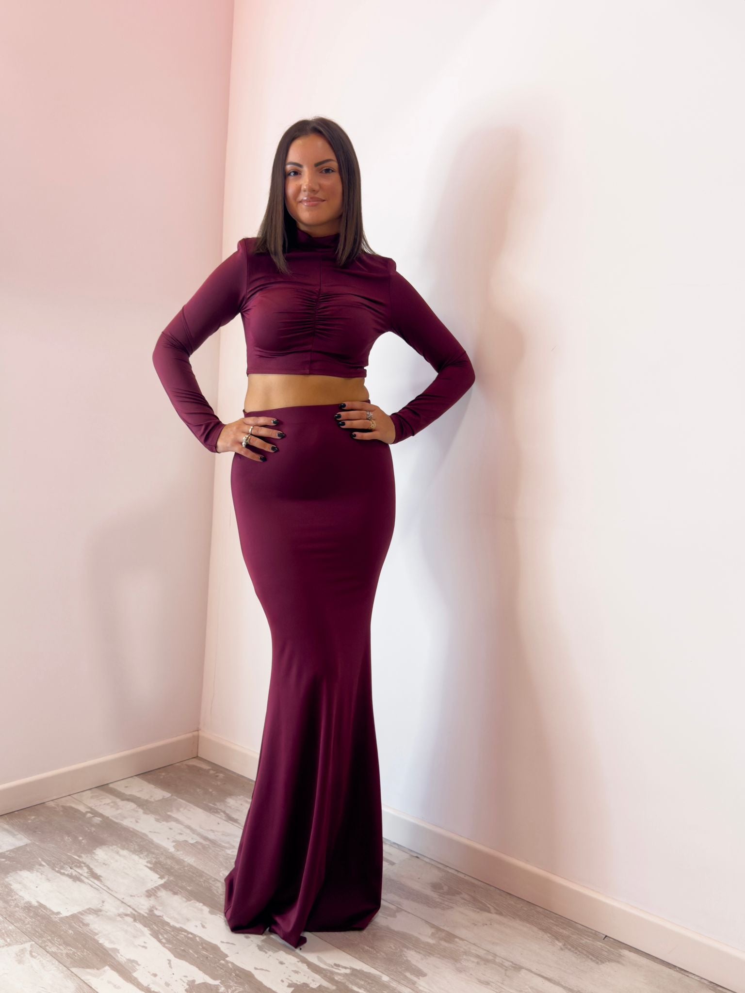SET COMPOSTO DA MAGLIETTINA CROP E GONNA A SIRENA , ENTRAMBI I PEZZI PORTANO LA DRAPPEGGIATURA PER ESALTARE LE FORME .