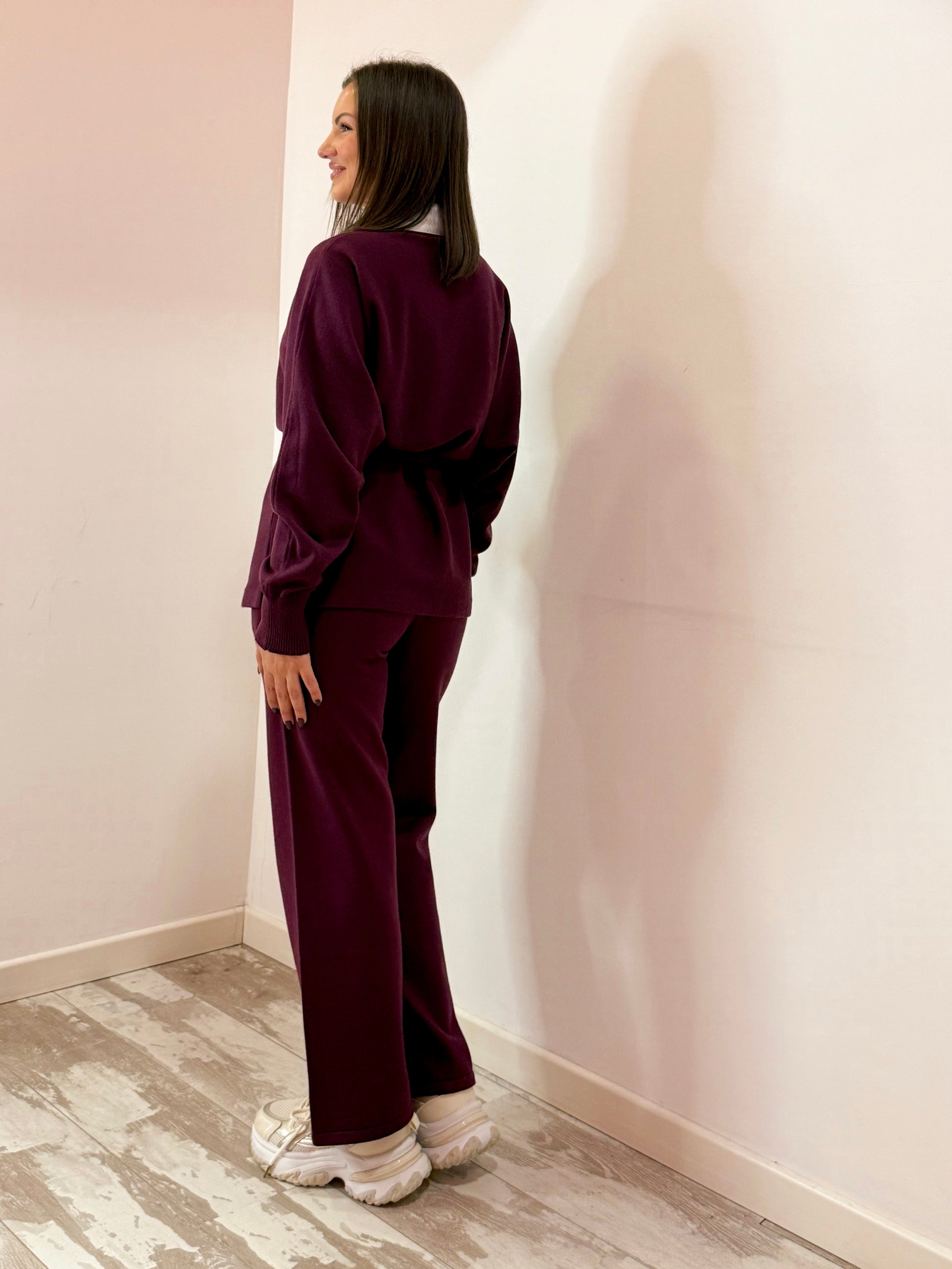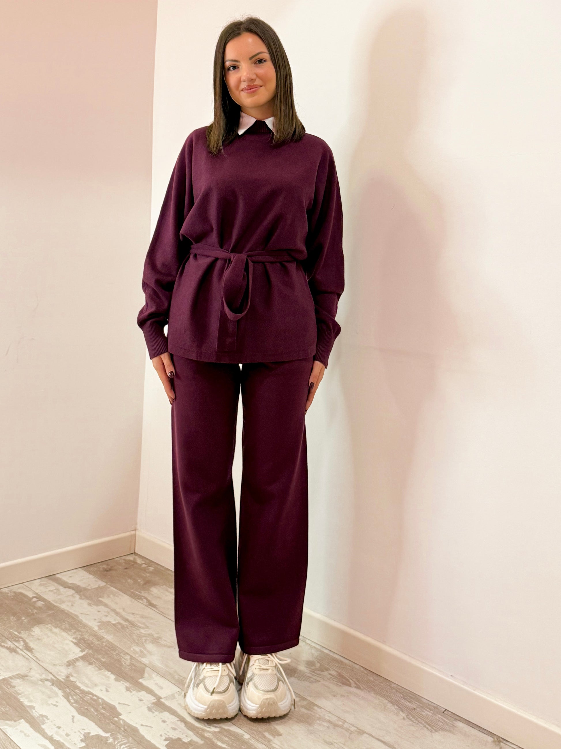 SET IN LANA RASATA COMPOSTO DA MAGLIA DAL TAGLIO MORBIDO E LACCETTO PER SEGNARE IL PUNTO VITA , E PANTALONE PALAZZO CON MOLLA IN VITA