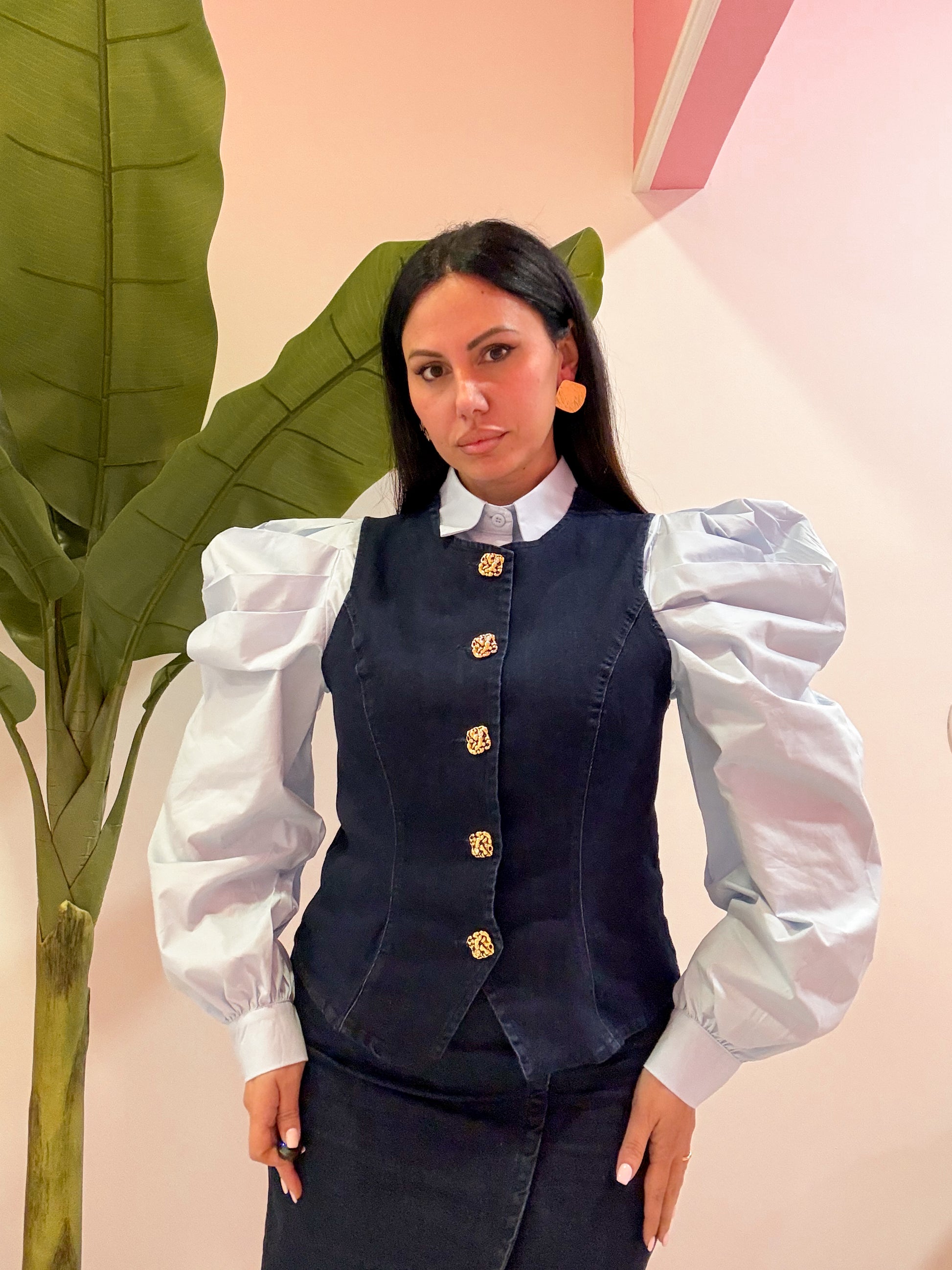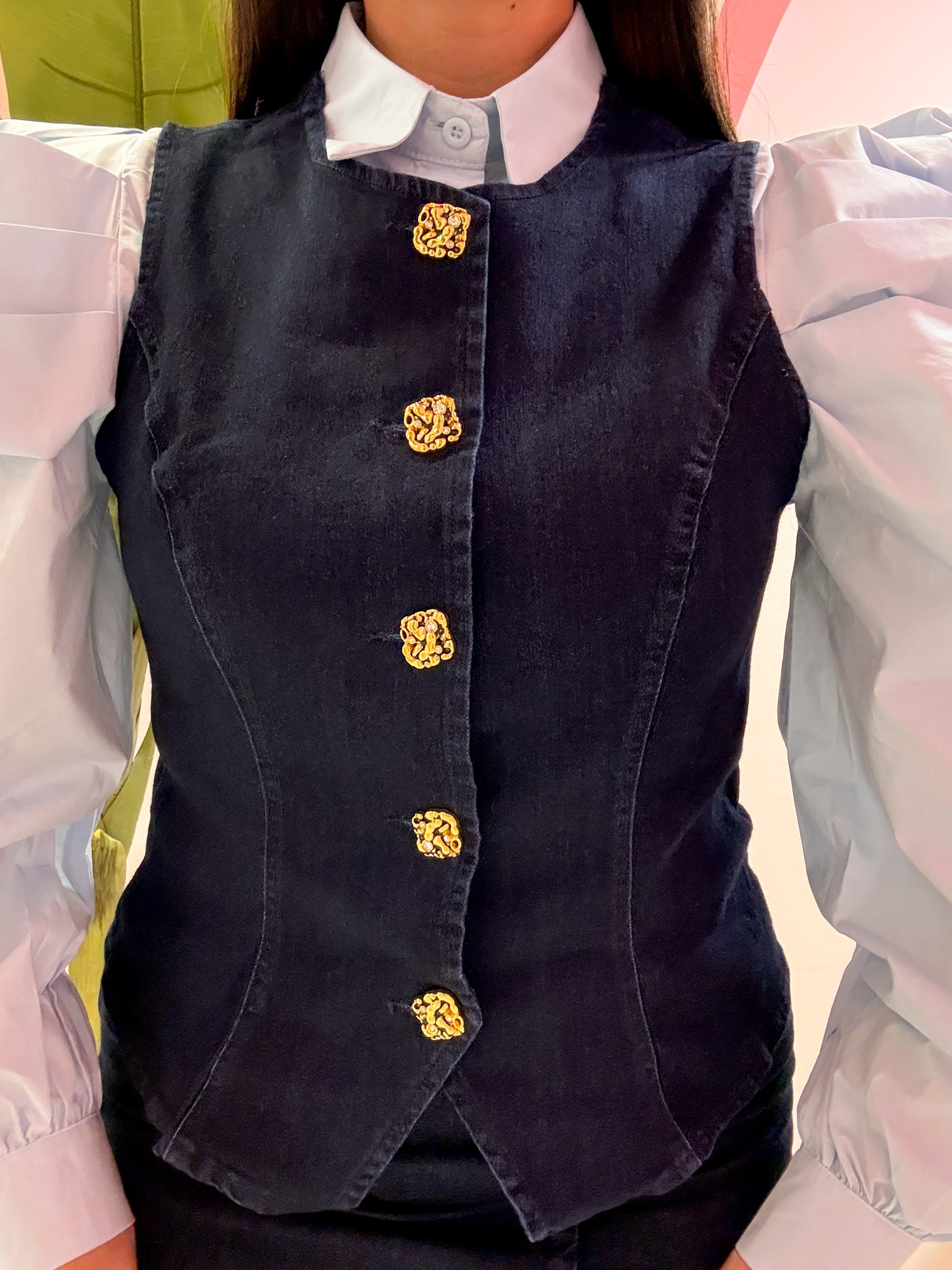 SET BLU JEANS COMPOSTO DA TOP A GIRO CON BOTTONI COLOR ORO