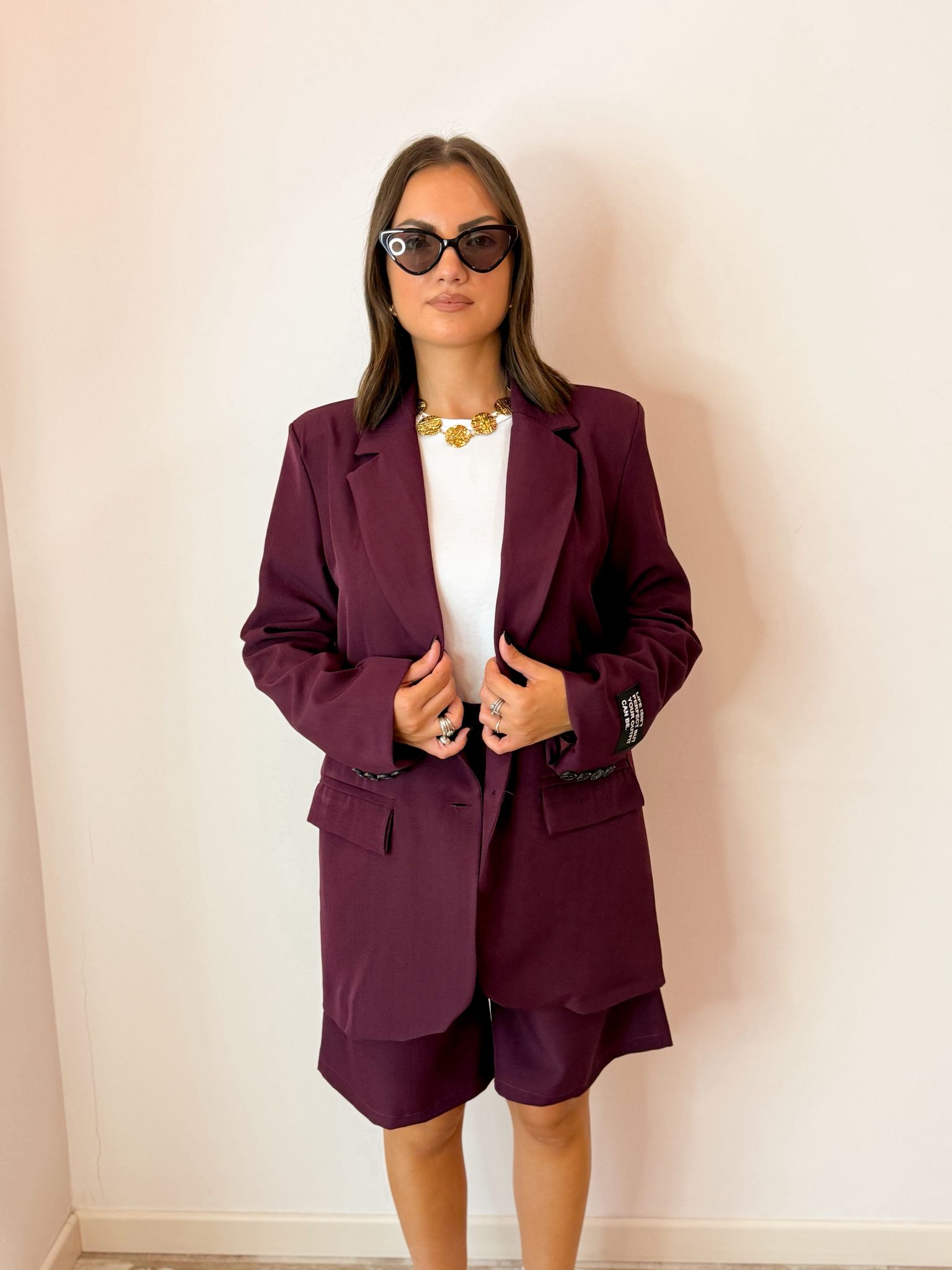 composto da giacca over con finte tasche e una piccola targhetta sulla manica.