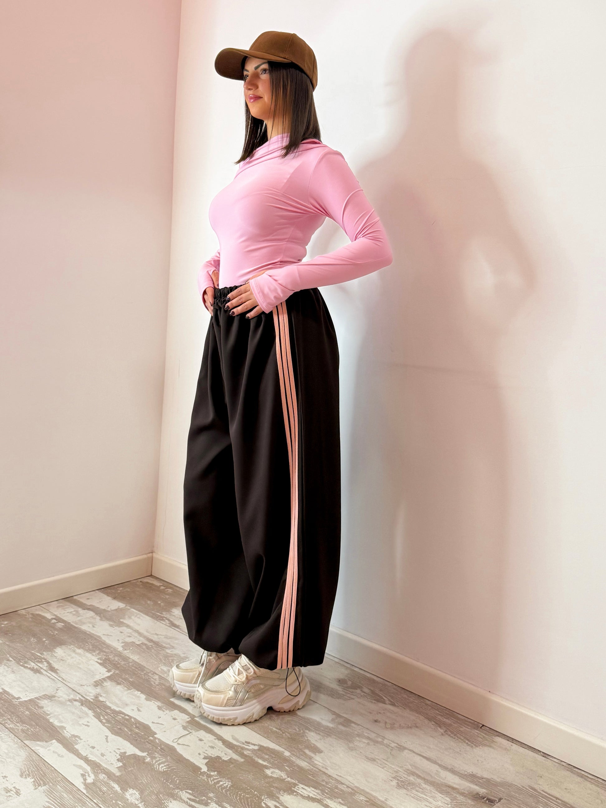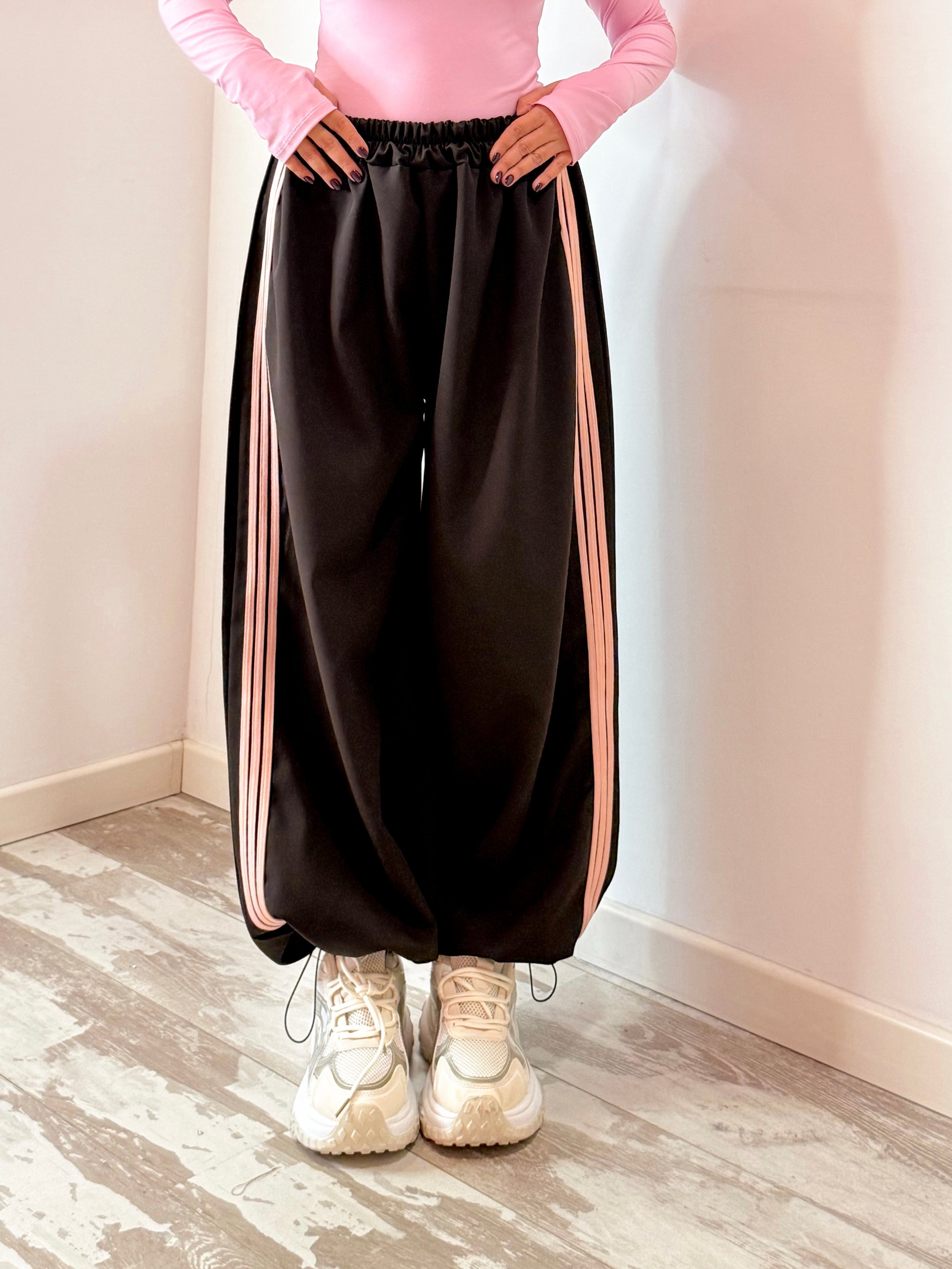 PANTALONE DI TUTA , CON MOLLA IN VITA , BANDE ROSA LATERALI E COULISSE SUL FONDO COSI DA POTER ESSERE INDOSSATO O STRETTO O A PALAZZO