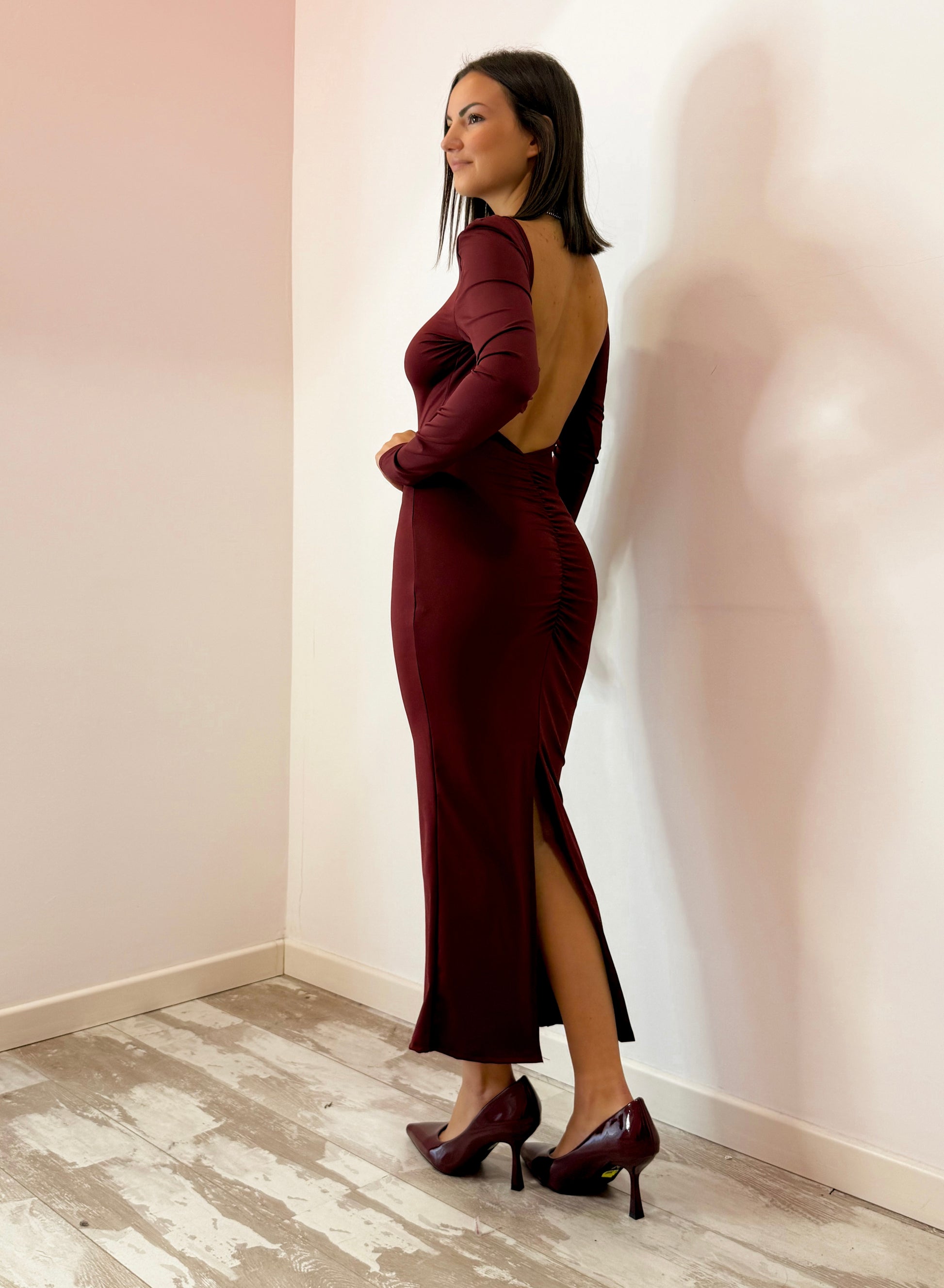TUBINO IN TESSUTO TIPO LICRA, LUNGHEZZA MIDI , SCOLLATO SUL RETRO ED EFFETTO DRAPPEGGIATO SUL SEDERE , TAGLIA UNICA VESTE FINO L
